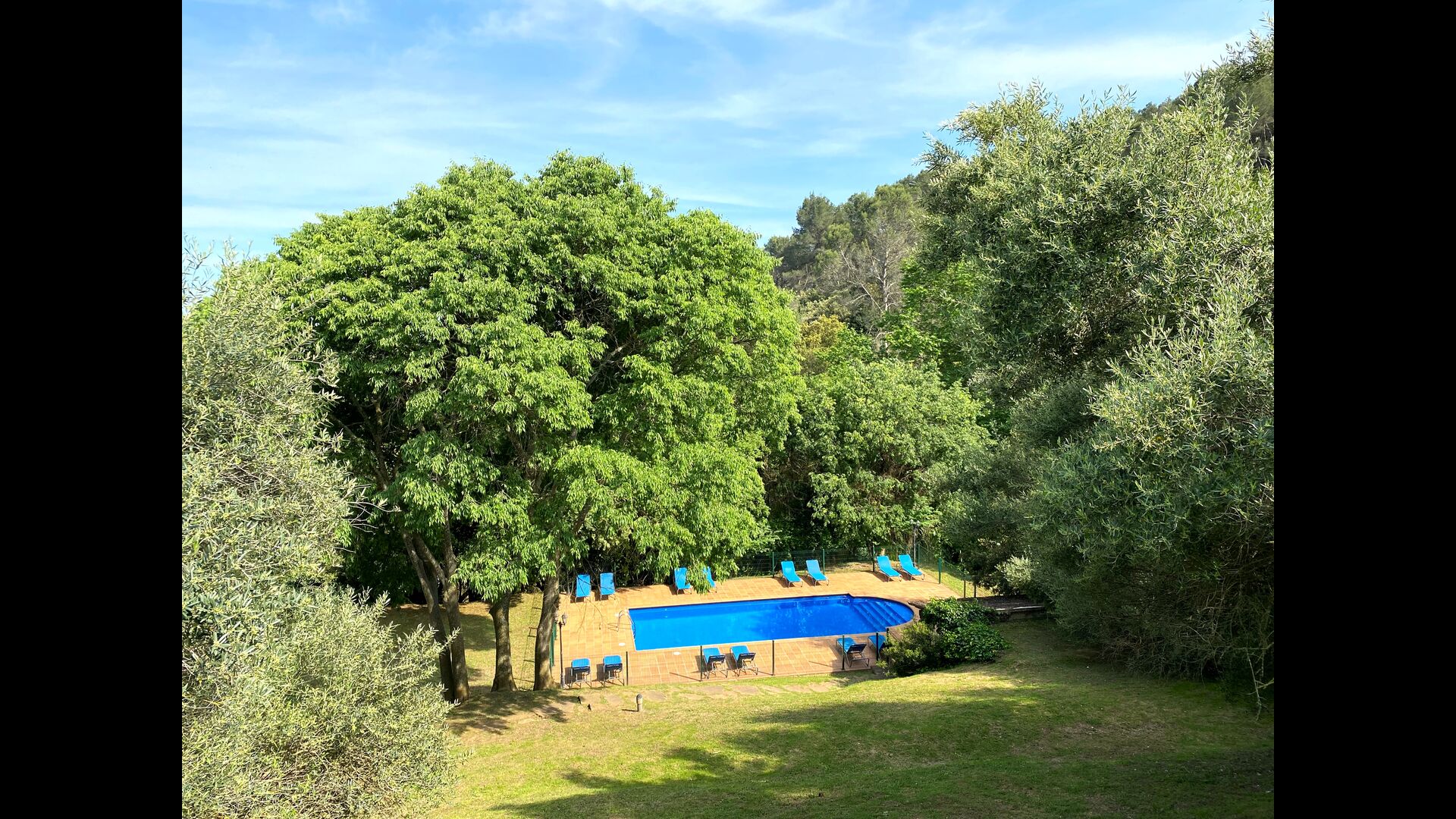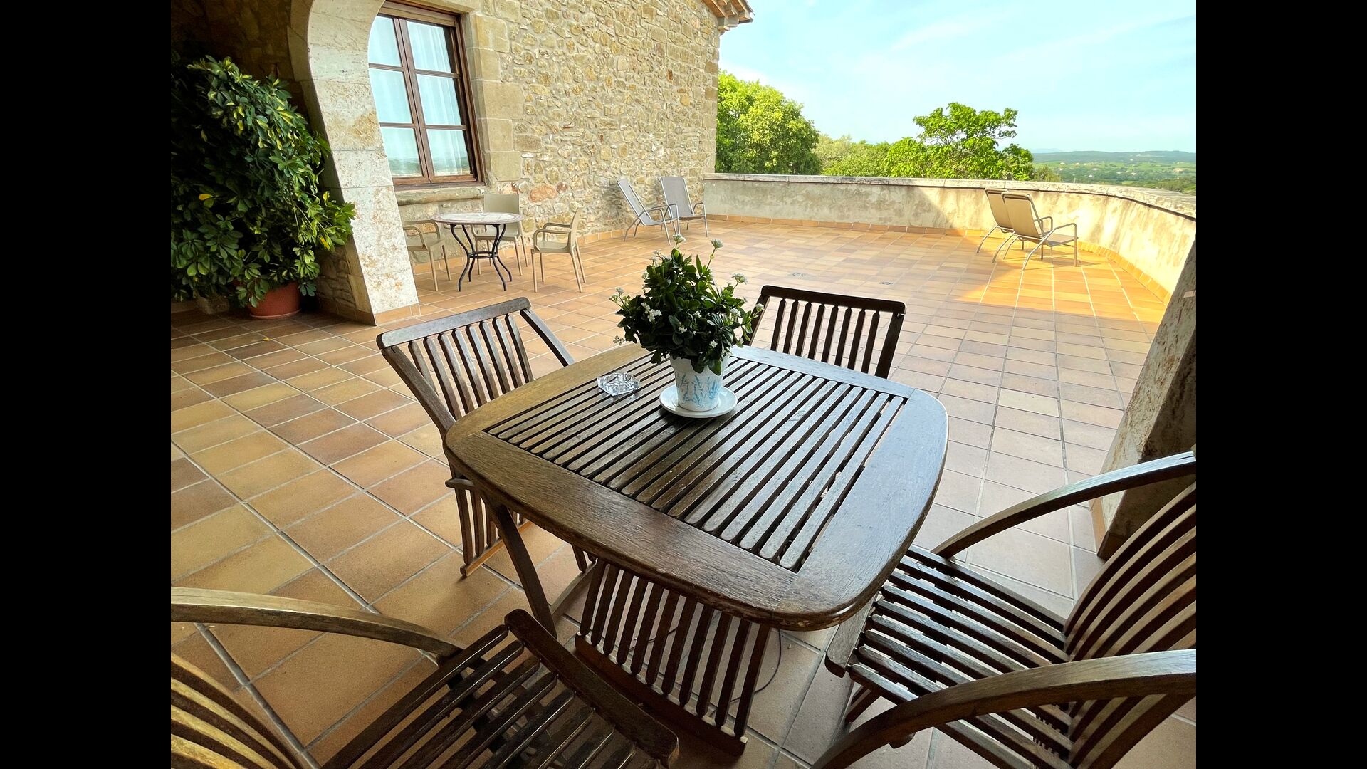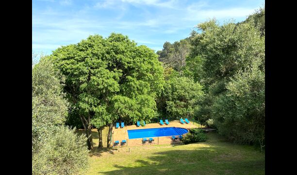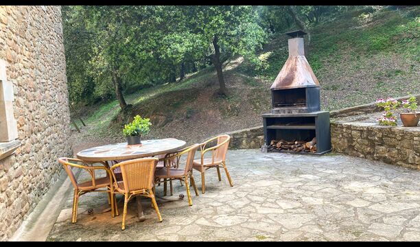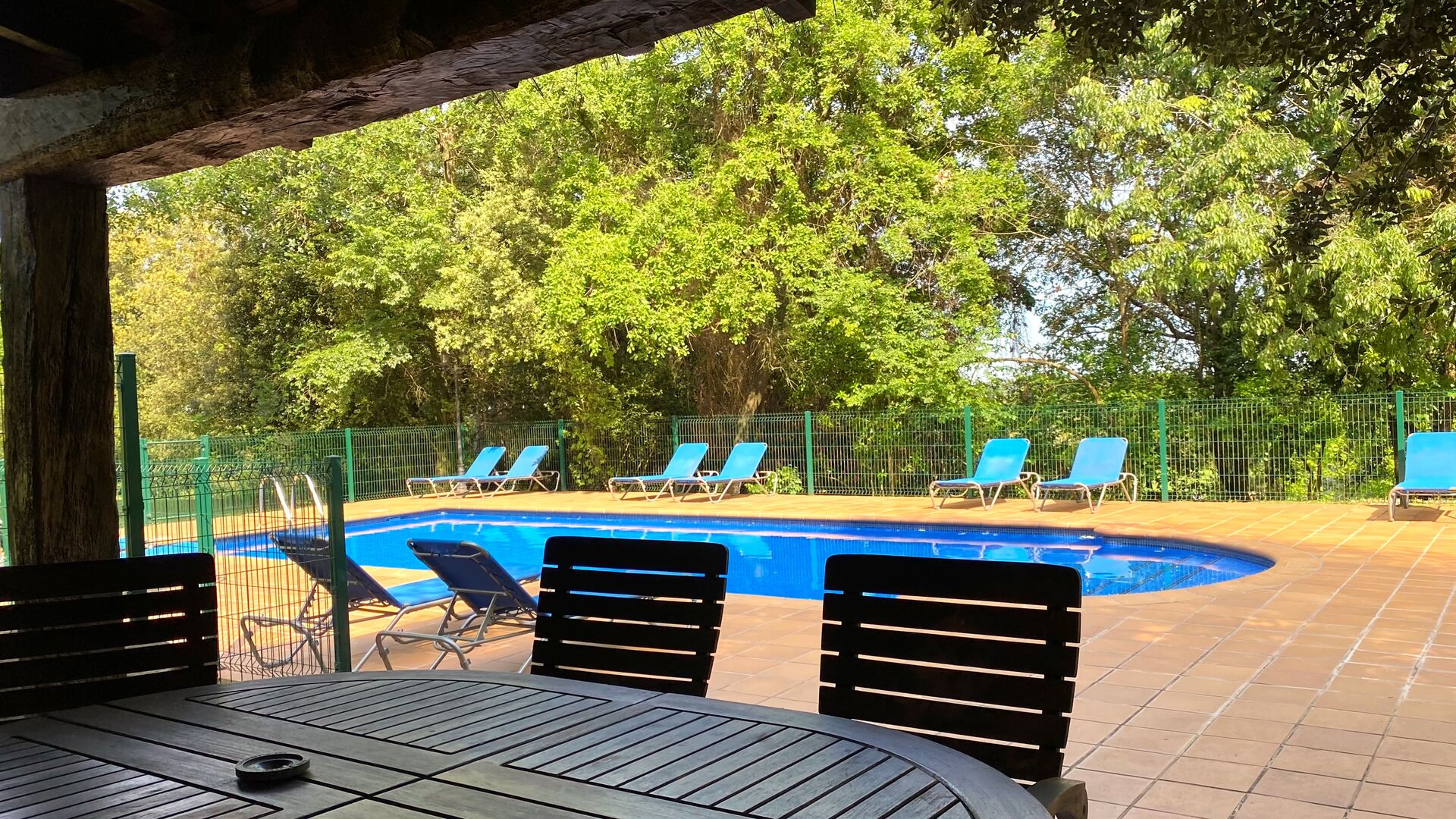 Der Poolbereich liegt in fantastischer grüner Umgebung unterhalb des Hauses. Es ist fast in einen Olivenwäldchen gelegen mit vielen Sonnenliegen und eine überdachte Terrasse. Auch die Orangen und Mandarinen tragen zum Gefühl des Alleinseins in der katalanischen Natur bei. Für die Kinder hat der Garten eine kleine Fußballfeld mit Toren. Das Haus hat drei große Terrassen mit Sitzgelegenheiten und Liegestühlen. Es gibt mehrere Grillplätze.