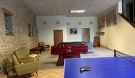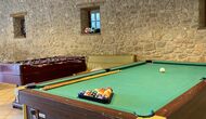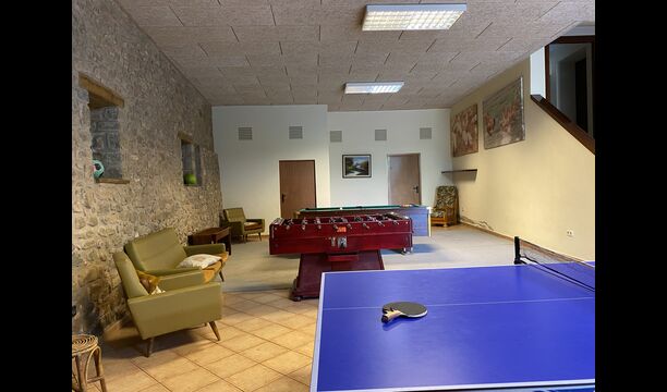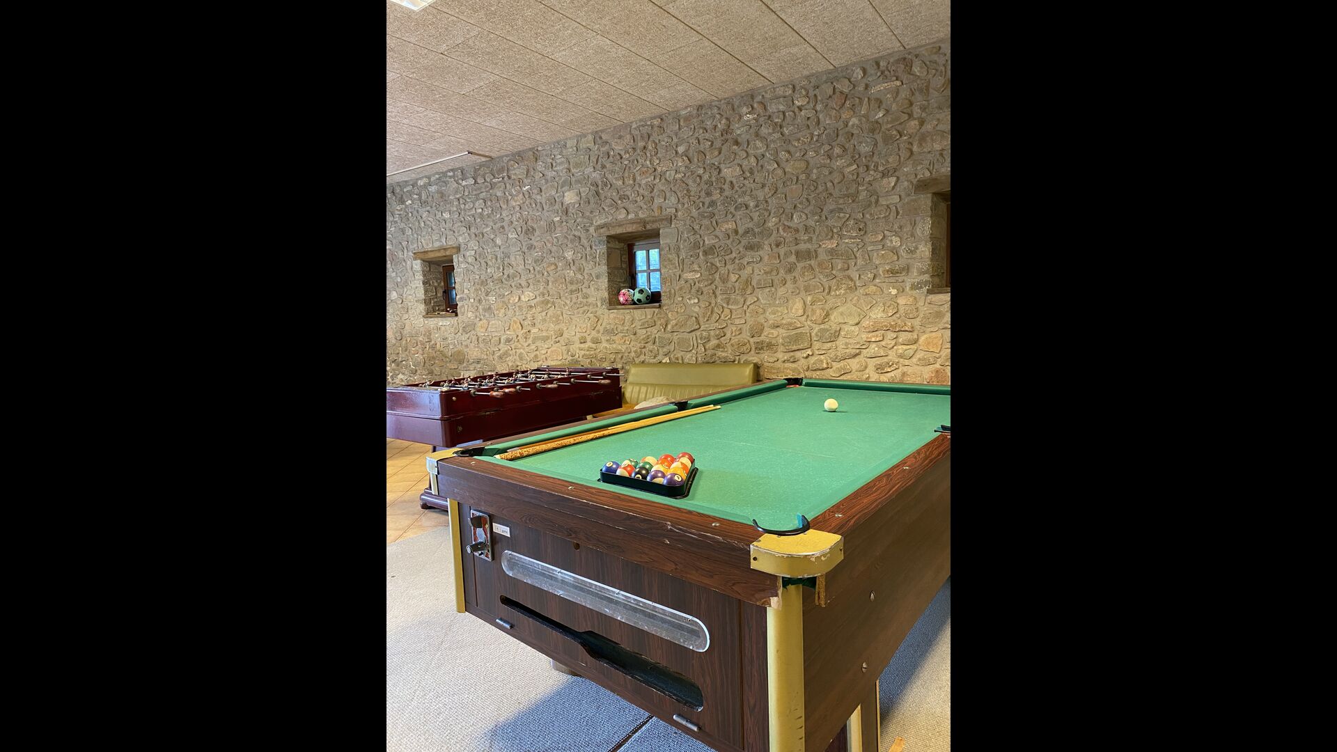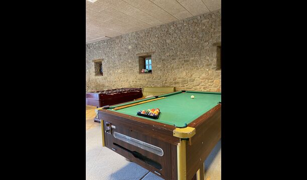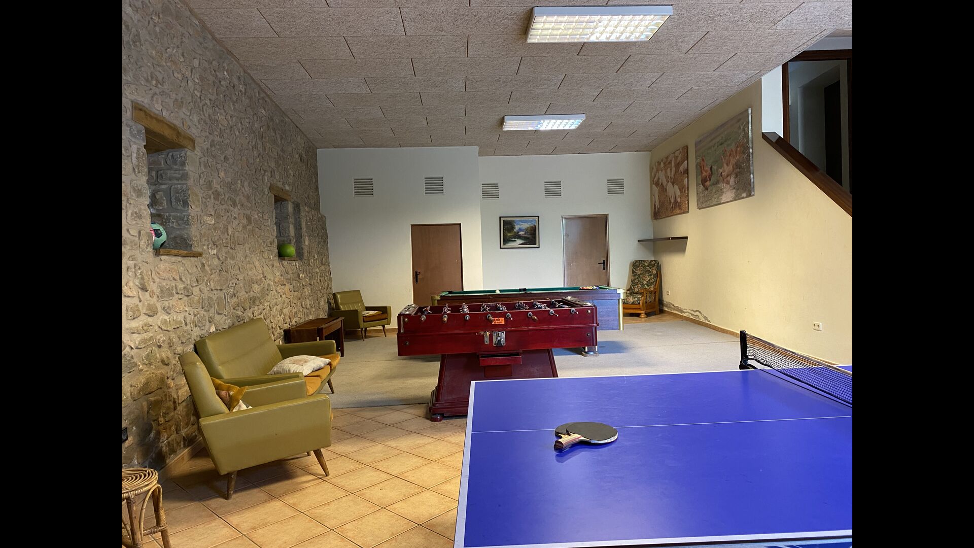 Unten gibt es einen Freizeitraum mit Tischtennis, Billard und Tischfußball und ein Depot mit 3 Waschmaschinen und 3 Kinderbetten und Hochstühle, die zu Verfügung stehen wenn nötig.