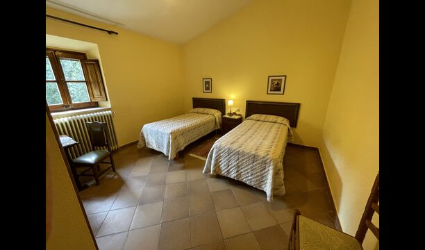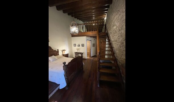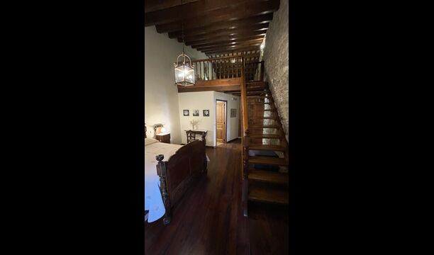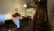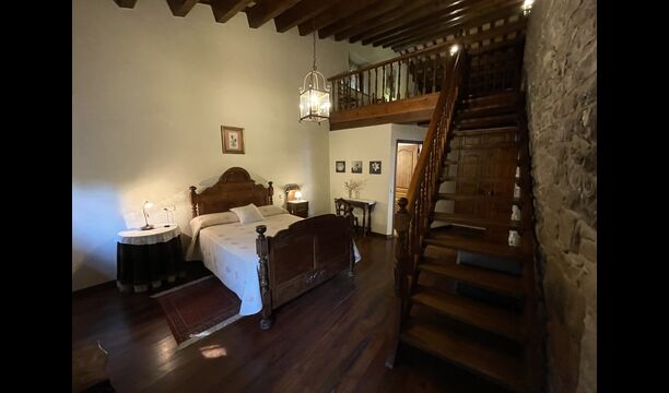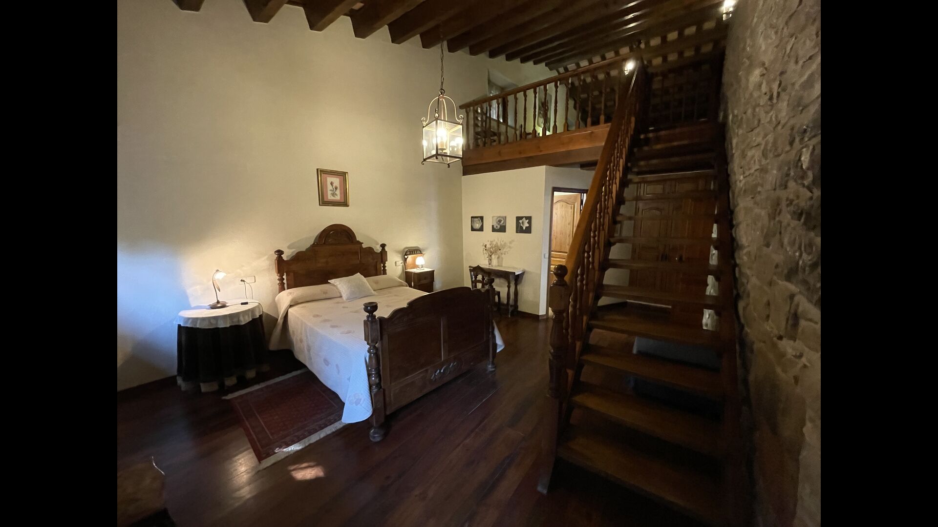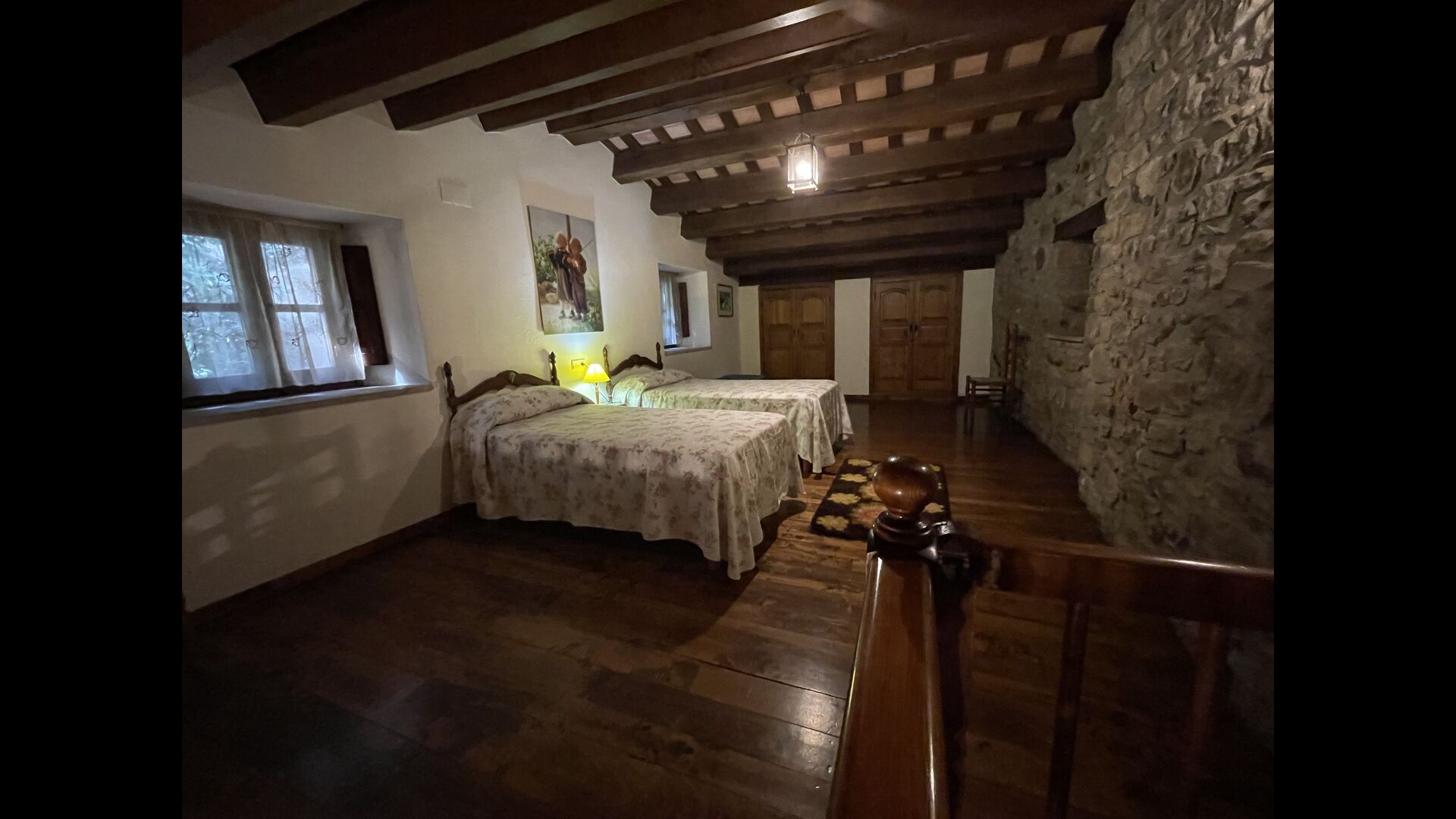 Vom Aufenthaltsraum gibt es Zugang zu einem Doppelzimmer mit eigenem Bad mit Badewanne. Auf der anderen Seite der Aufenthaltsraum liegt noch ein Doppelzimmer mit eigenem Bad mit Dusche. Weiter ein sehr großes Schlafzimmer mit einem Doppelbett und zwei Einzelbetten und eigenem Bad mit Dusche. Es gibt ein viertes Doppelzimmer mit Bad. Schließlich gibt es einen sehr spektakulären Raum mit sehr hoher Decke. Unten gibt es ein Doppelbett und ein Bad und weiter eine Treppe nach einer Galerie mit zwei Einzelbetten.
