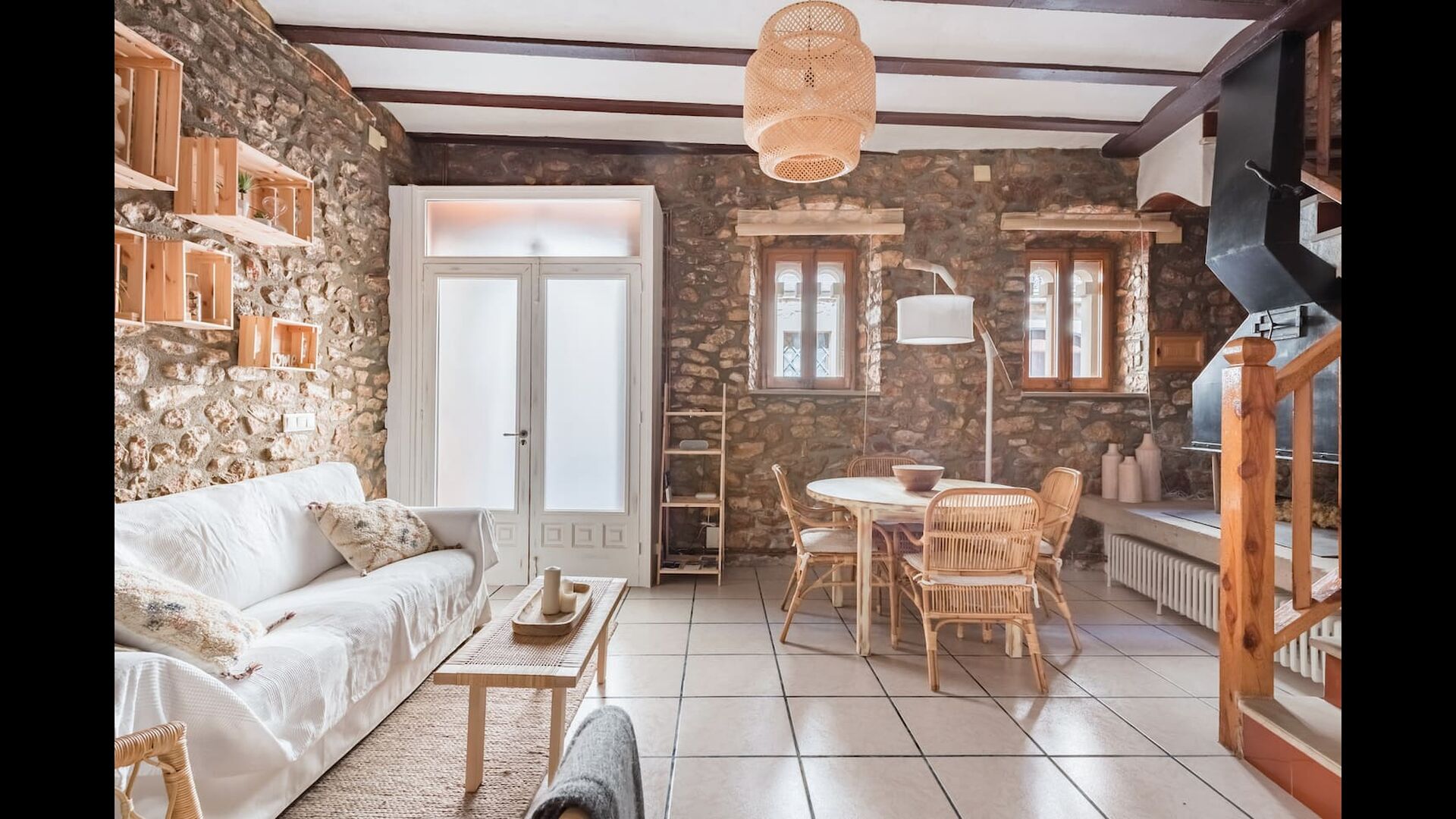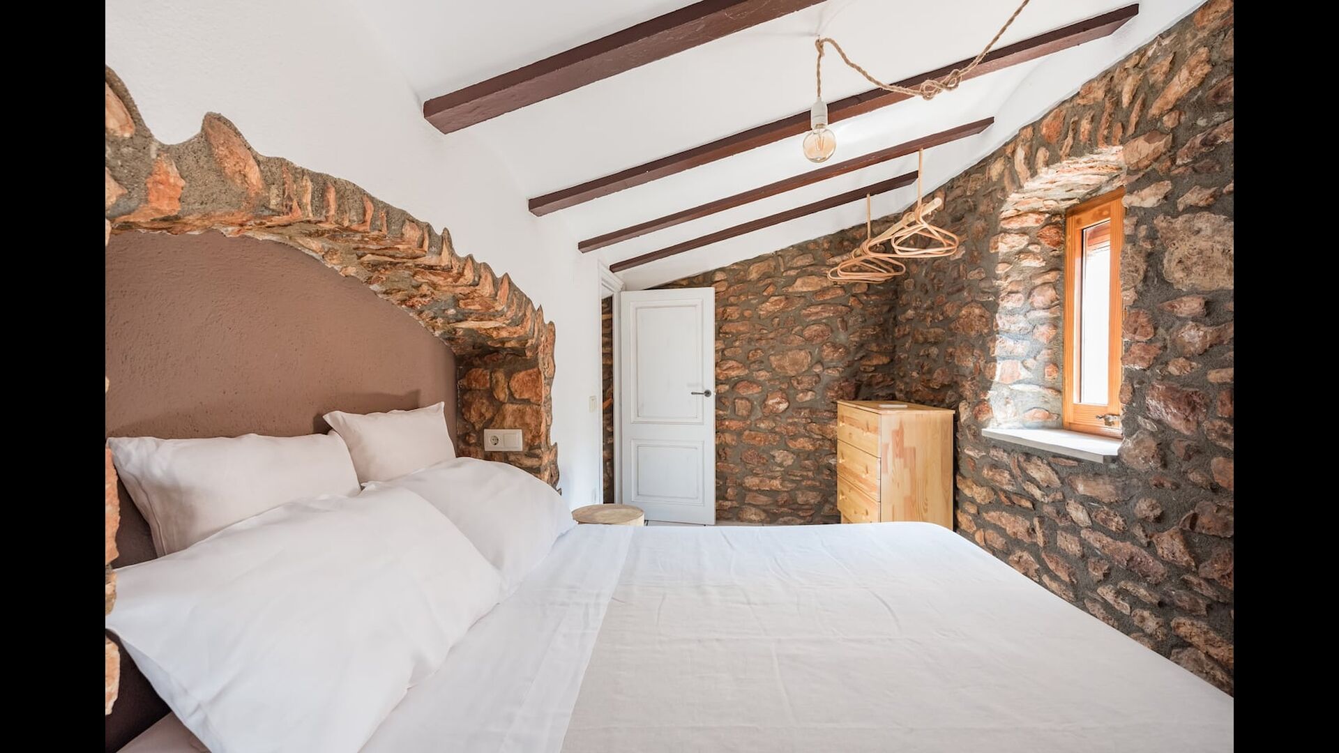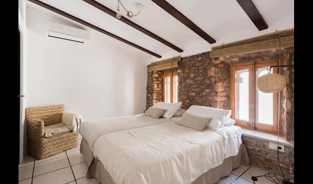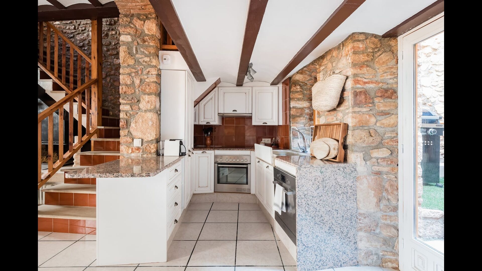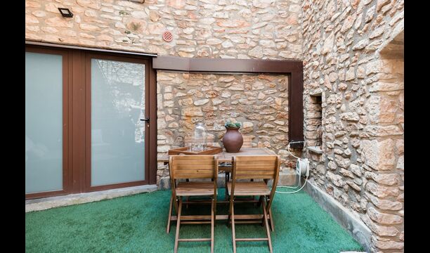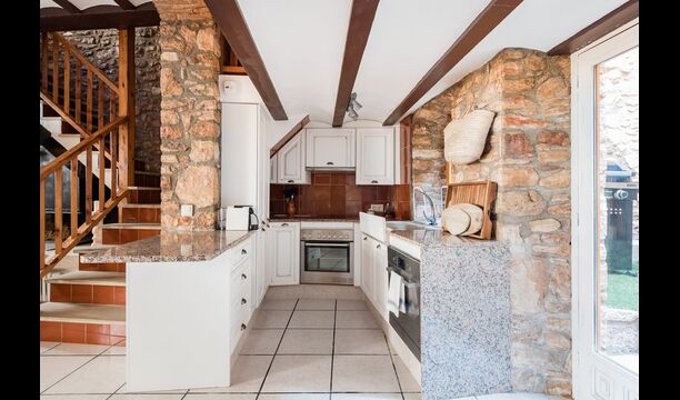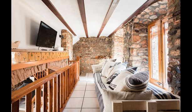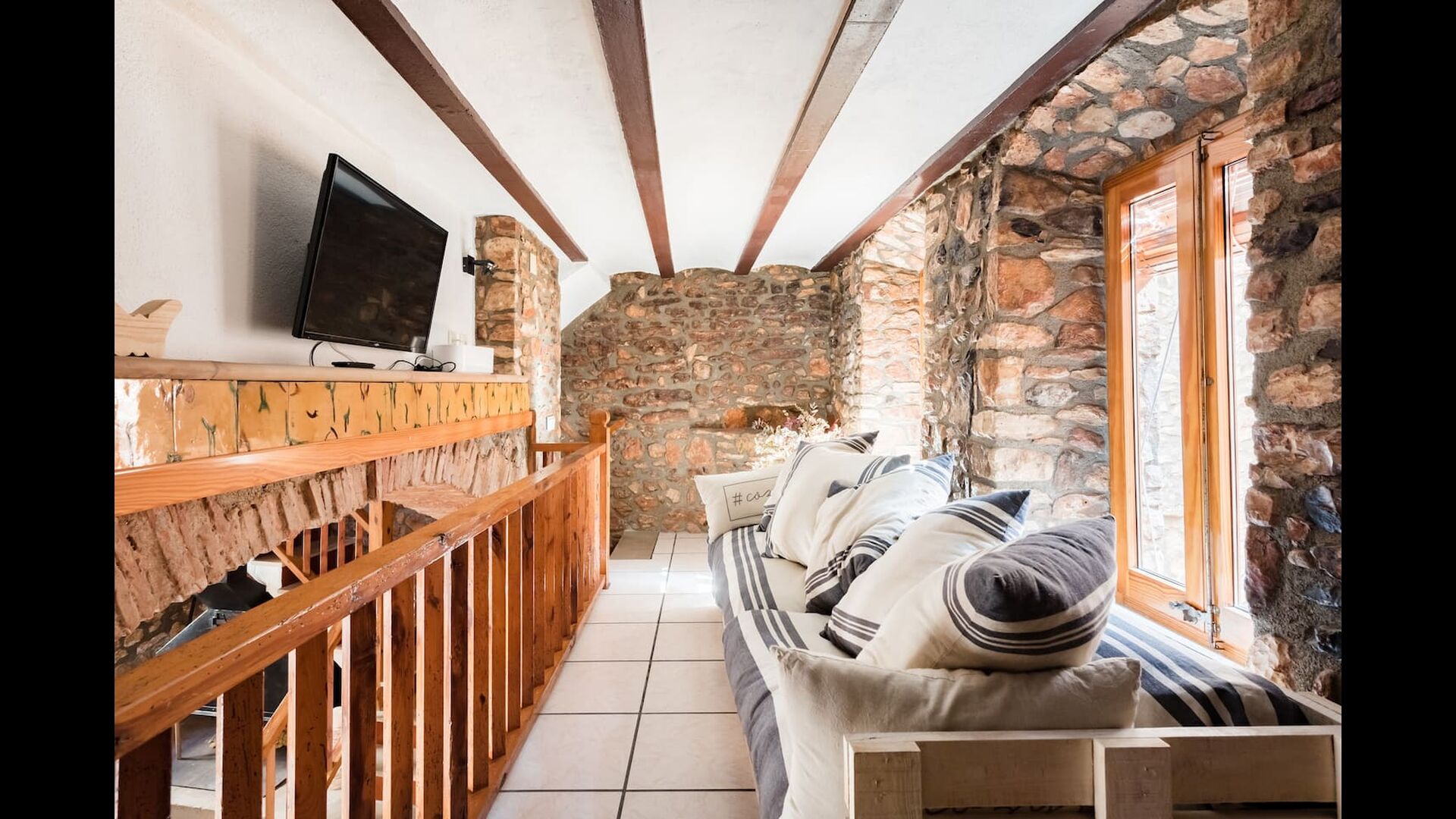 Die Wände der Wohnung sind komplett aus Stein gebaut. Im Erdgeschoss befindet sich das Wohnzimmer mit offener Küche. Vom Erdgeschoss führen Türen auf die Terrasse der Wohnung. Dort finden Sie auch eine kleine Toilette und ein Zwischengeschoss, das als TV-Raum umgebaut wurde. Oben, im Obergeschoss, gibt es zwei Doppelzimmer; eines mit einem Doppelbett und das andere mit 1 Etagenbett. Beide Zimmer besitzen ihre eigenen Badezimmer. Weniger als 100 Meter von der Wohnung entfernt befindet sich ein Parkplatz für Ihr Auto.