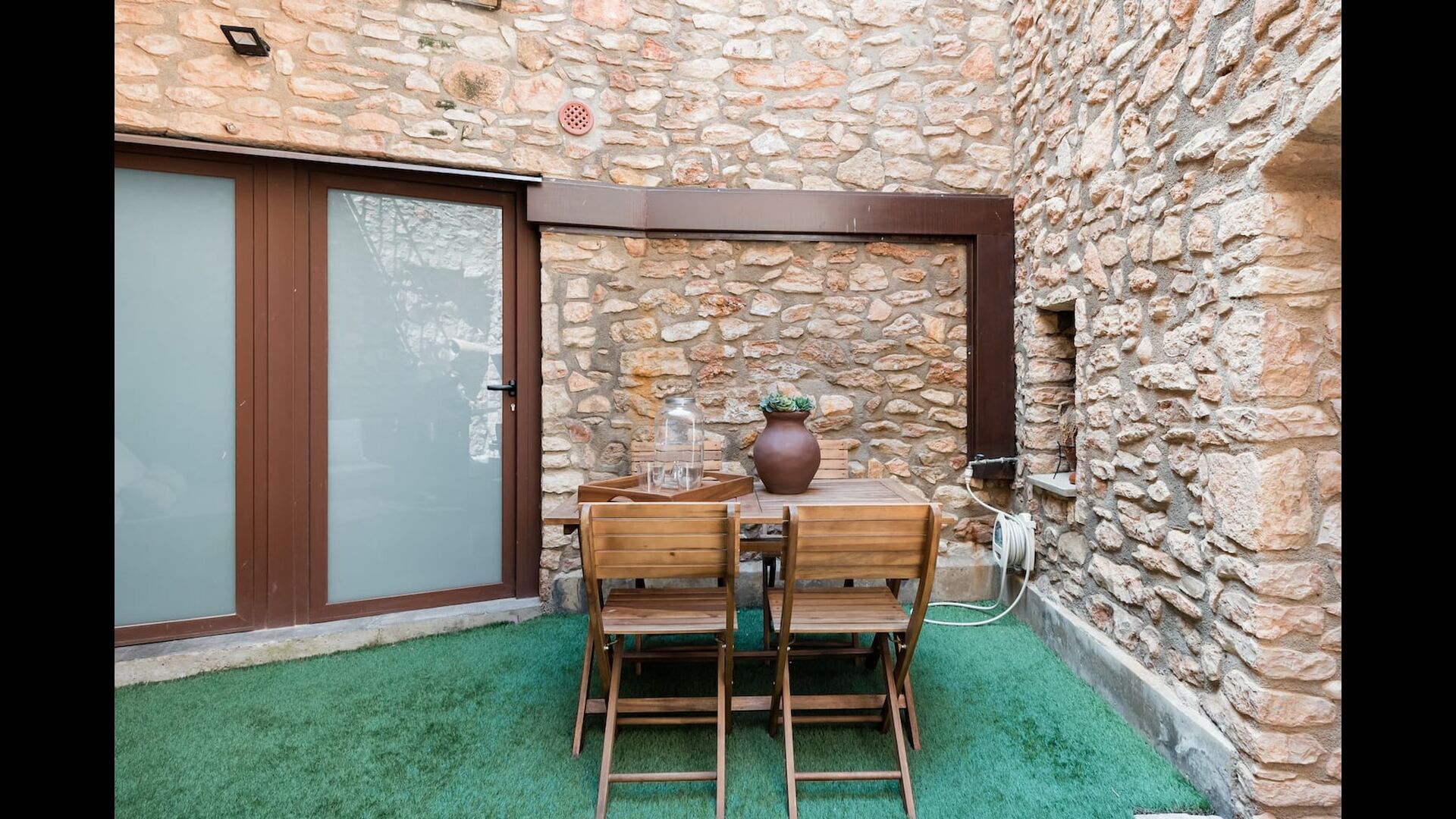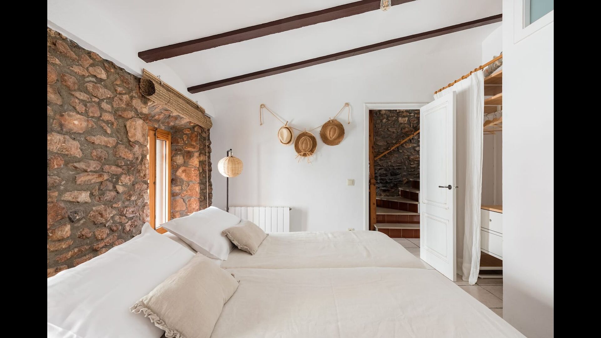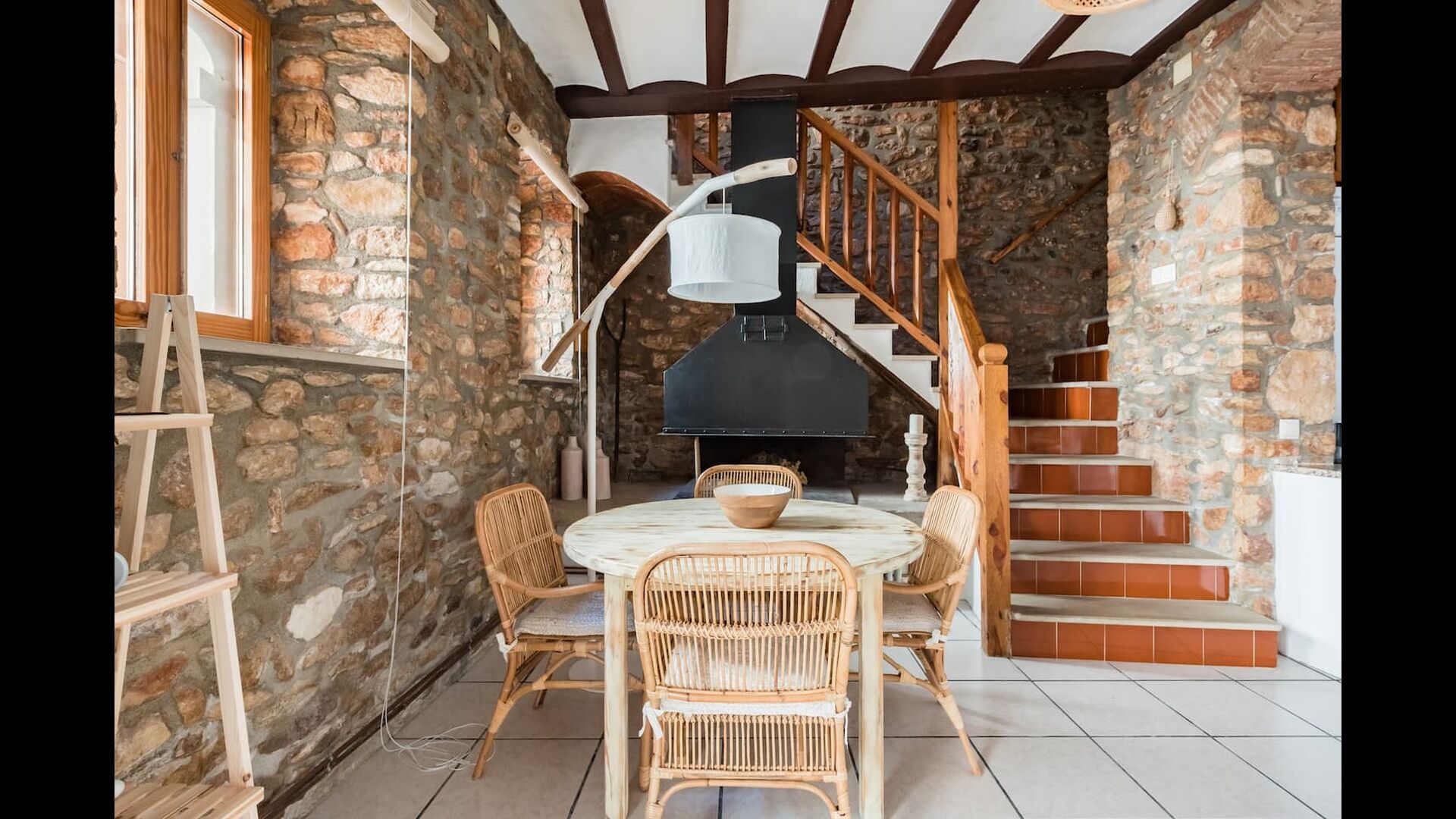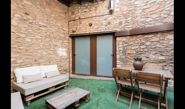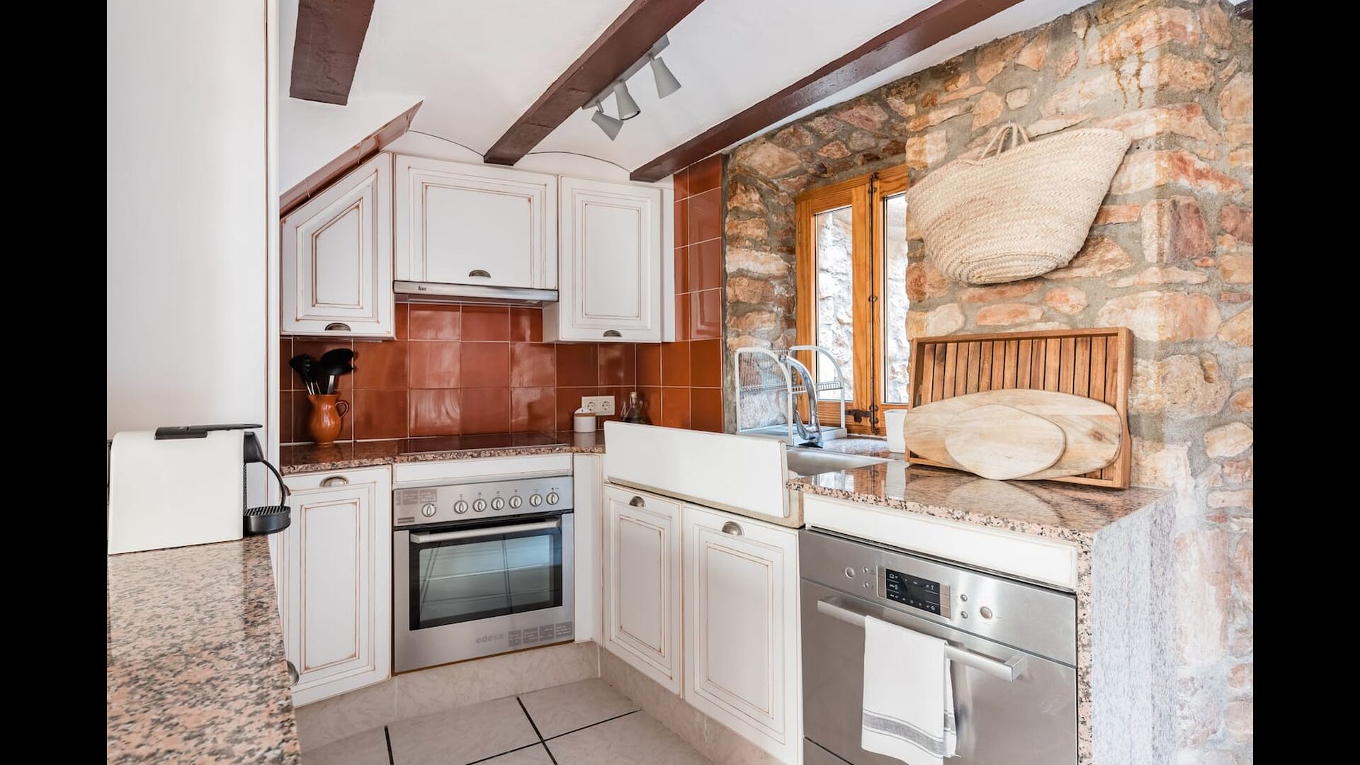 Die Wände der Wohnung sind komplett aus Stein gebaut. Im Erdgeschoss befindet sich das Wohnzimmer mit offener Küche. Vom Erdgeschoss führen Türen auf die Terrasse der Wohnung. Dort finden Sie auch eine kleine Toilette und ein Zwischengeschoss, das als TV-Raum umgebaut wurde. Oben, im Obergeschoss, gibt es zwei Doppelzimmer; eines mit einem Doppelbett und das andere mit 1 Etagenbett. Beide Zimmer besitzen ihre eigenen Badezimmer. Weniger als 100 Meter von der Wohnung entfernt befindet sich ein Parkplatz für Ihr Auto.