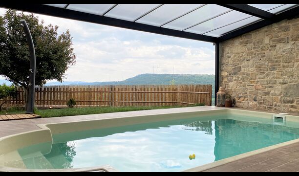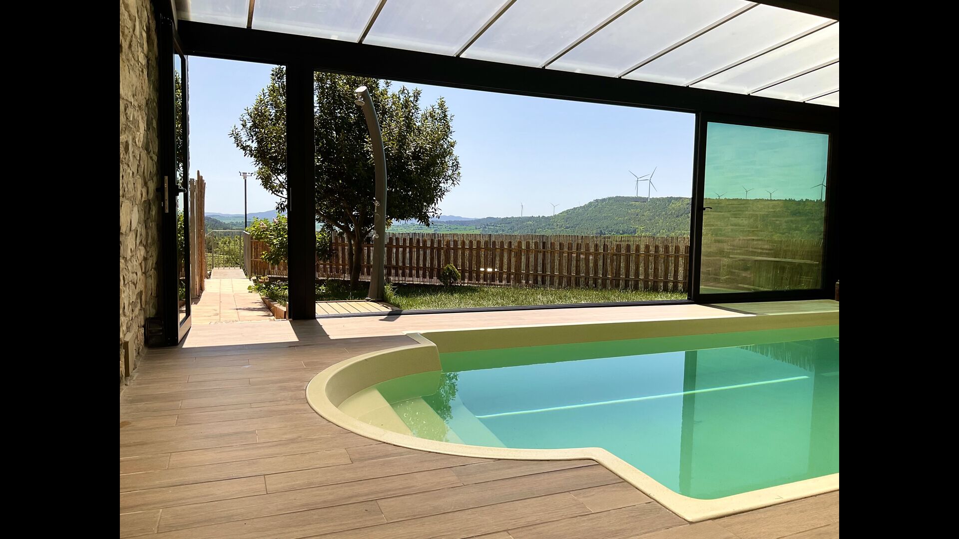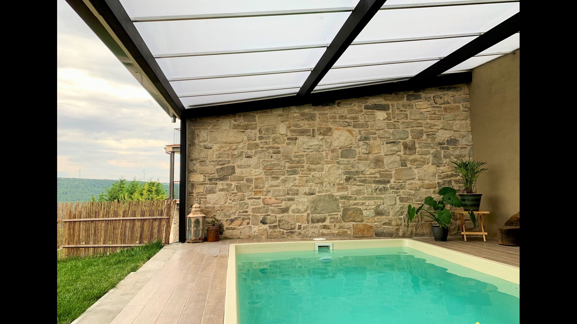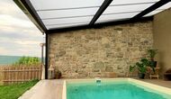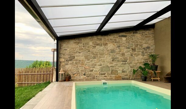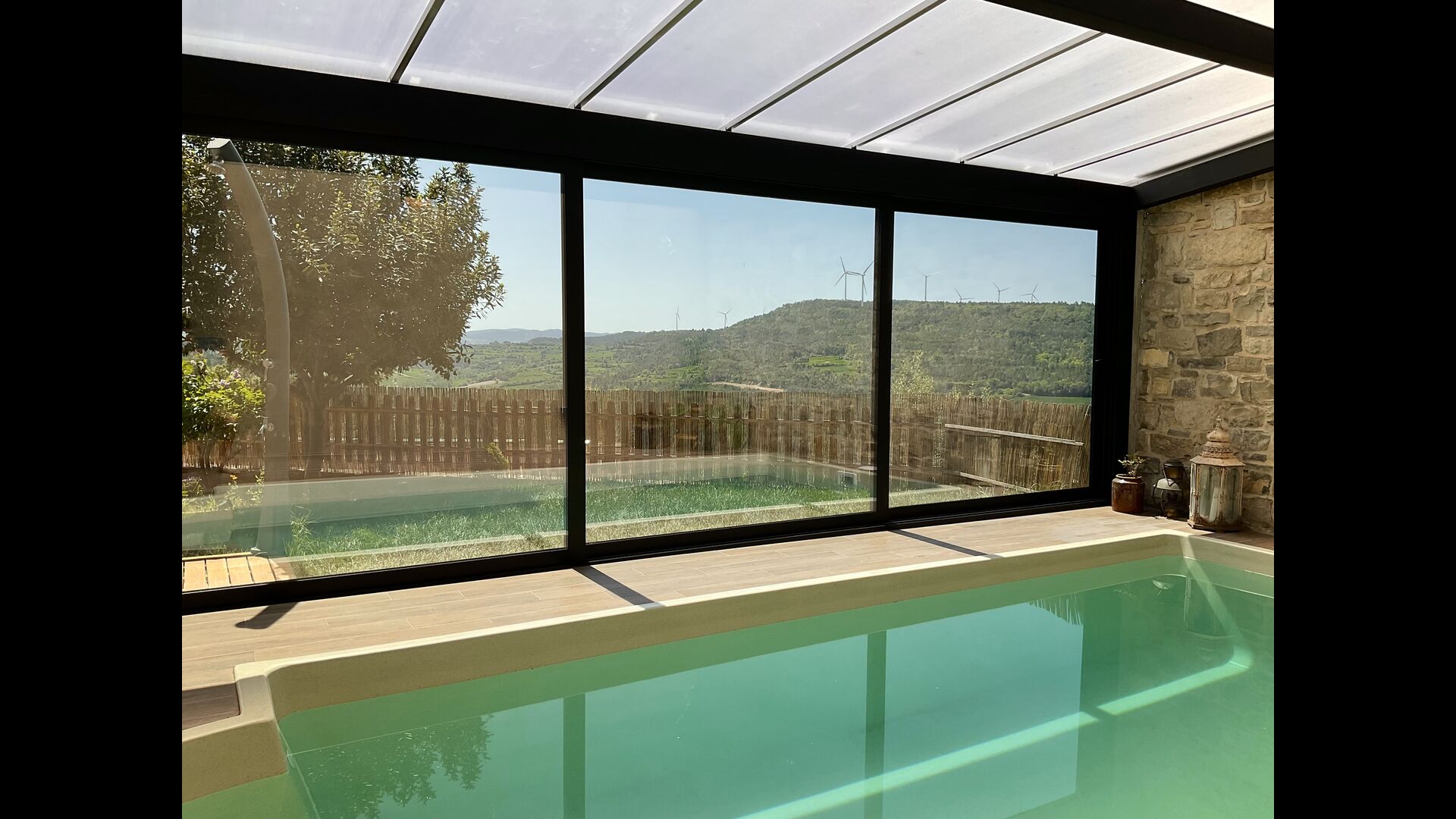 Für die Nebensaison ist ein Teil mit Fenstern überdacht, sodass Sie die Umgebung auch von innen genießen können. Hier gibt es auch einen ausziehbaren Tisch, so dass Sie hier auch speisen können, wenn Sie möchten.