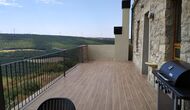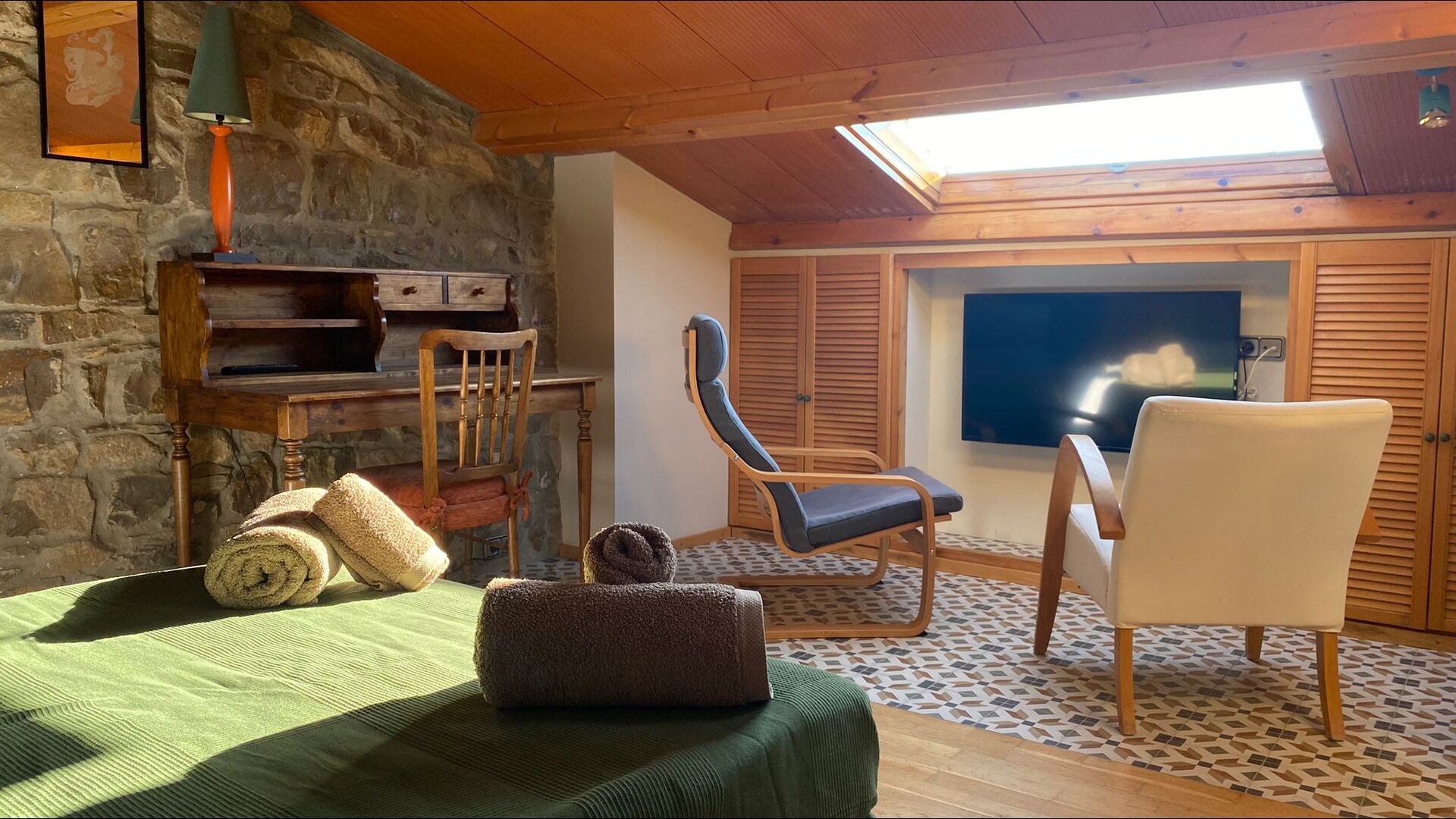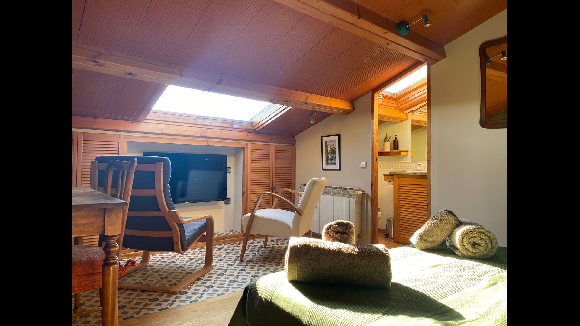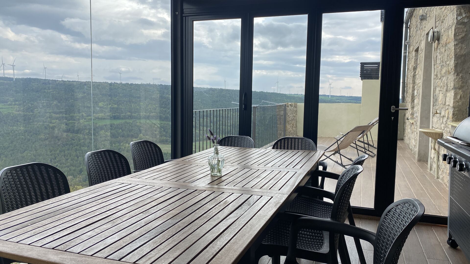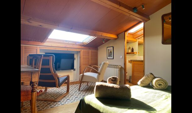 Im gemütlichen Wohnzimmer gibt es ein Sofa, einen Fernseher und ein Bücherregal und einen direkten Zugang zur großen Terrasse mit Aussicht. Hier gibt es auch einen Gasgrill, sodass Sie Ihr Fleisch zubereiten können, während Sie ein Bier trinken und die Aussicht genießen.