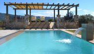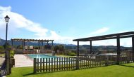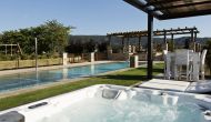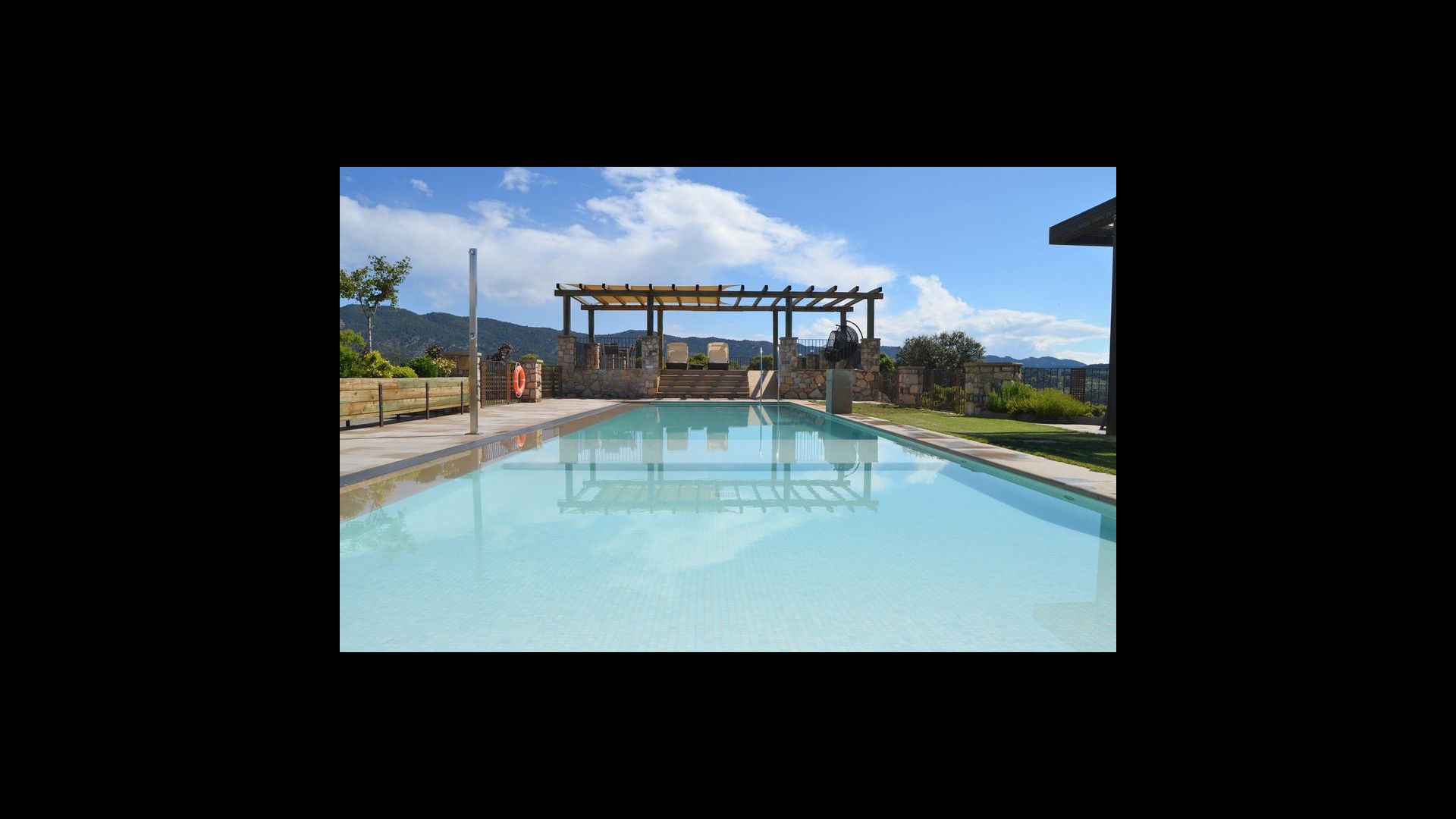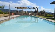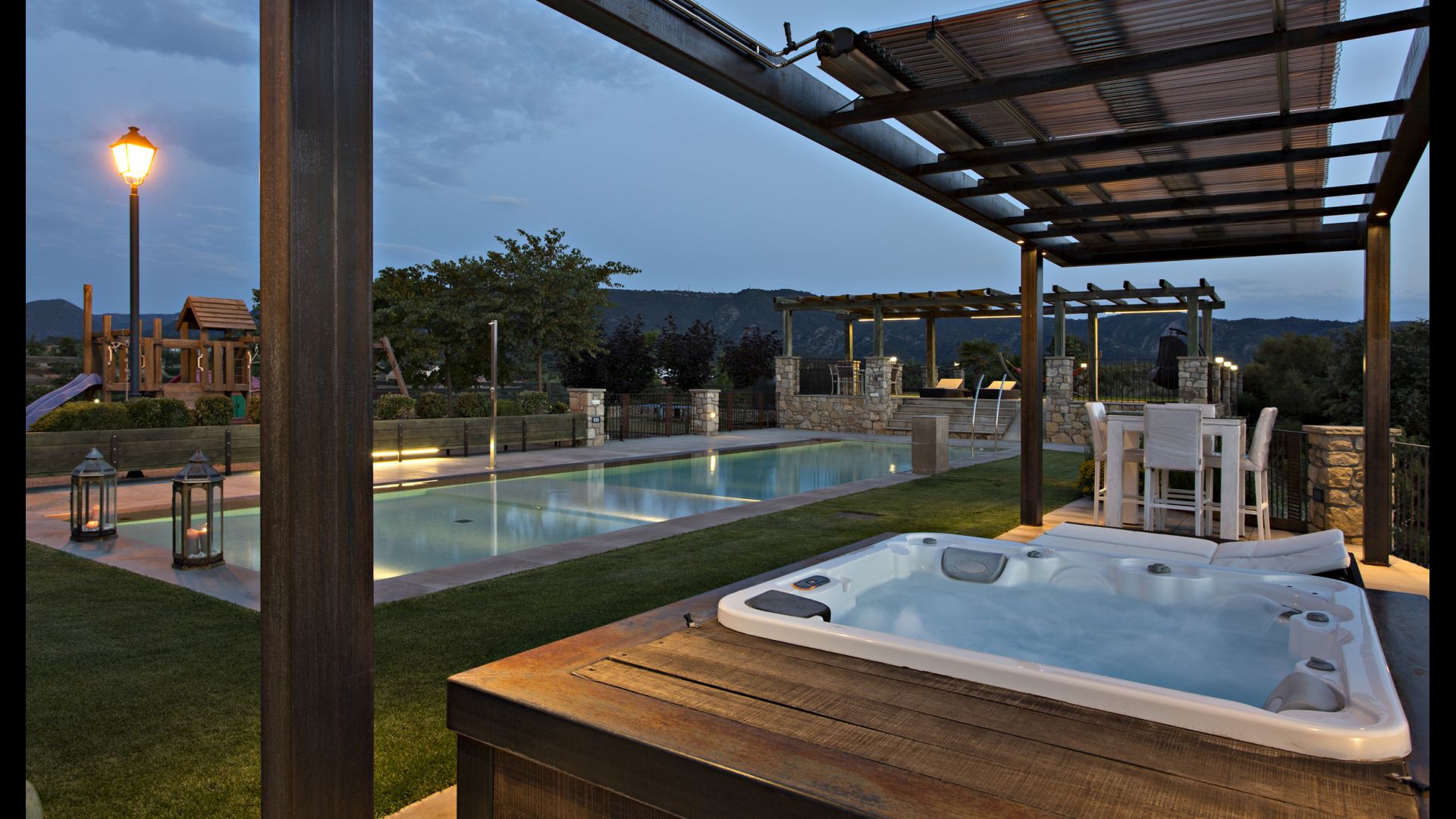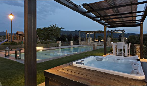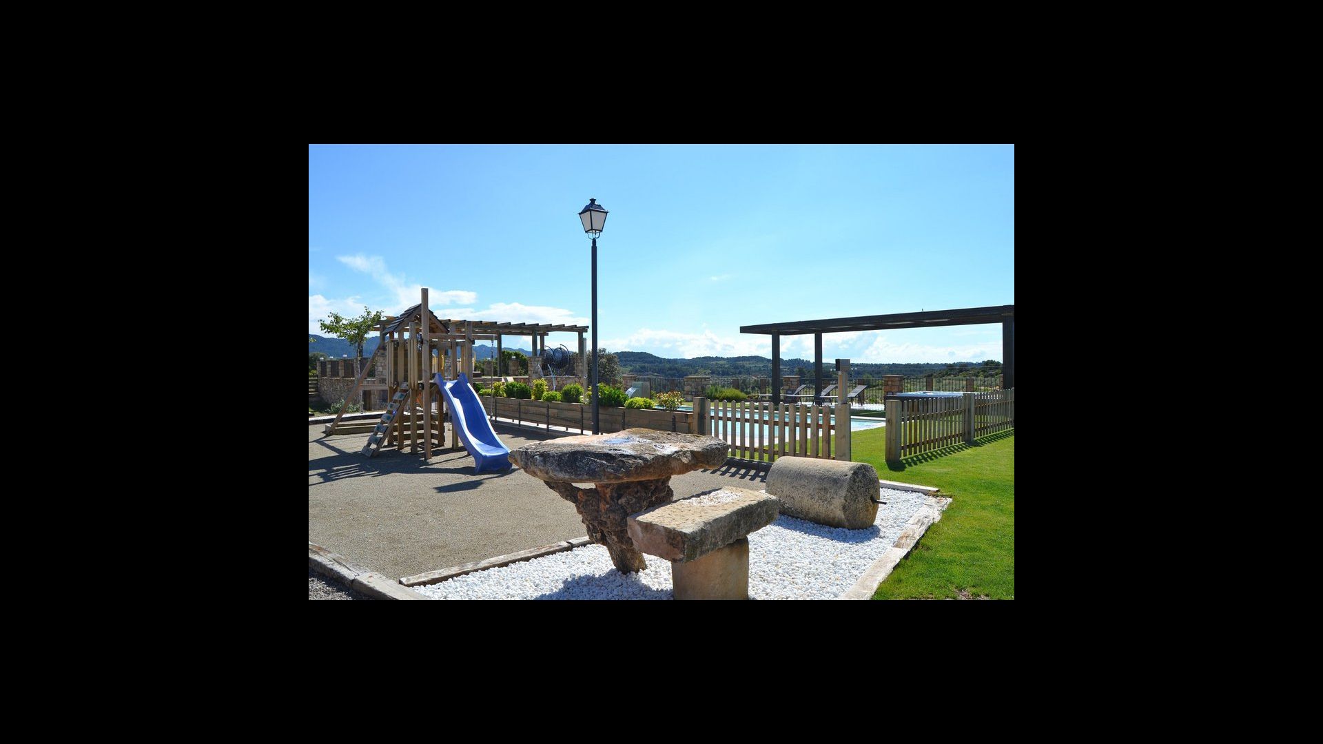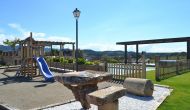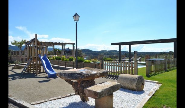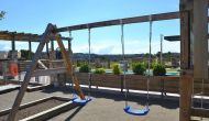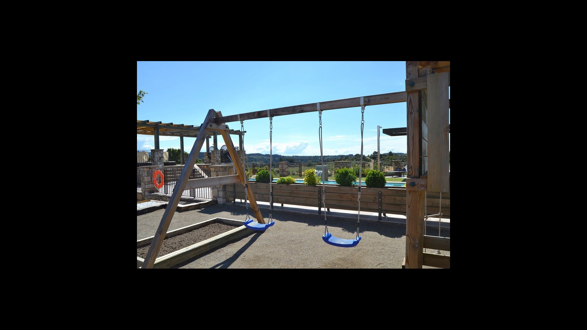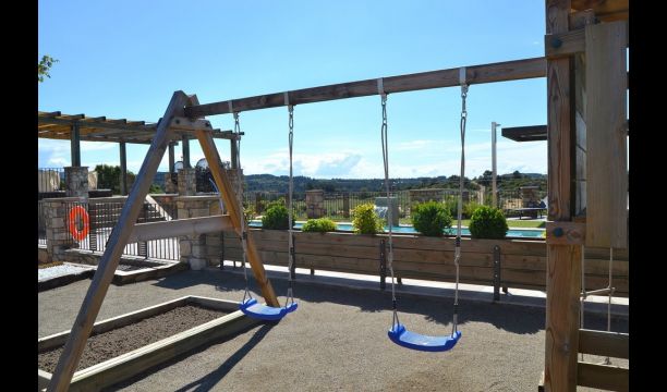 Auf der anderen Seite des Pools gibt es einen Spielplatz mit Schaukeln und ein Spielhaus mit Rutsche, und am Ende findet man eine überdachte Terrasse. Hier können Sie das hausgemachte Abendessen in der wunderschönen Umgebung genießen oder einfach nur auf den Liegestühlen entspannen.