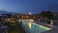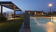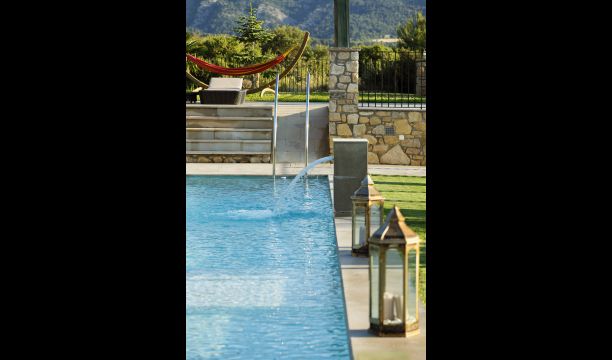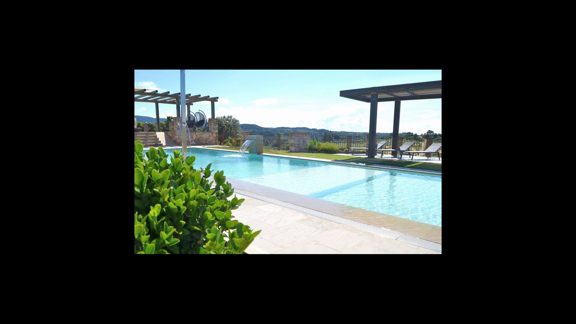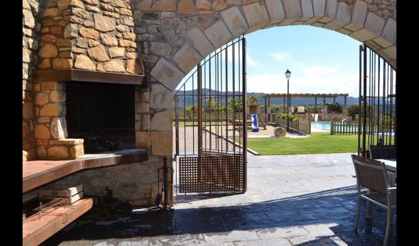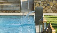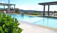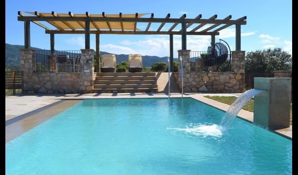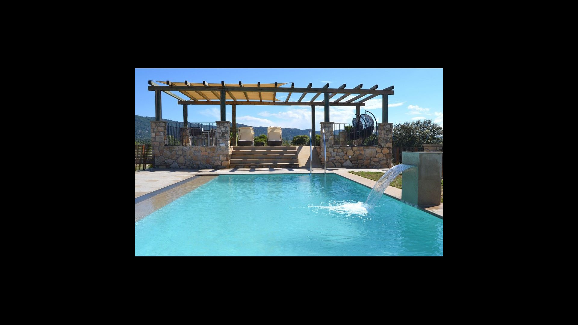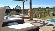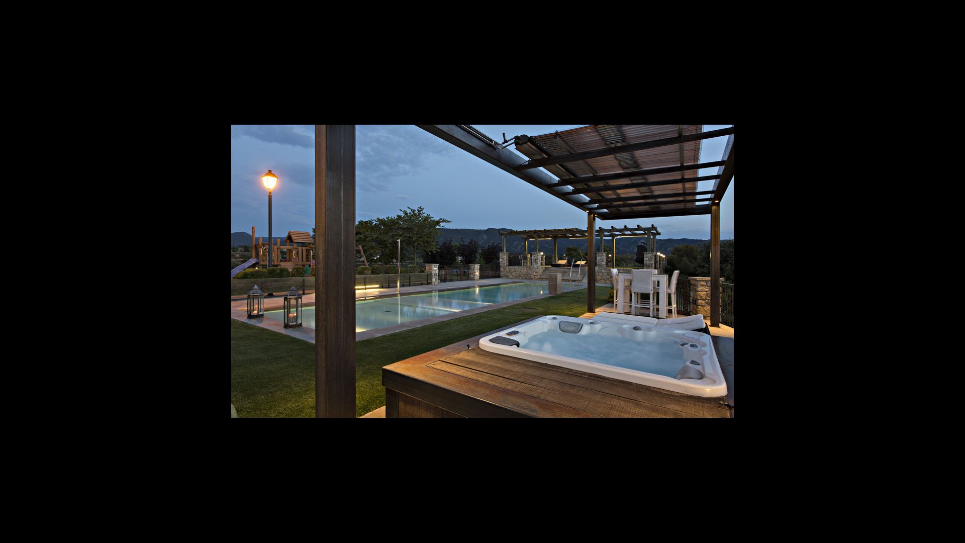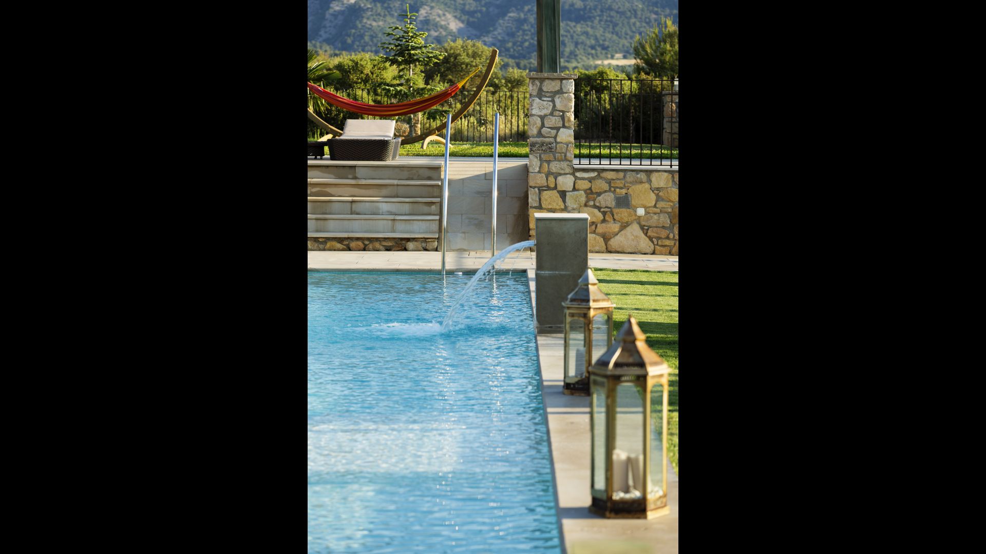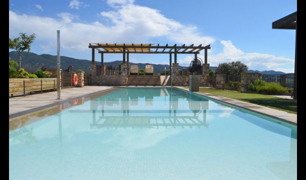 Auf der anderen Seite des Pools gibt es einen Spielplatz mit Schaukeln und ein Spielhaus mit Rutsche, und am Ende findet man eine überdachte Terrasse. Hier können Sie das hausgemachte Abendessen in der wunderschönen Umgebung genießen oder einfach nur auf den Liegestühlen entspannen.