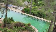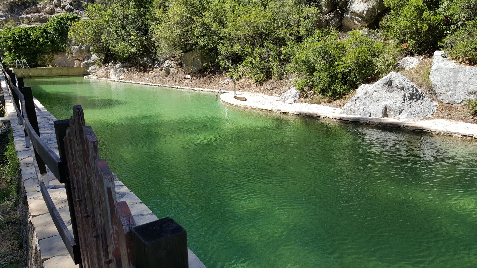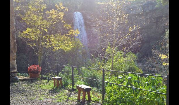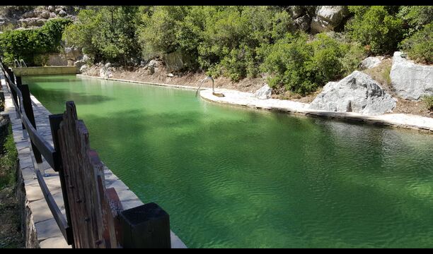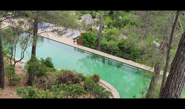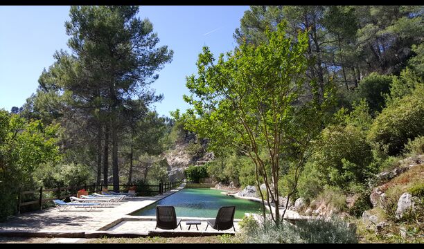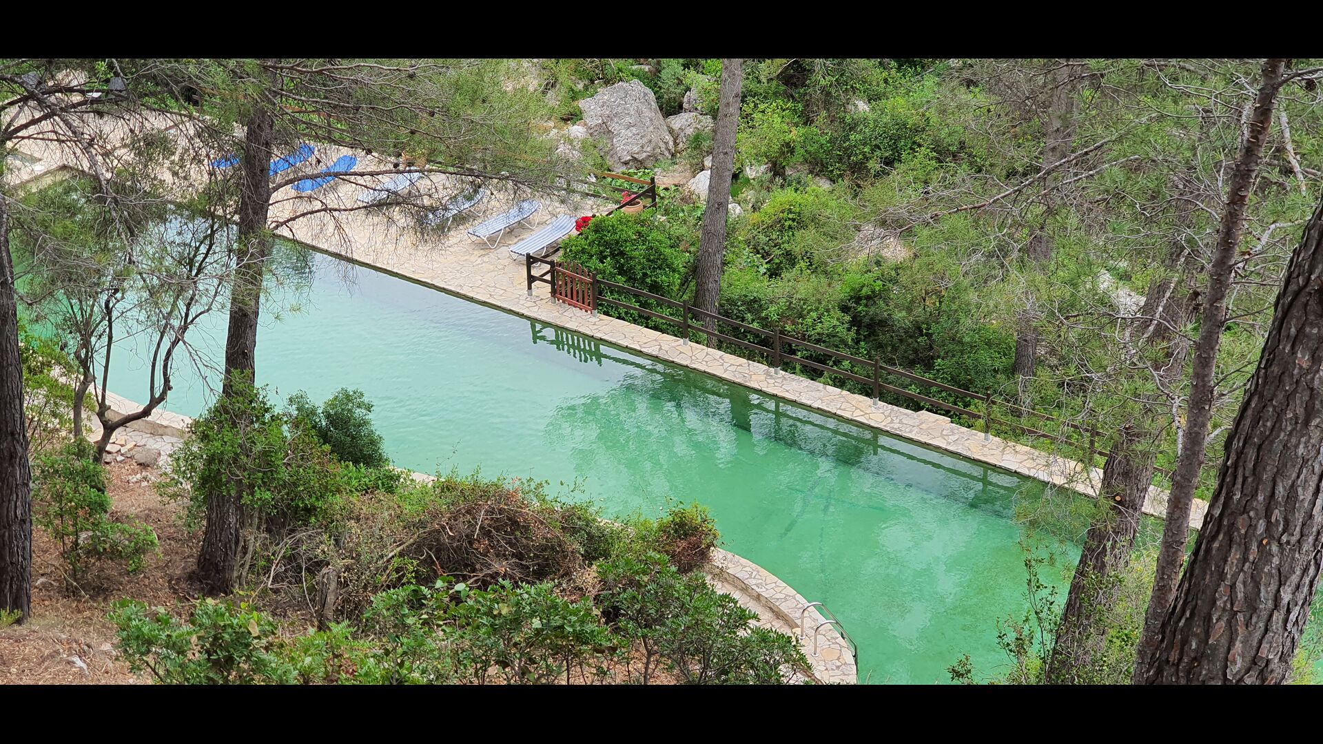 Die Atmosphäre draußen ist schwer mit Worten zu beschreiben, da der Ort etwas ganz Besonderes ist. Der Wasserfall sorgt für Frische und die umliegenden Felsen sorgen für viele schattige Ecken und ein Gefühl, eins mit der Natur zu sein. Die Kanalsysteme, mit denen das Wasser geleitet wird, um den Strom für die Wassermühle zu erzeugen, wurden intelligent zu einem Schwimmbad, wo dieses saubere Wasser, direkt aus der Quelle wenige Kilometer vom Haus entfernt, durch das 45 Meter lange Schwimmbecken geleitet wird, und dann am anderen Ende wieder zum Fluss. Sie können auch unter dem Wasserfall und an verschiedenen Stellen im Fluss schwimmen.