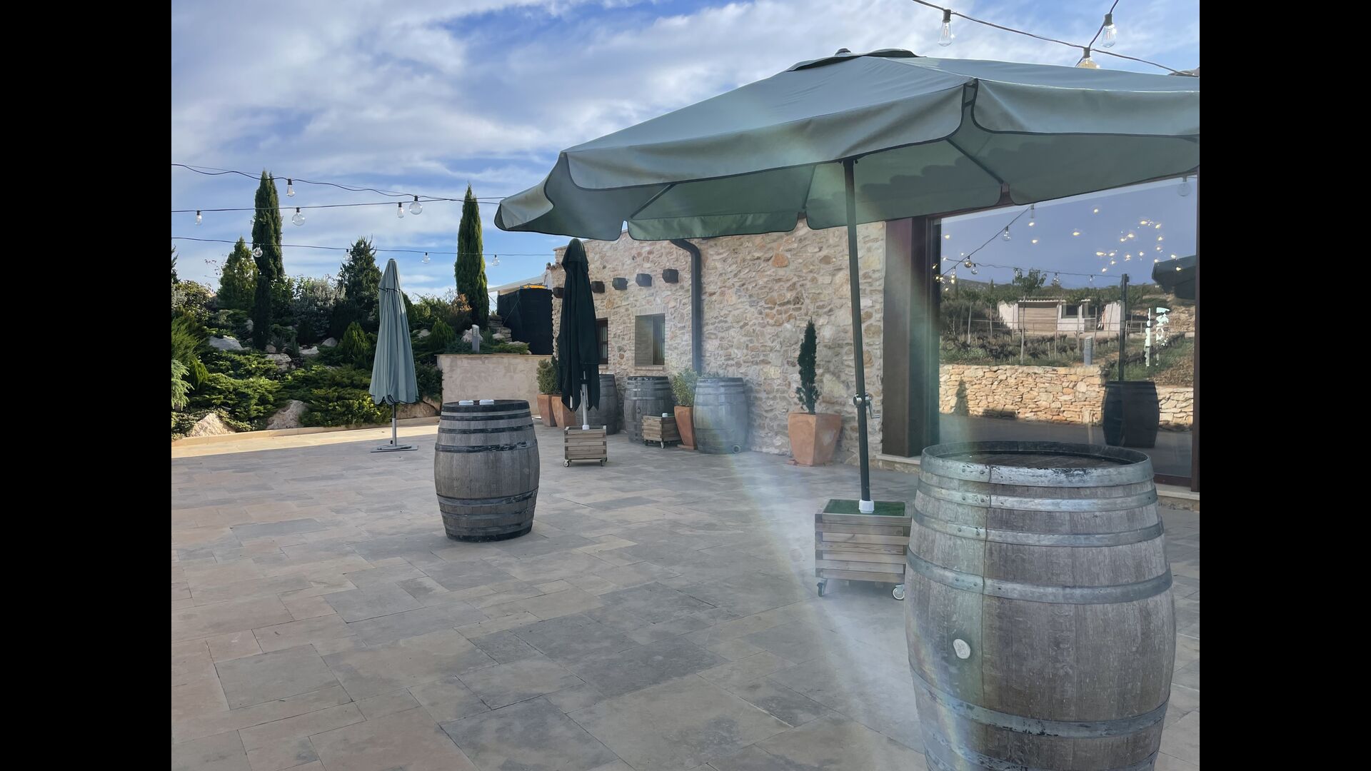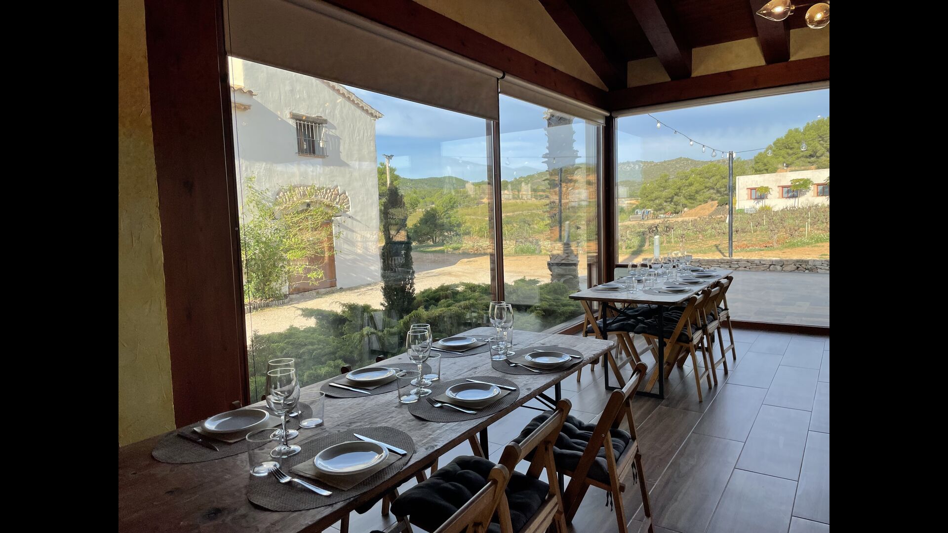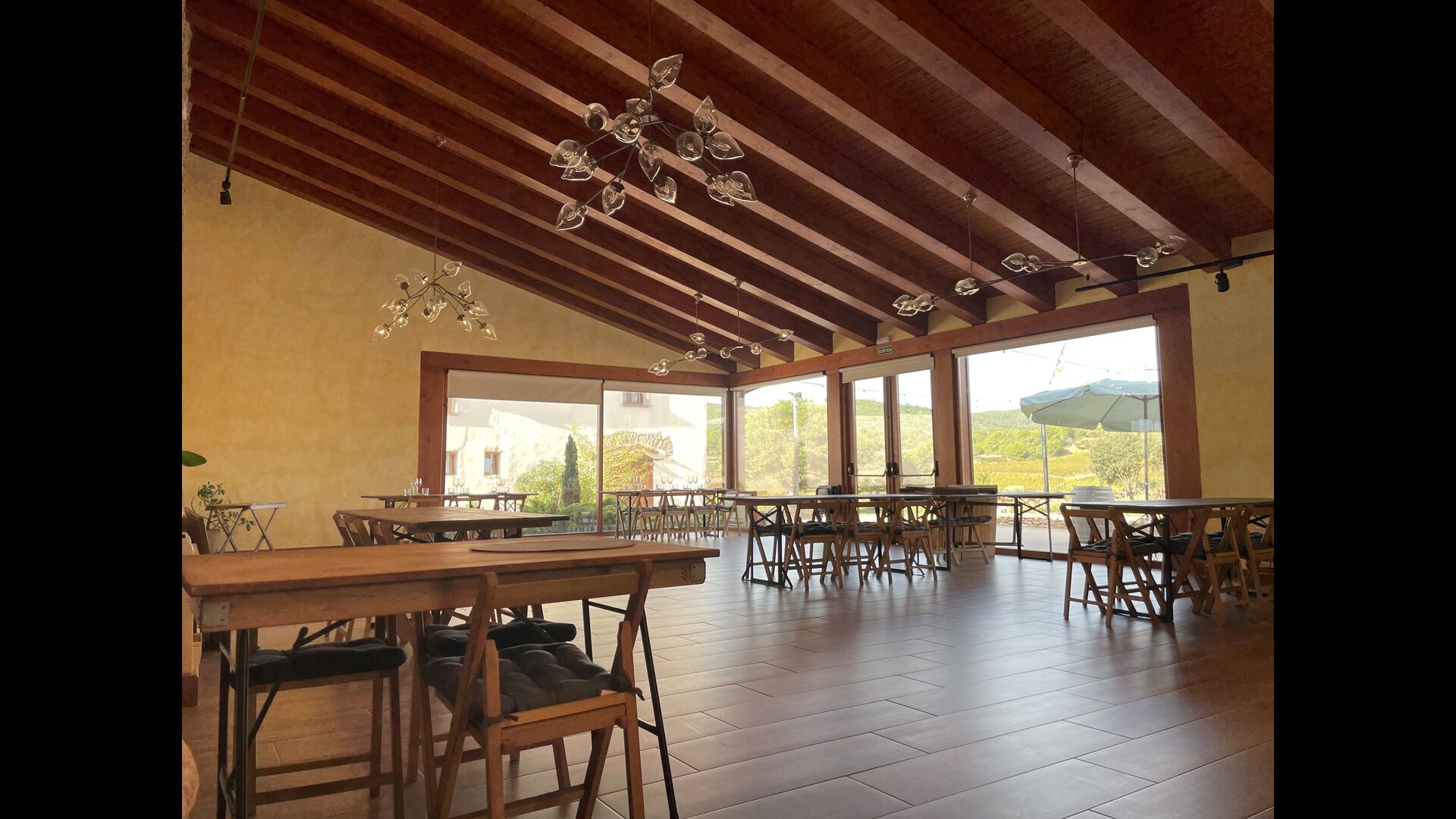 Es liegt direkt vor den Weinbergen von Cristina und Pere, und oft wird die Veranstaltung nach draußen auf die Terrasse oder sogar in die Weinberge verlegt. Im Inneren bieten die großen Panoramafenster den perfekten Teppich für Ihre Feier mit Blick auf die Weinberge und den Sonnenuntergang.