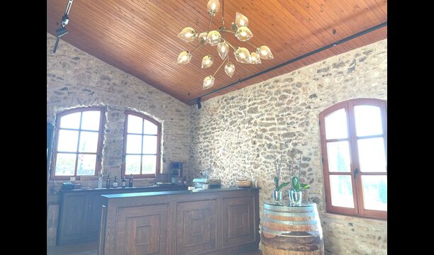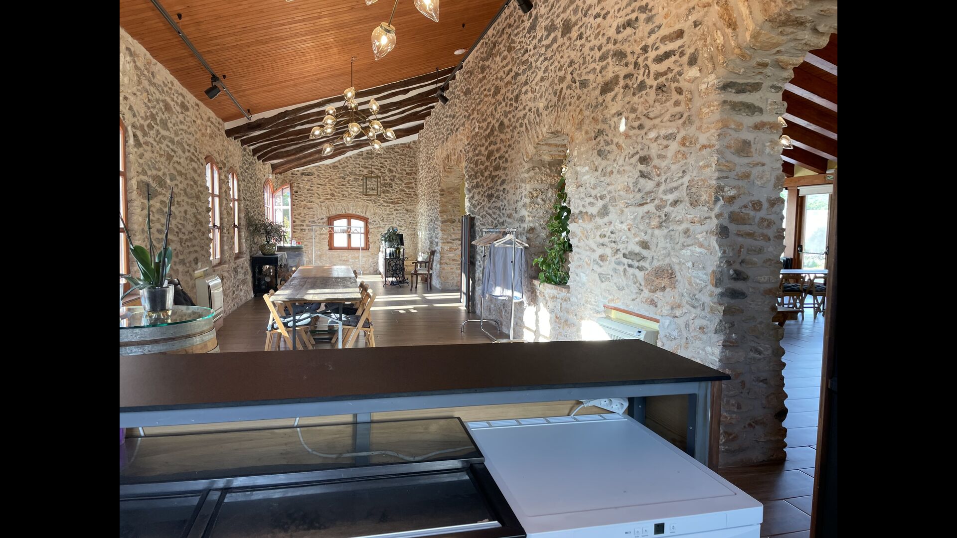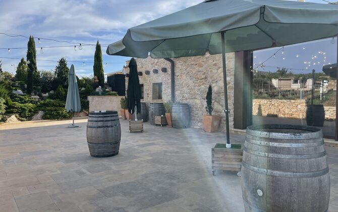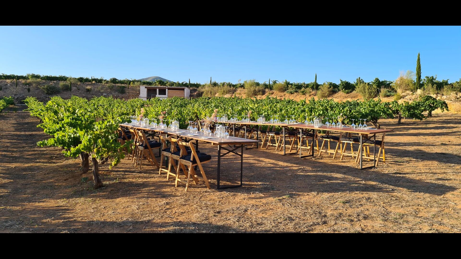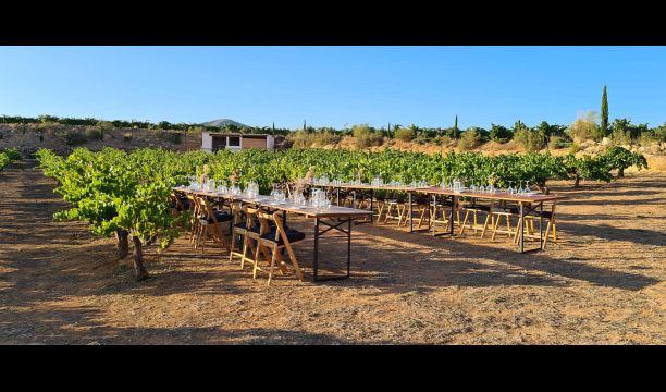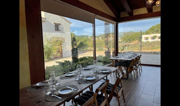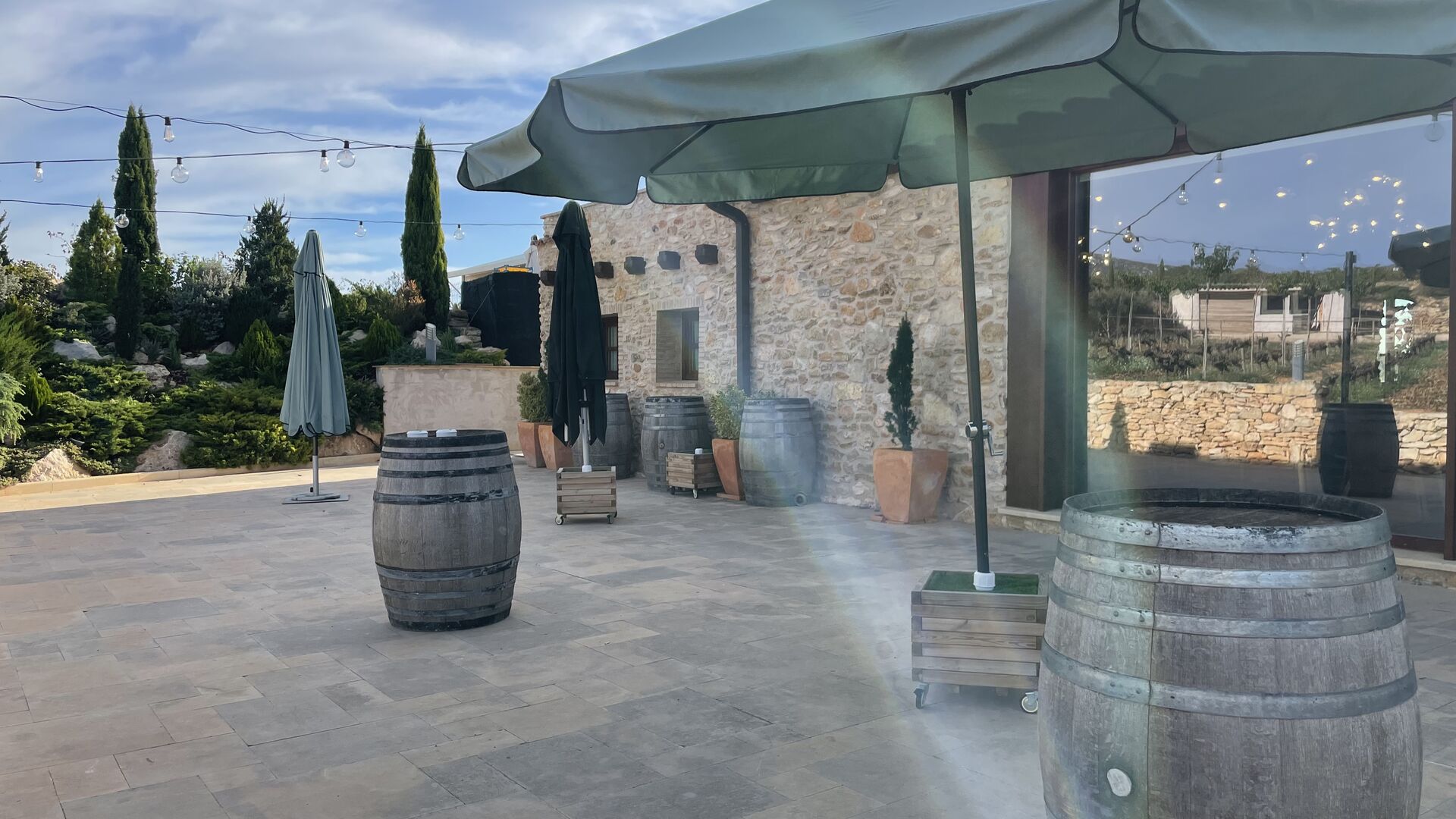 Es liegt direkt vor den Weinbergen von Cristina und Pere, und oft wird die Veranstaltung nach draußen auf die Terrasse oder sogar in die Weinberge verlegt. Im Inneren bieten die großen Panoramafenster den perfekten Teppich für Ihre Feier mit Blick auf die Weinberge und den Sonnenuntergang.