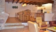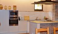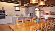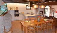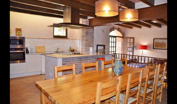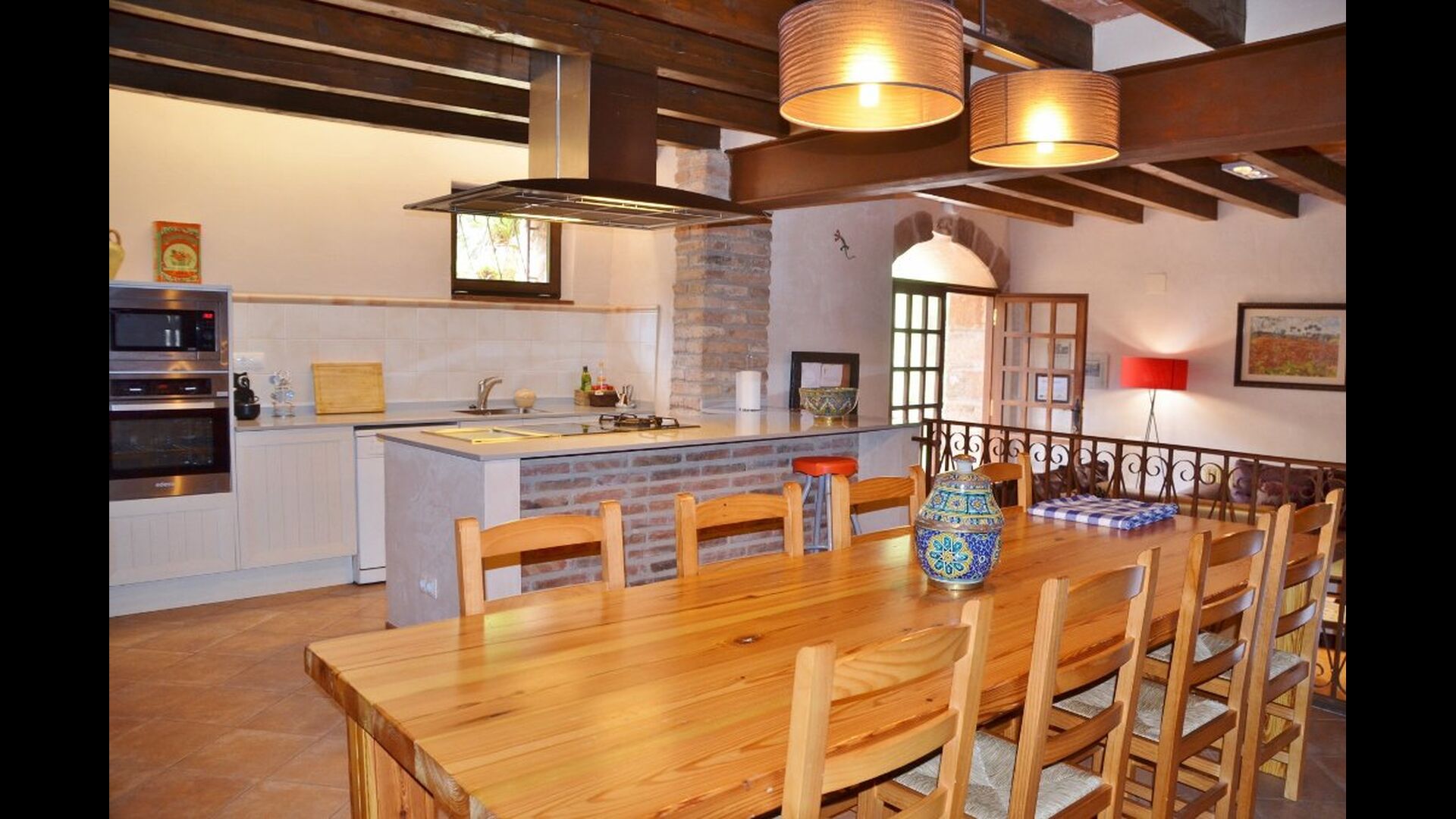 Von der Terrasse gibt es eine Tür zur schönen Mehrzwecksraum des Ferienhauses, wo die gesamte Urlaubsgruppe zur gleichen Zeit zusammen sein können. Hier ist ein schönes Sofa-Bereich, und hinter der Küche, zwei Stufen nach oben, gibt es einen länglichen Esstisch. Die Küche verfügt über eine Vielzahl von Küchengeräten wie Backofen, Geschirrspüler, Kühl- und Gefrierschrank und Mikrowelle. In der Küche ragt ein Teil des Felsens als ein schönes Detail in das Haus hinein. Darüber hinaus hat die gesamte Raum - wie alle anderen Räume im Haus - eine schöne Holzdecke mit Querbalken .