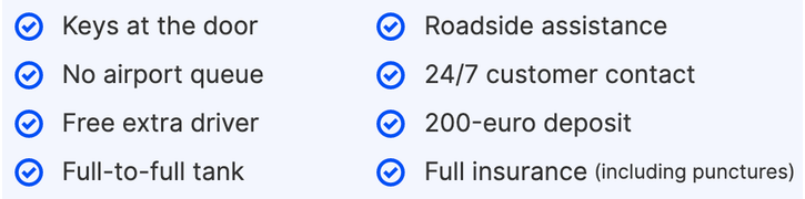 Zum Beispiel, wenn Sie Kindersitze oder GPS wollen, ist es wichtig, im Voraus zu buchen, da es ausverkauft sein kann. Beachten Sie auch, dass GPS sehr teuer zu mieten ist, daher ist es oft günstiger, einen von zu Hause mitzunehmen oder eine GPS-App für sein Smartphone zu kaufen