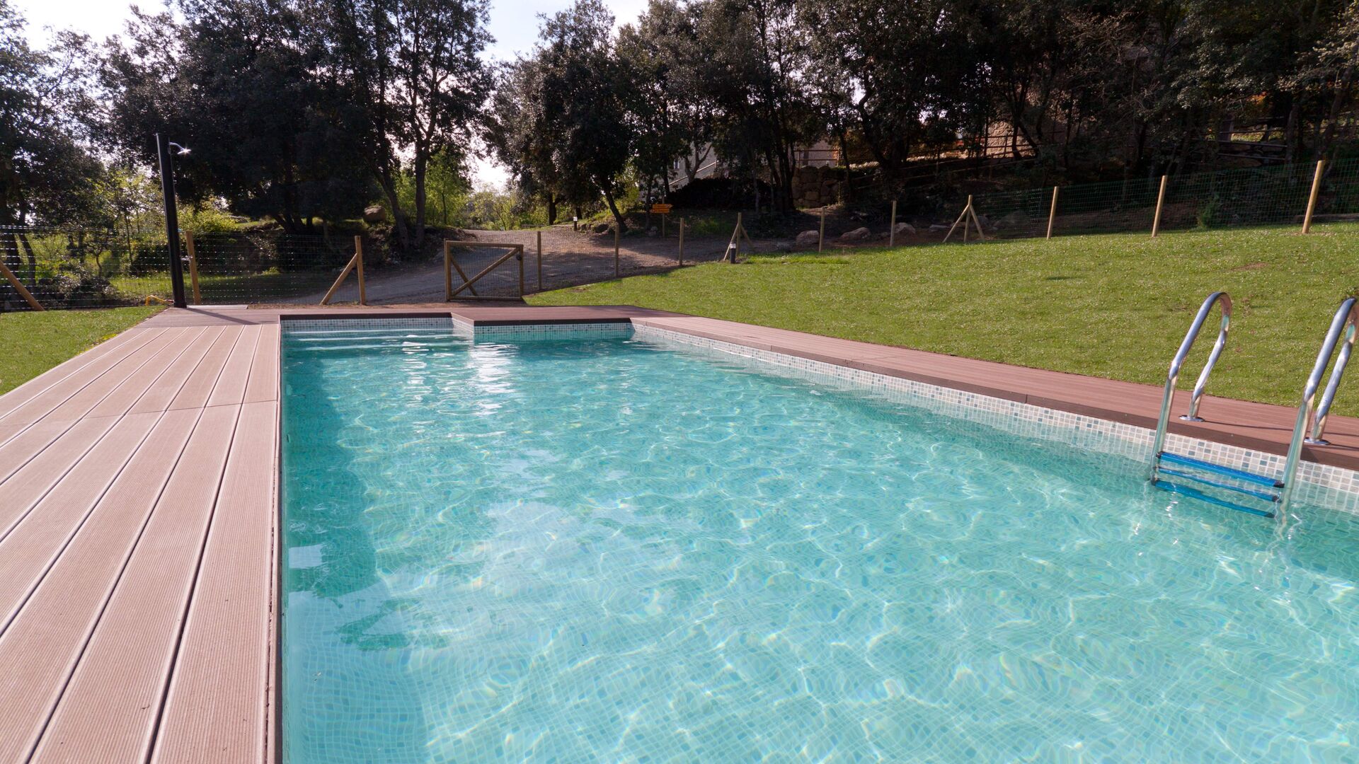 Direkt unter dem Haus befindet sich der schöne Poolbereich, ideal für Kinder jeden Alters. Eine Ebene unterhalb des Poolbereichs befindet sich eine große Liegewiese, auf der Sie Fußball, Volleyball, Badminton oder Basketball spielen können.