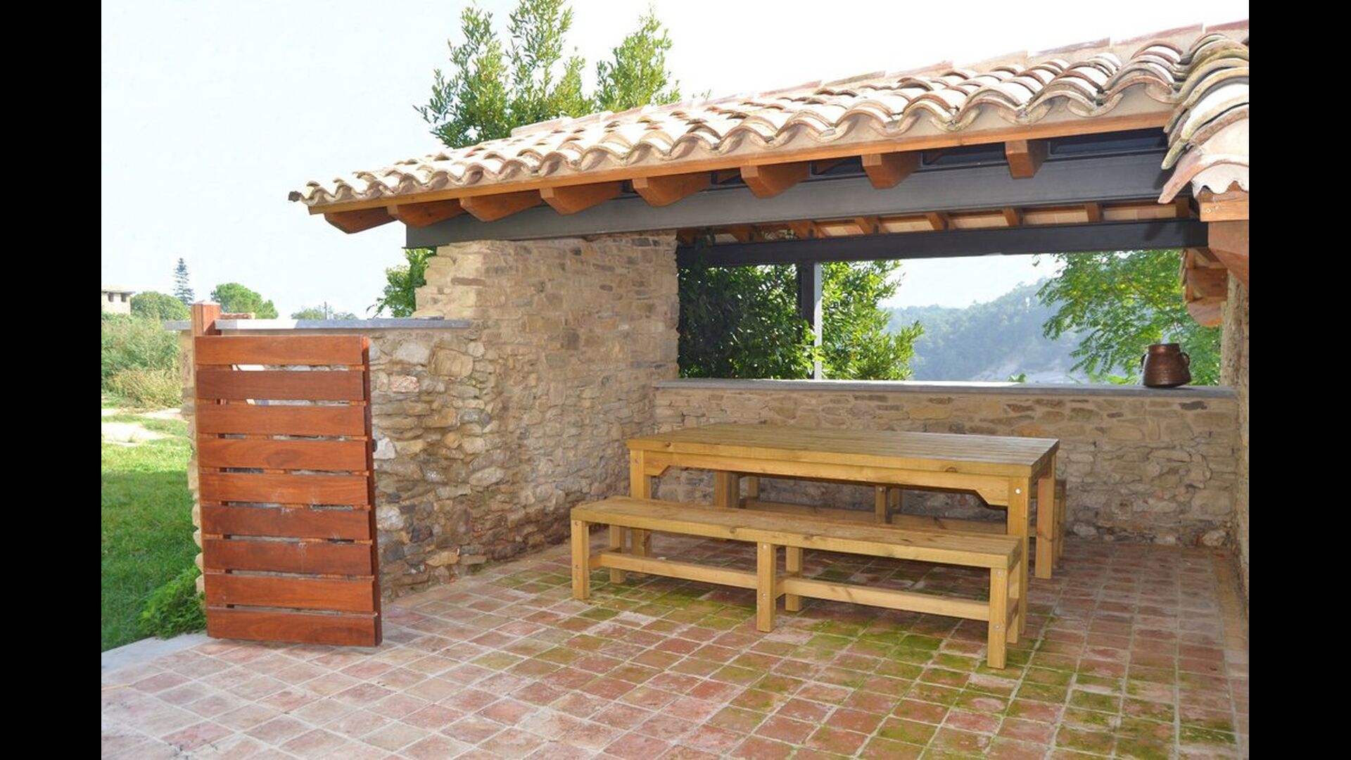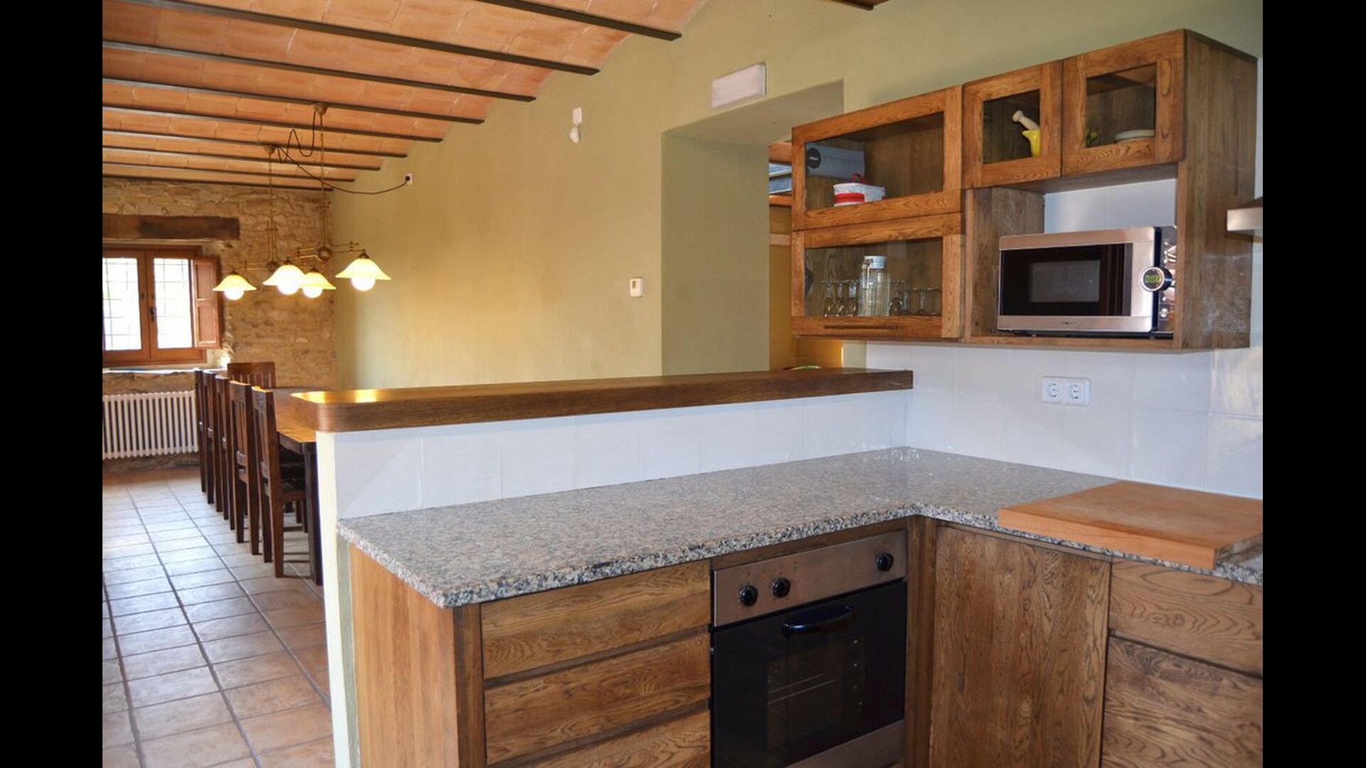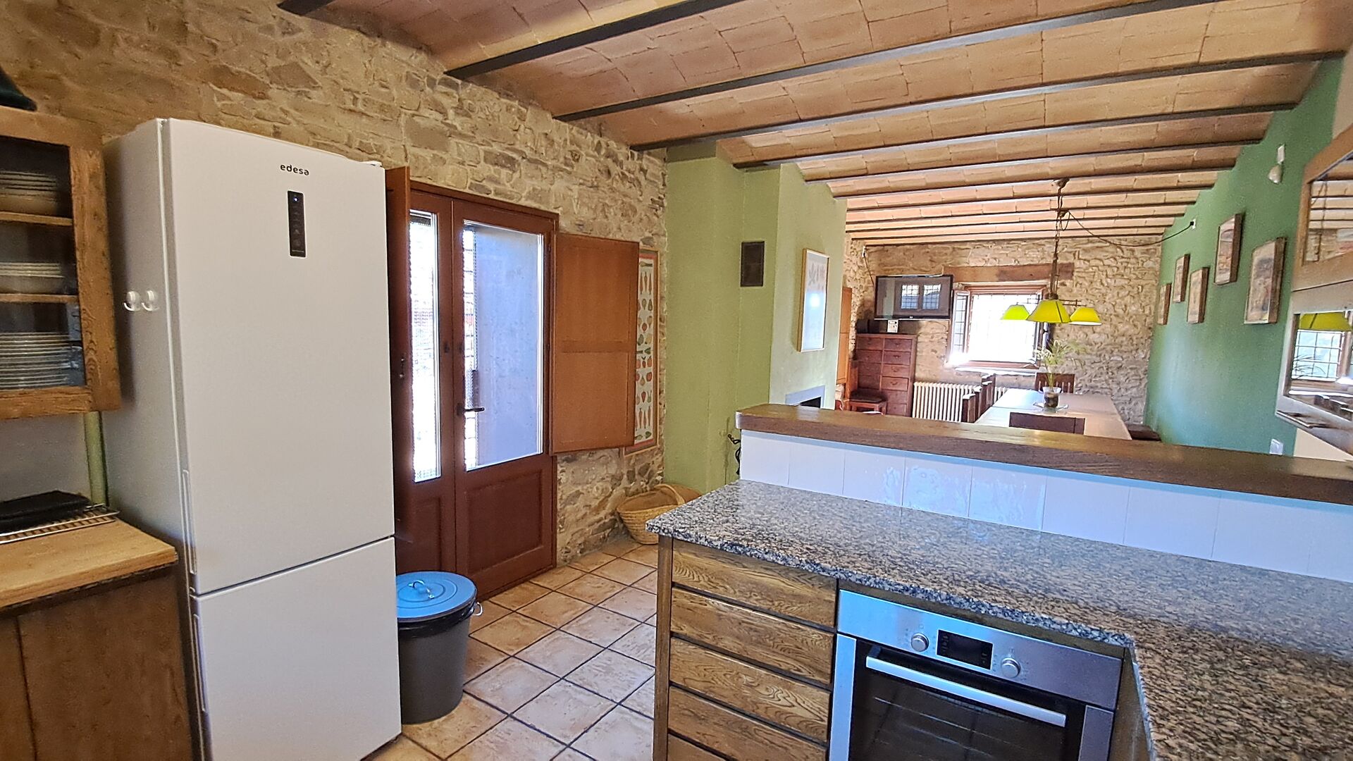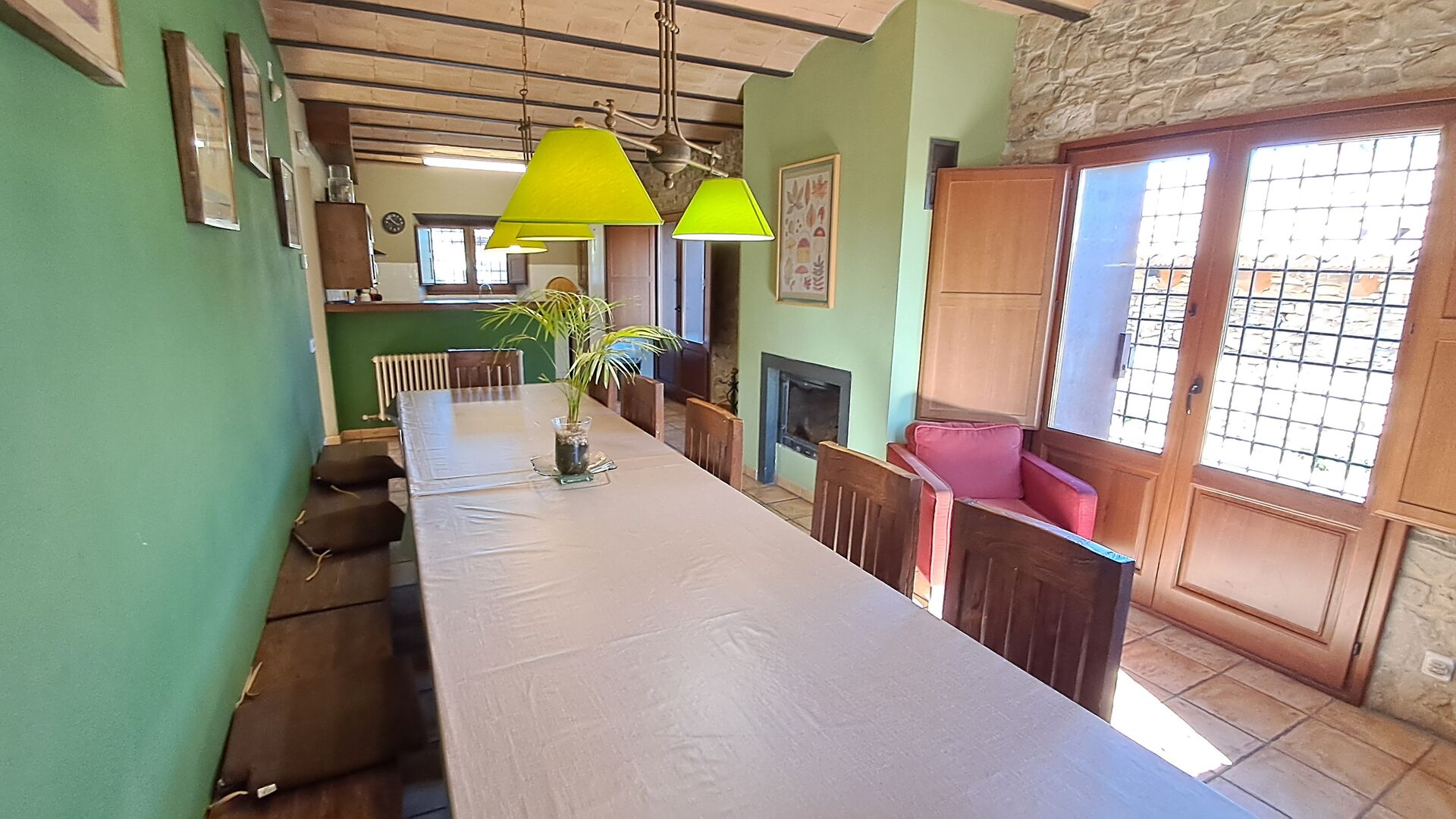 Im Erdgeschoss ist die Küche mit dem Essbereich mit einem langen Esstisch verbunden und bietet direkten Zugang zur überdachten Außenterrasse, die auch über einen Grill verfügt. Es ist hervorragend, dass die Gruppe zusammen sein kann, auch wenn manche in der Küche, manche auf der Terrasse und manche am Grill sind.