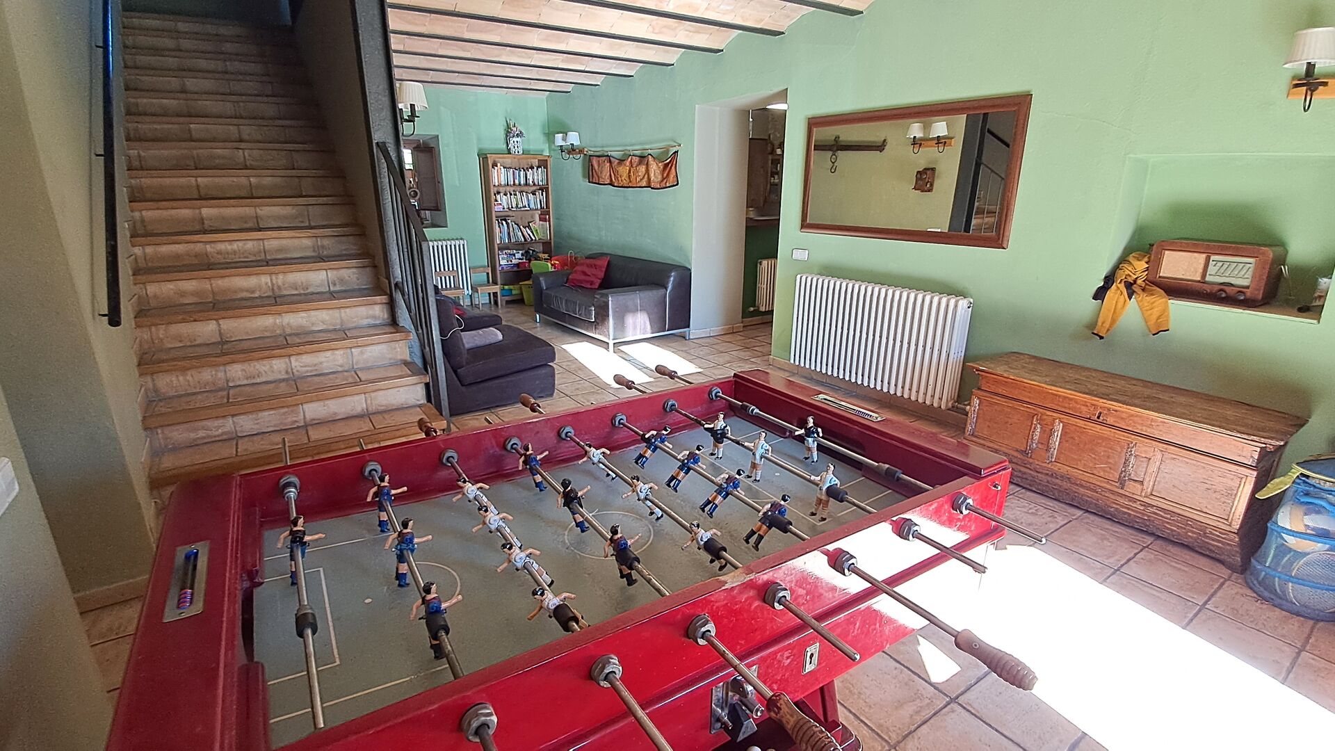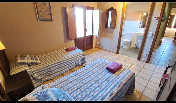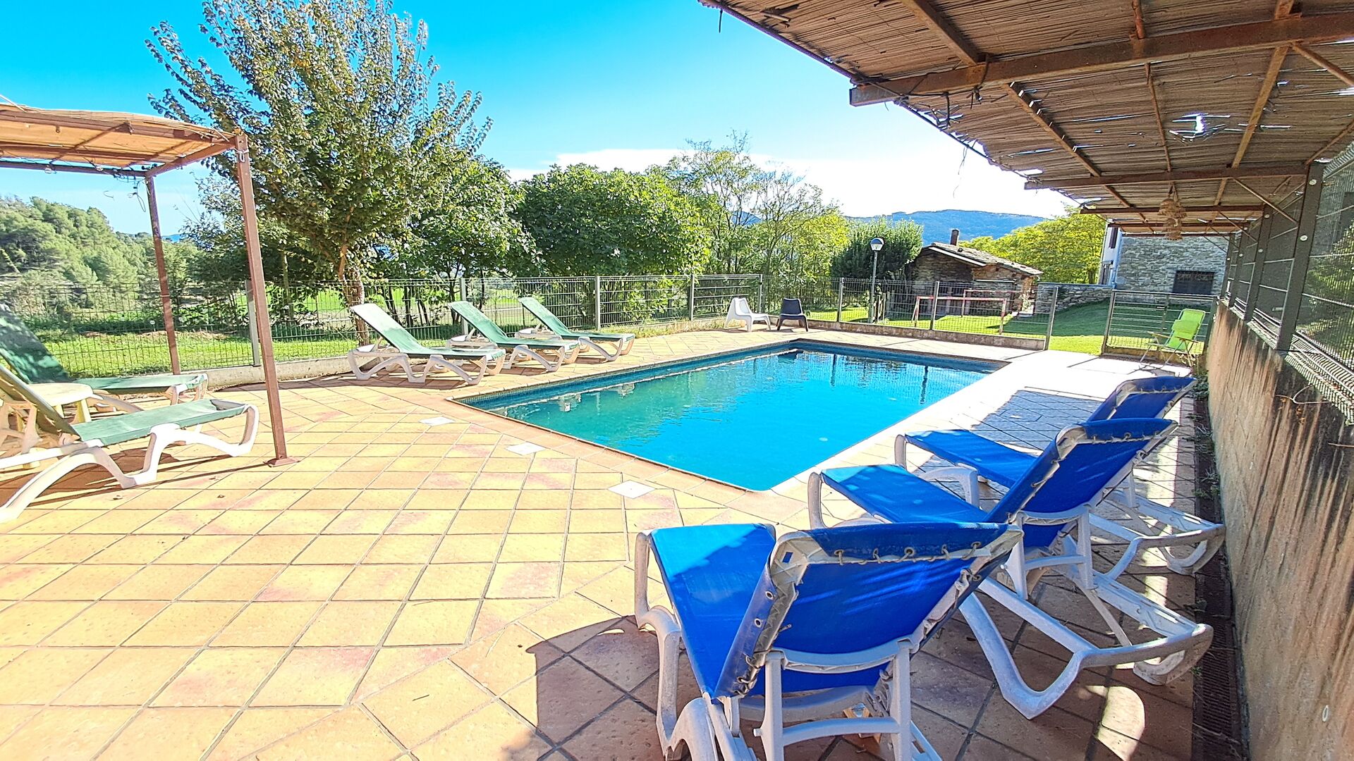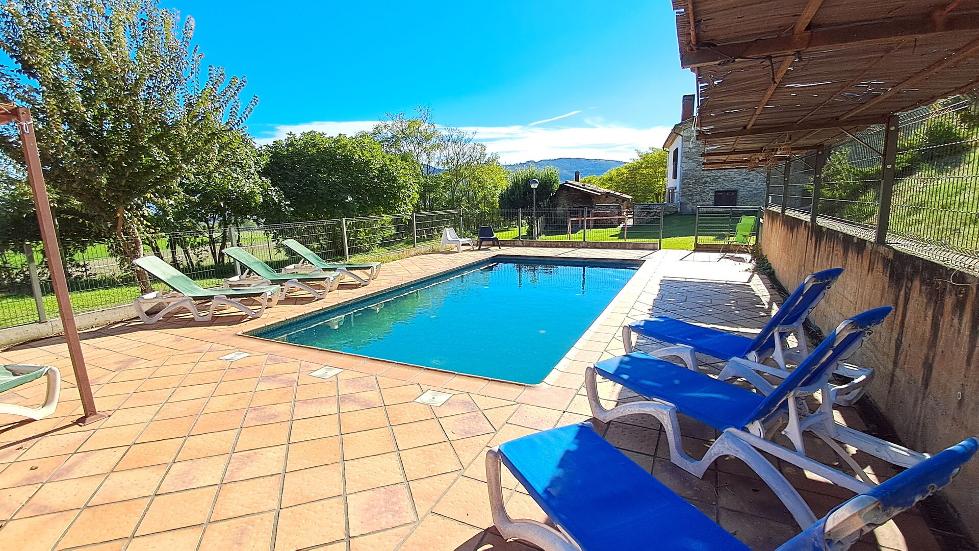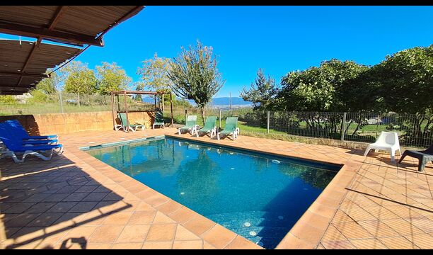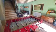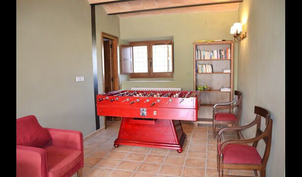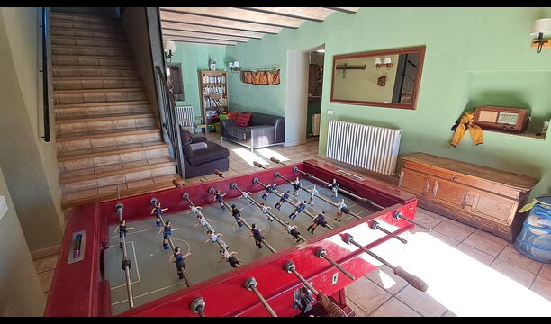 Von der Terrasse aus können Sie den Poolbereich auf der anderen Seite des Gartens sehen. Wenn Sie den Garten durchqueren, gelangen Sie in den Poolbereich, wo Sie auf den vielen Liegestühlen die Sonne genießen oder ein erfrischendes Bad nehmen können. Generell ist dieses Haus ideal für Familien mit Kindern oder Gruppen, die ein ruhiges Plätzchen suchen, aber dennoch gut angebunden sind. Das Haus verfügt über Tischtennis, Tischfußballl und Internetanschluss.