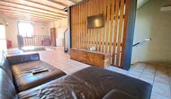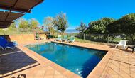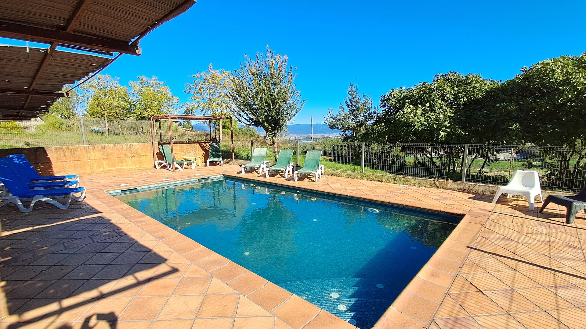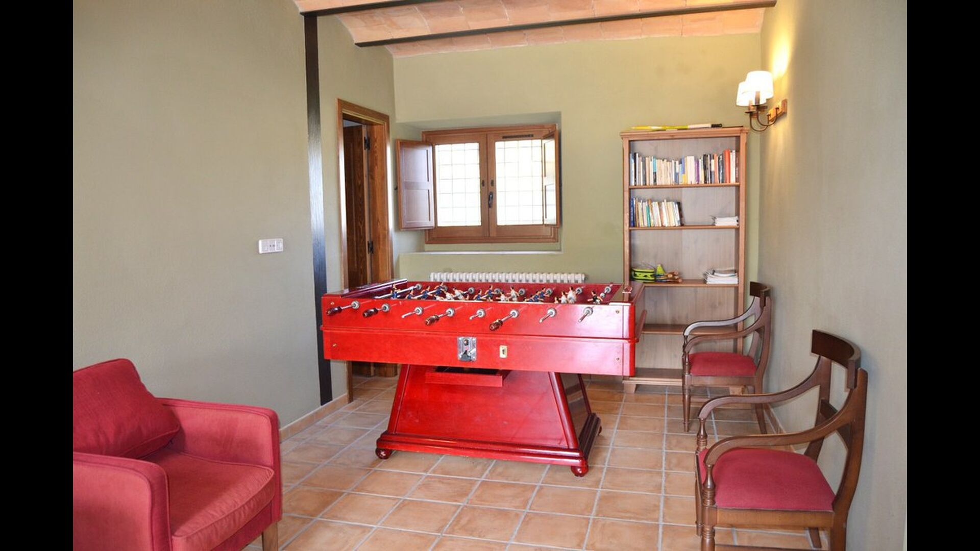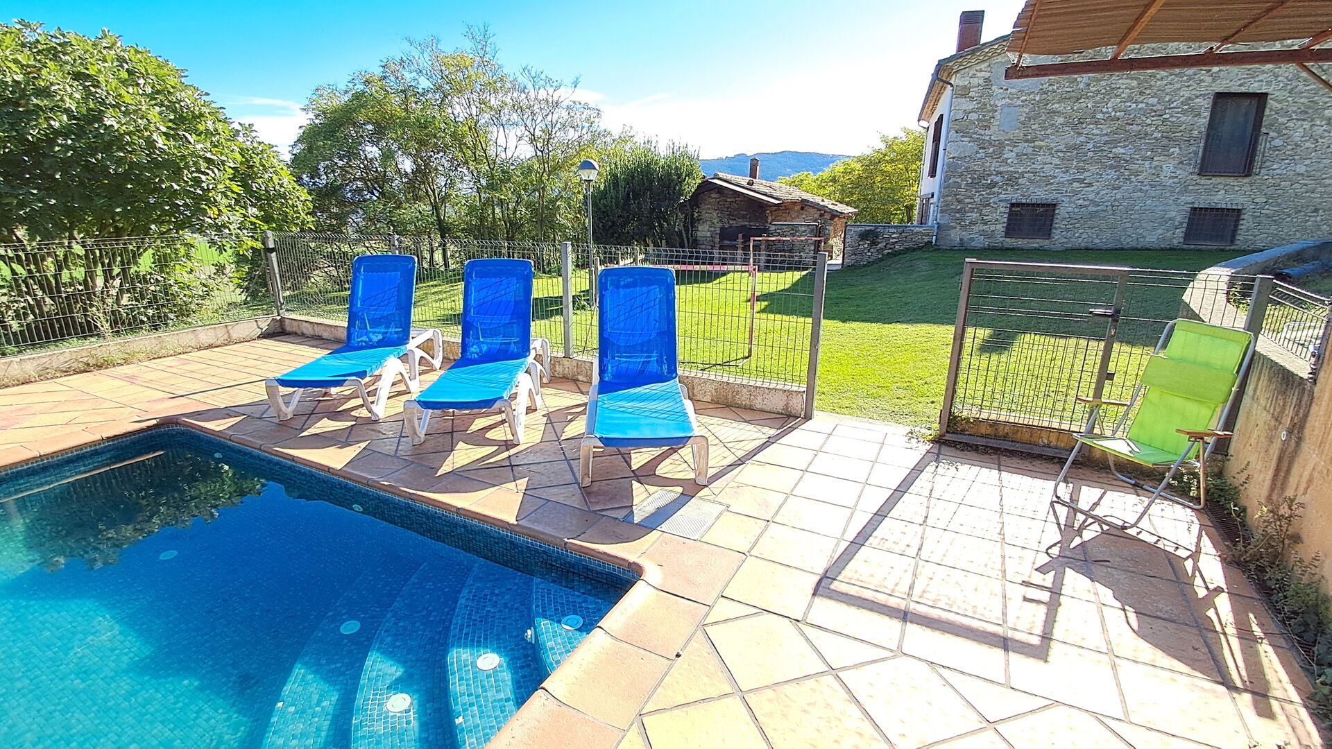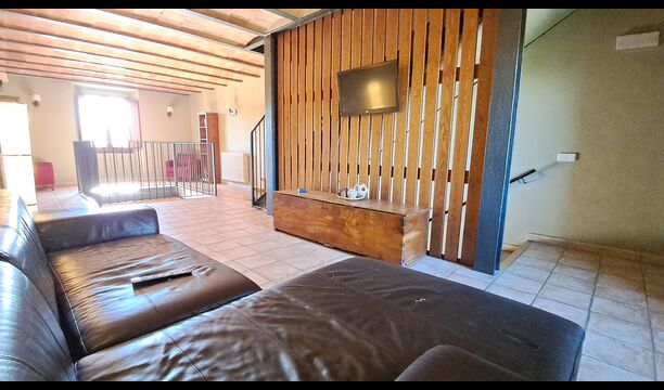 Von der Terrasse aus können Sie den Poolbereich auf der anderen Seite des Gartens sehen. Wenn Sie den Garten durchqueren, gelangen Sie in den Poolbereich, wo Sie auf den vielen Liegestühlen die Sonne genießen oder ein erfrischendes Bad nehmen können. Generell ist dieses Haus ideal für Familien mit Kindern oder Gruppen, die ein ruhiges Plätzchen suchen, aber dennoch gut angebunden sind. Das Haus verfügt über Tischtennis, Tischfußballl und Internetanschluss.