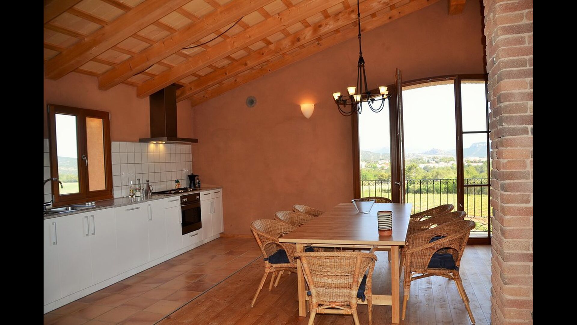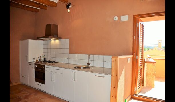 In einer Ende, finden Sie das enorme Gemeinschaftsraum mit komplett ausgestatteter offenen Küche, in der einen Seite, Sofaecke und TV in der anderen, und schließlich ist die gesamte Fassade ein Panorama-Fenster mit Doppeltüren und einem fantastischen Blick über die Landschaft und den die Berge mit dem Schloss auf der Gipfel. Der Esstisch ist direkt vor der Doppeltür platziert, und wenn das Fenster geöffnet ist, funktioniert es wie eine überdachte Terrasse. Zu beiden Seiten gibt es auch Fenster, die den Raum hell und schön machen. Die Wohnung hat auch zwei voll ausgestattete Badezimmer.