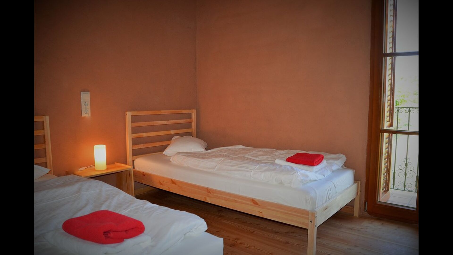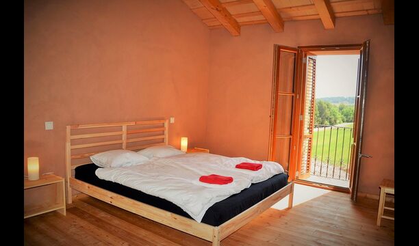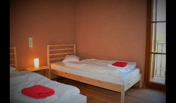 Auf der ersten Etage gibt es zwei Einheiten für je 4 Personen. Die "Rosemary" hat zwei Schlafzimmer, eines mit Einzelbetten und eines mit zwei Doppelbetten, die alle in leichtem "nordischen Stil" und jedes mit Balkon. Es gibt auch ein voll ausgestattetes Badezimmer mit Dusche und einen Gemeinschaftsraum mit Küche, Essbereich, Sofa-Ecke und eine sehr schöne Terrasse im ersten Stock mit Blick auf das Tal und auf die Burg auf der Spitze des Hügels.