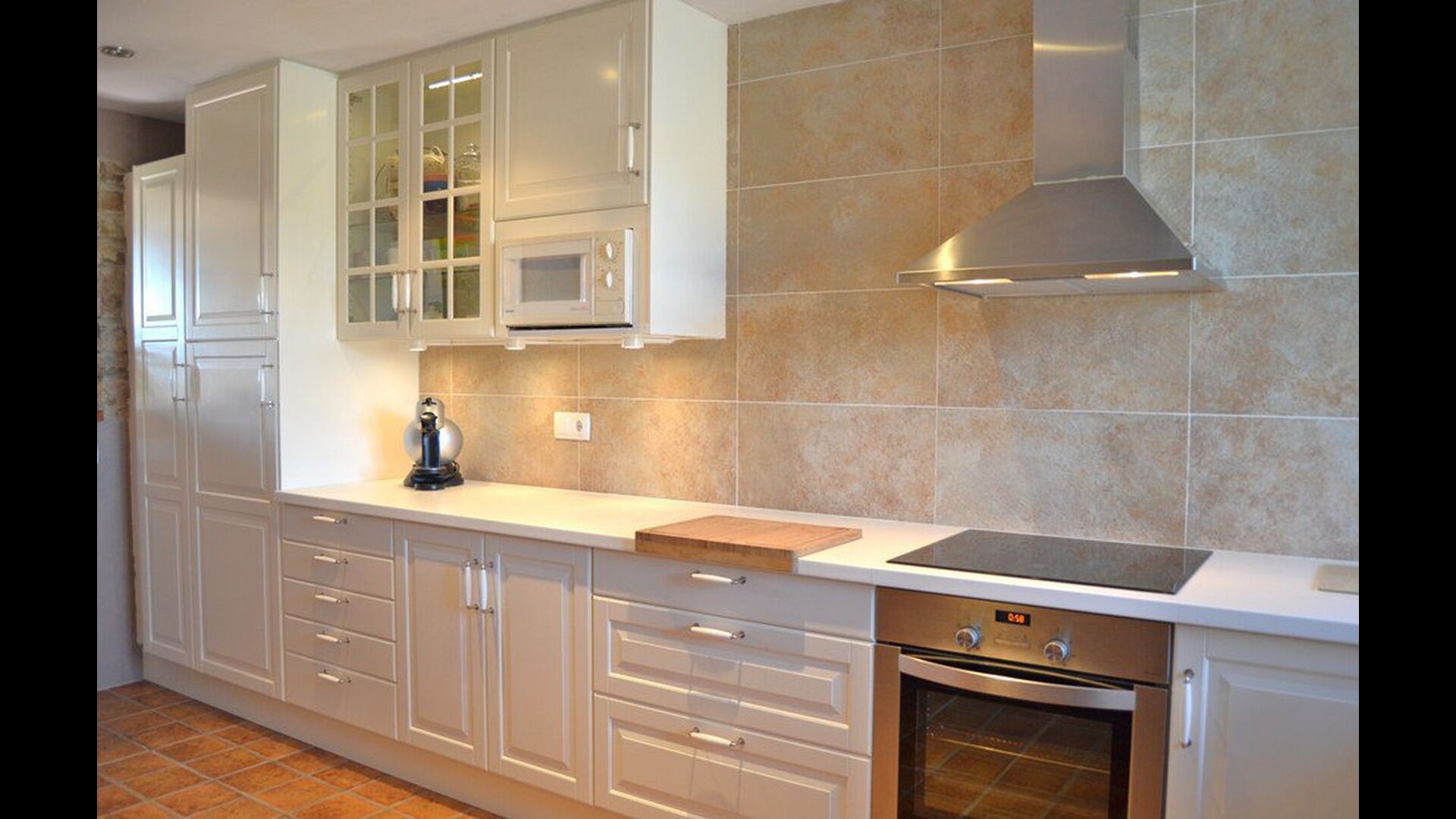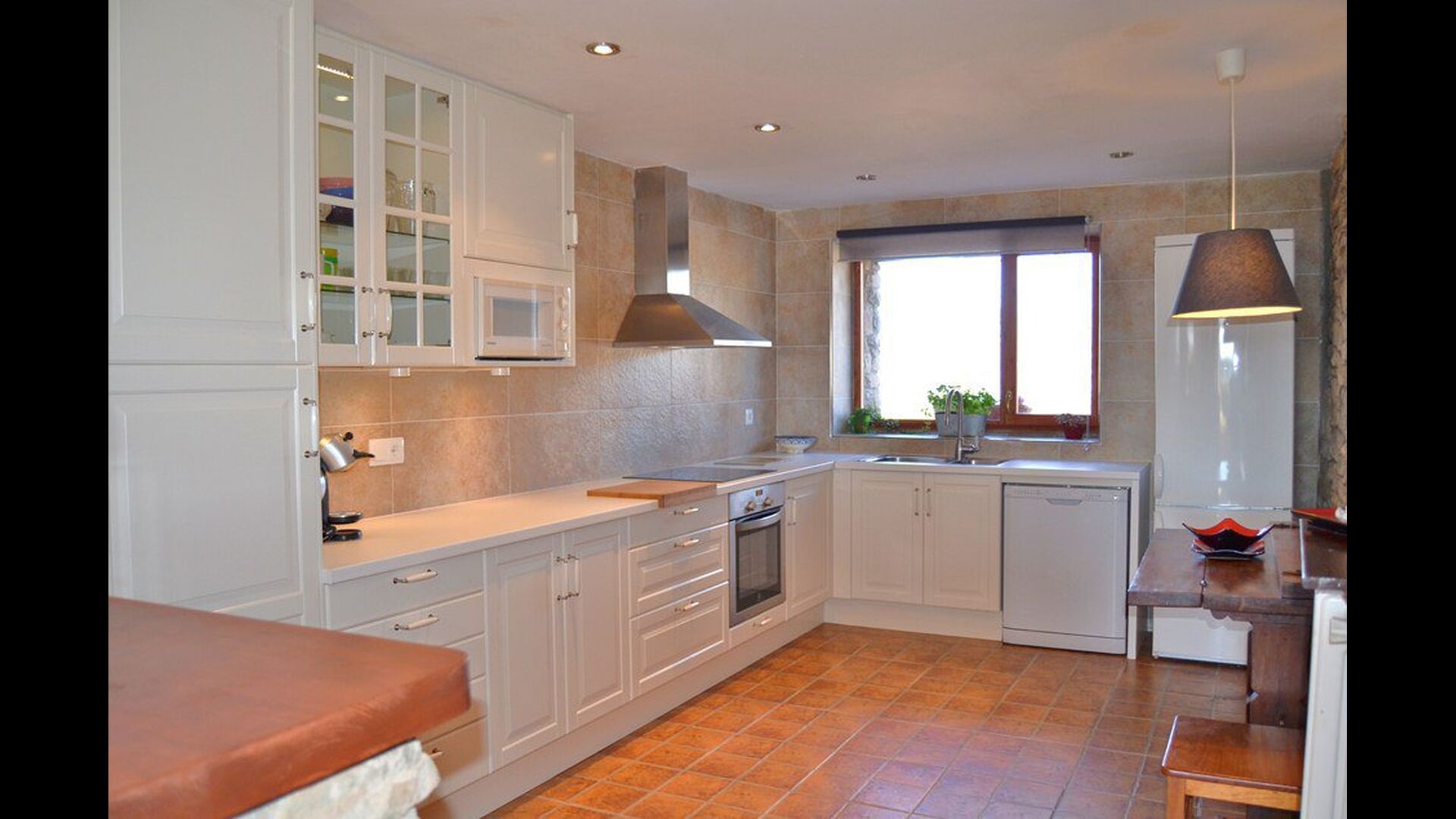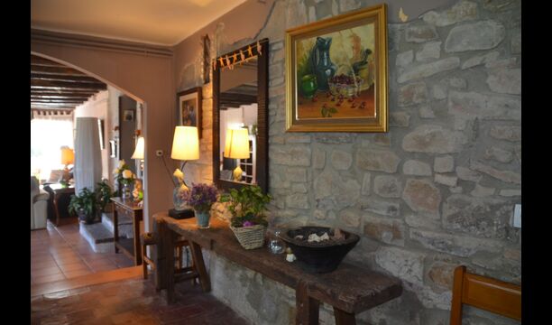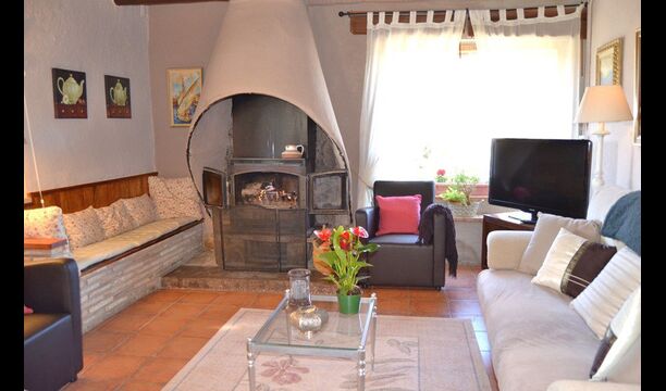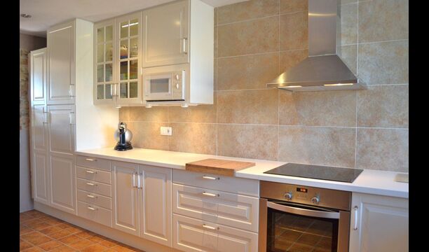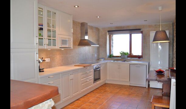 Das schöne Wohnzimmer mit Sofas und einem Kamin ist eine Erweiterung vom Essbereich des Hauses, der mit einem guten traditionellen spanischen Esstisch dekoriert ist. Die Küche ist wirklich schön und sehr geräumig damit es viel Platz für die große Urlaubsgruppe gibt. Es ist mit allen modernen Annehmlichkeiten ausgestattet. Dazu gehören Kühlschrank, Gefrierschrank, gutem großen Backofen, Mikrowelle, Geschirrspüler, Espresso-und Gasherd. Das Haus ist auch mit schneller Wi-Fi, DVD und Musikanlage versehen.