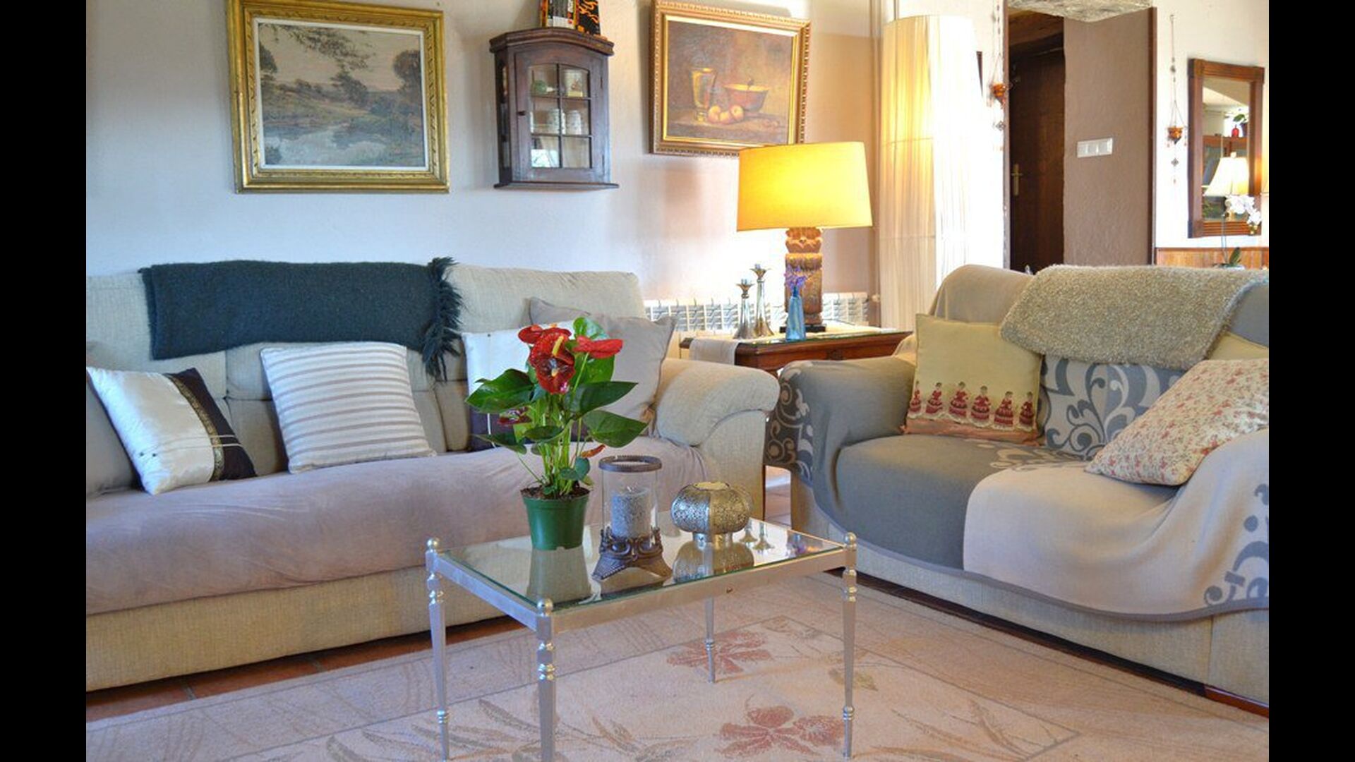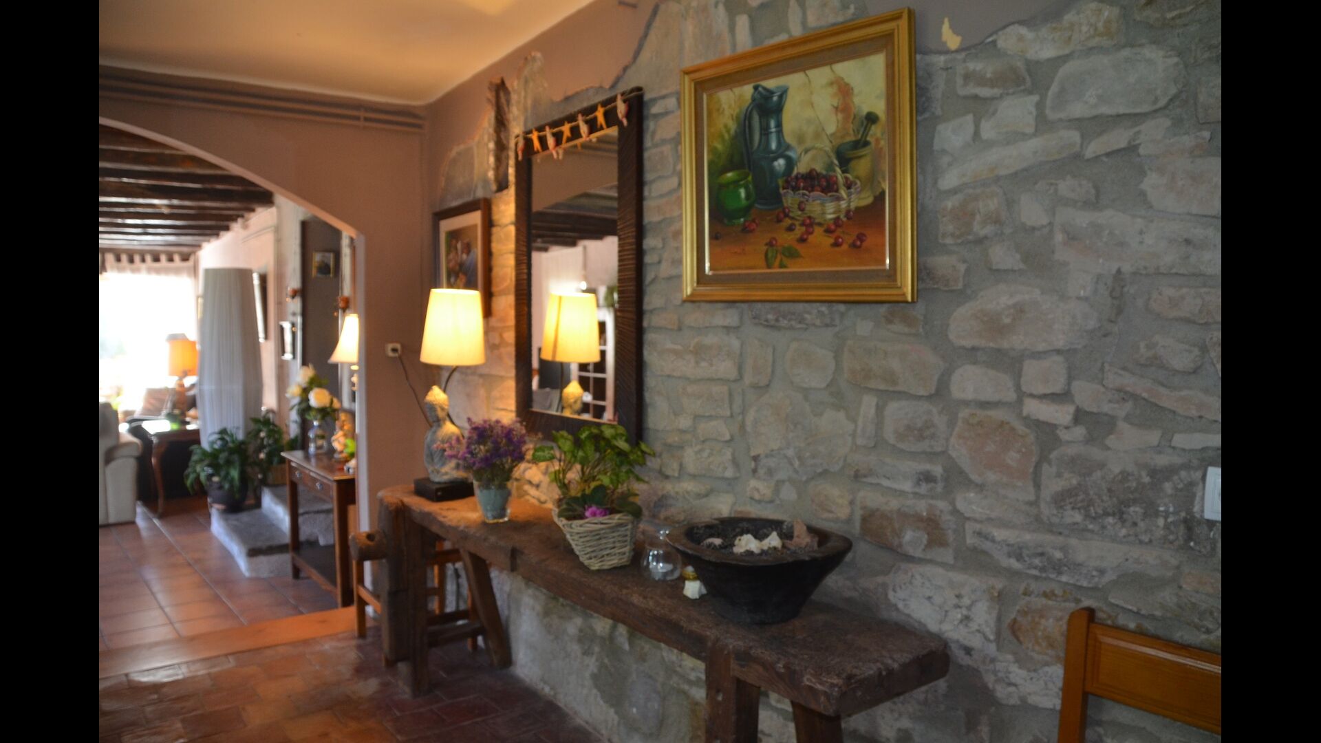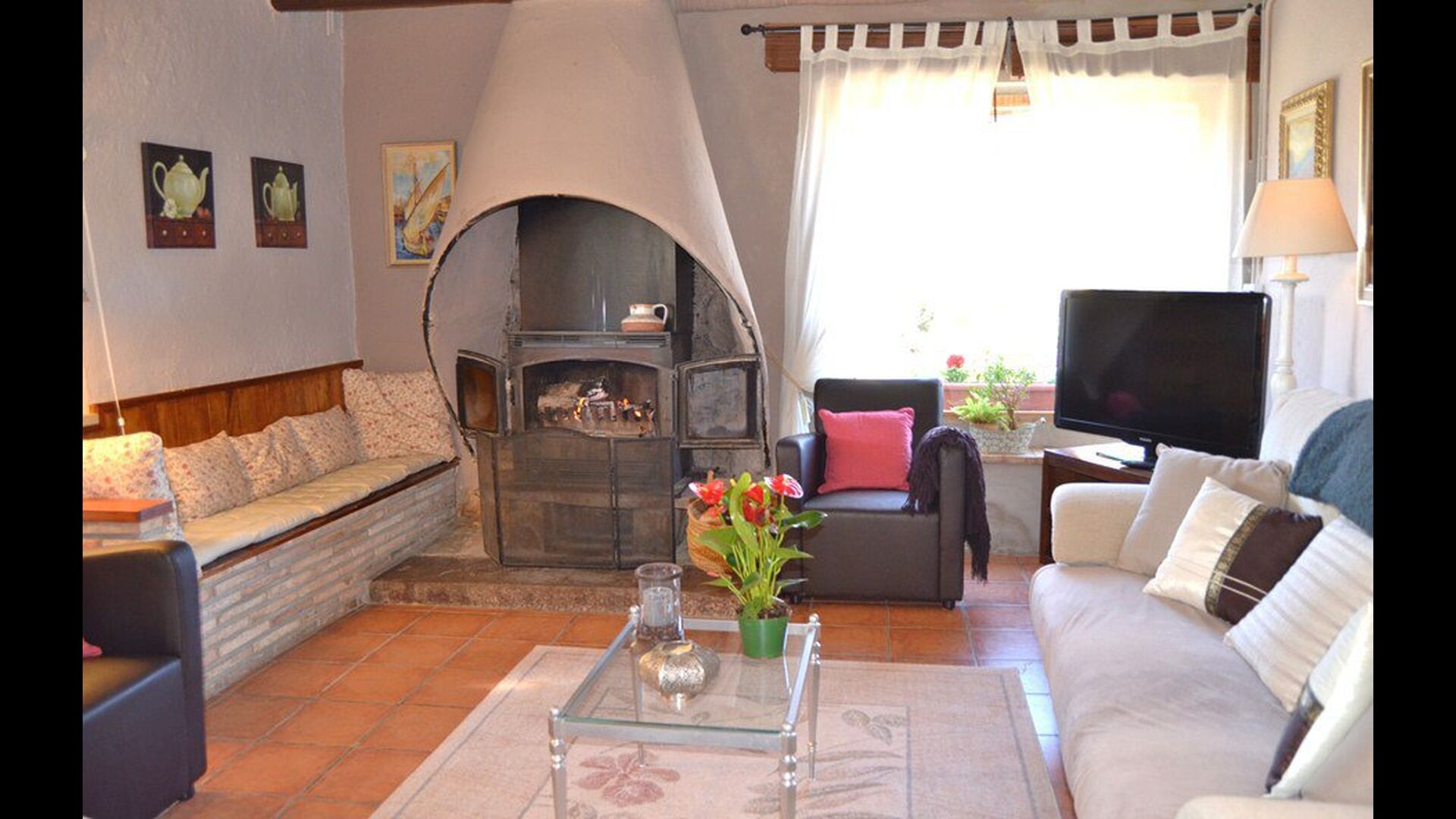 Das schöne Wohnzimmer mit Sofas und einem Kamin ist eine Erweiterung vom Essbereich des Hauses, der mit einem guten traditionellen spanischen Esstisch dekoriert ist. Die Küche ist wirklich schön und sehr geräumig damit es viel Platz für die große Urlaubsgruppe gibt. Es ist mit allen modernen Annehmlichkeiten ausgestattet. Dazu gehören Kühlschrank, Gefrierschrank, gutem großen Backofen, Mikrowelle, Geschirrspüler, Espresso-und Gasherd. Das Haus ist auch mit schneller Wi-Fi, DVD und Musikanlage versehen.
