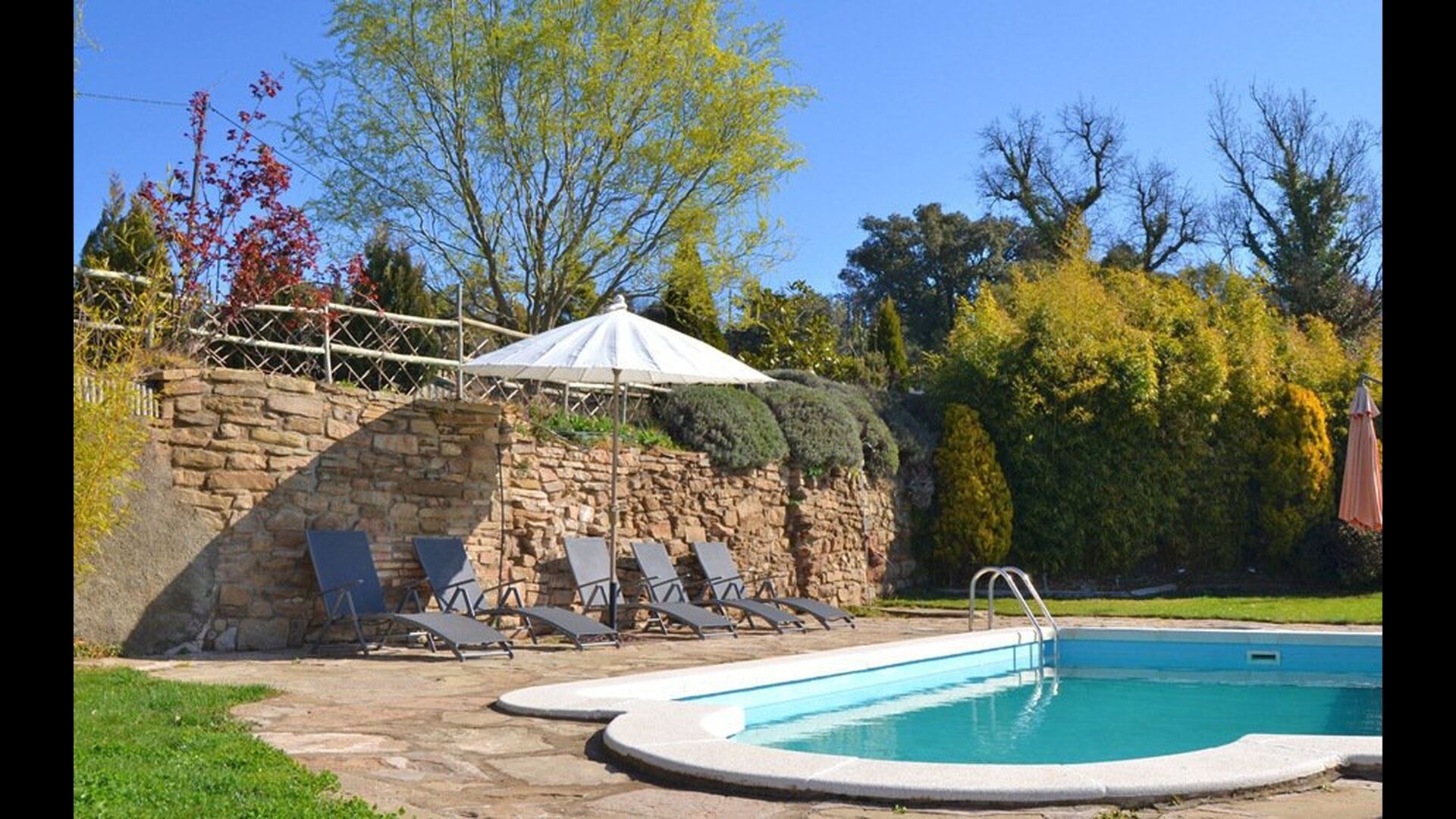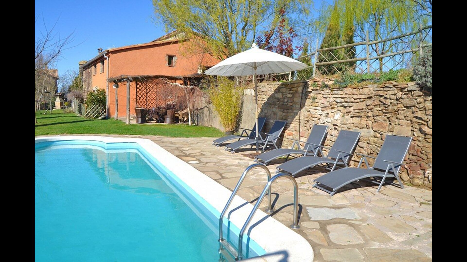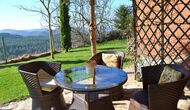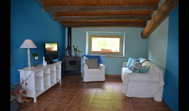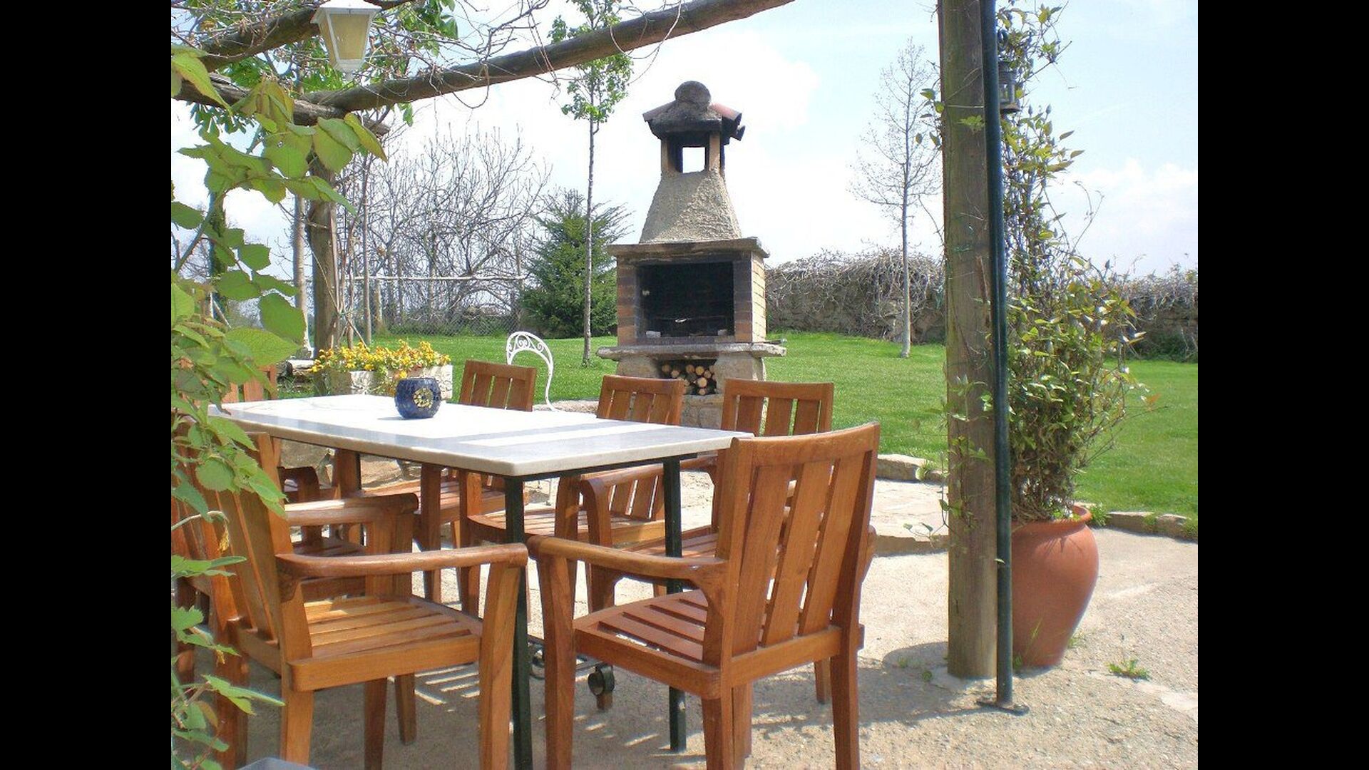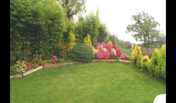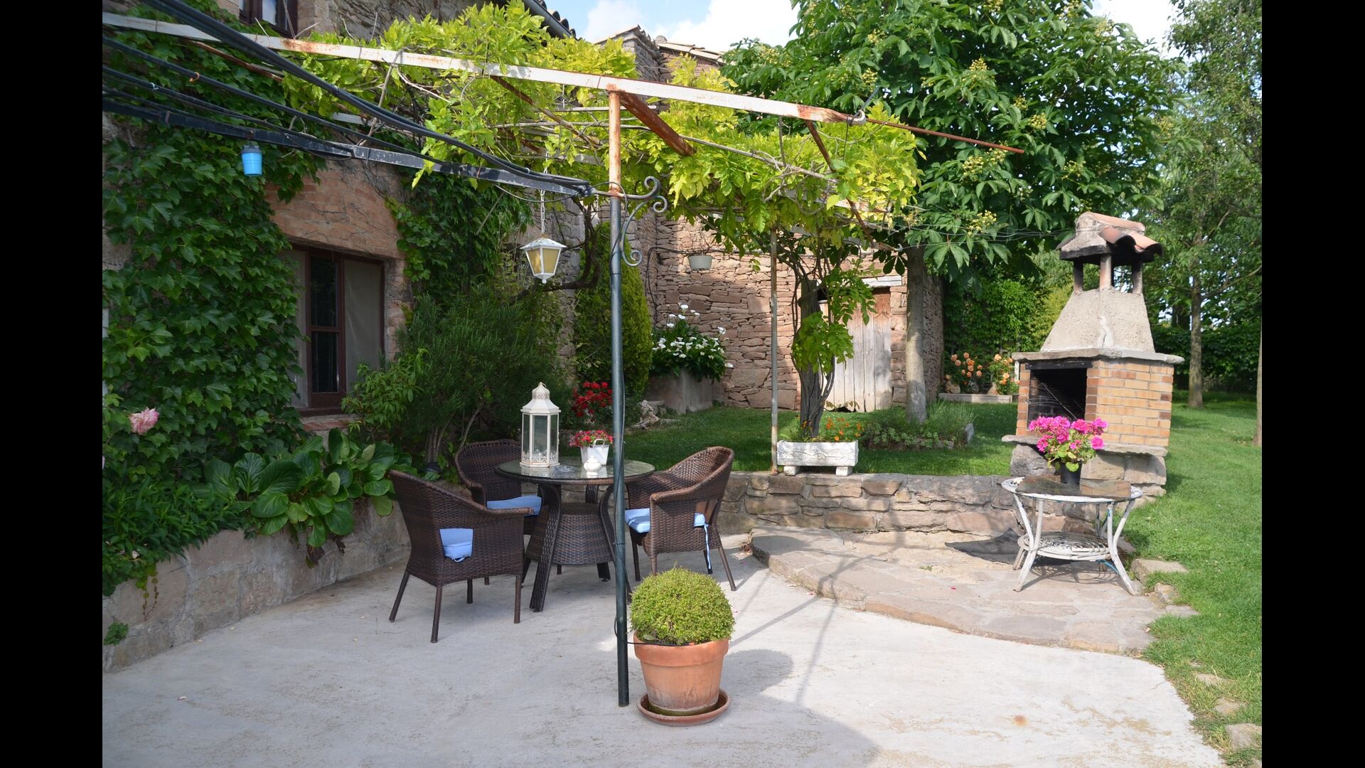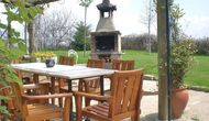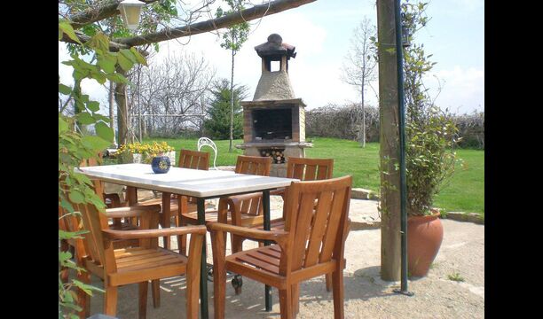 Vor dem Haus finden Sie die Terrassen, alle mit Wein und Blumen, die für die wirklich warme Sommertage überdeckt sind. Hier finden Sie auch den aussen-Essbereich des Hauses sowie den Grillplatz. Von der Terrasse haben Sie einen hervorragenden Blick auf die atemberaubende Landschaft. Am Ende des Gartens befindet sich der Swimmingpool mit genügend Sonnenliegen. Am Ende des Pools gibt es eine Menge von herrlichen Blumen im Sommer.