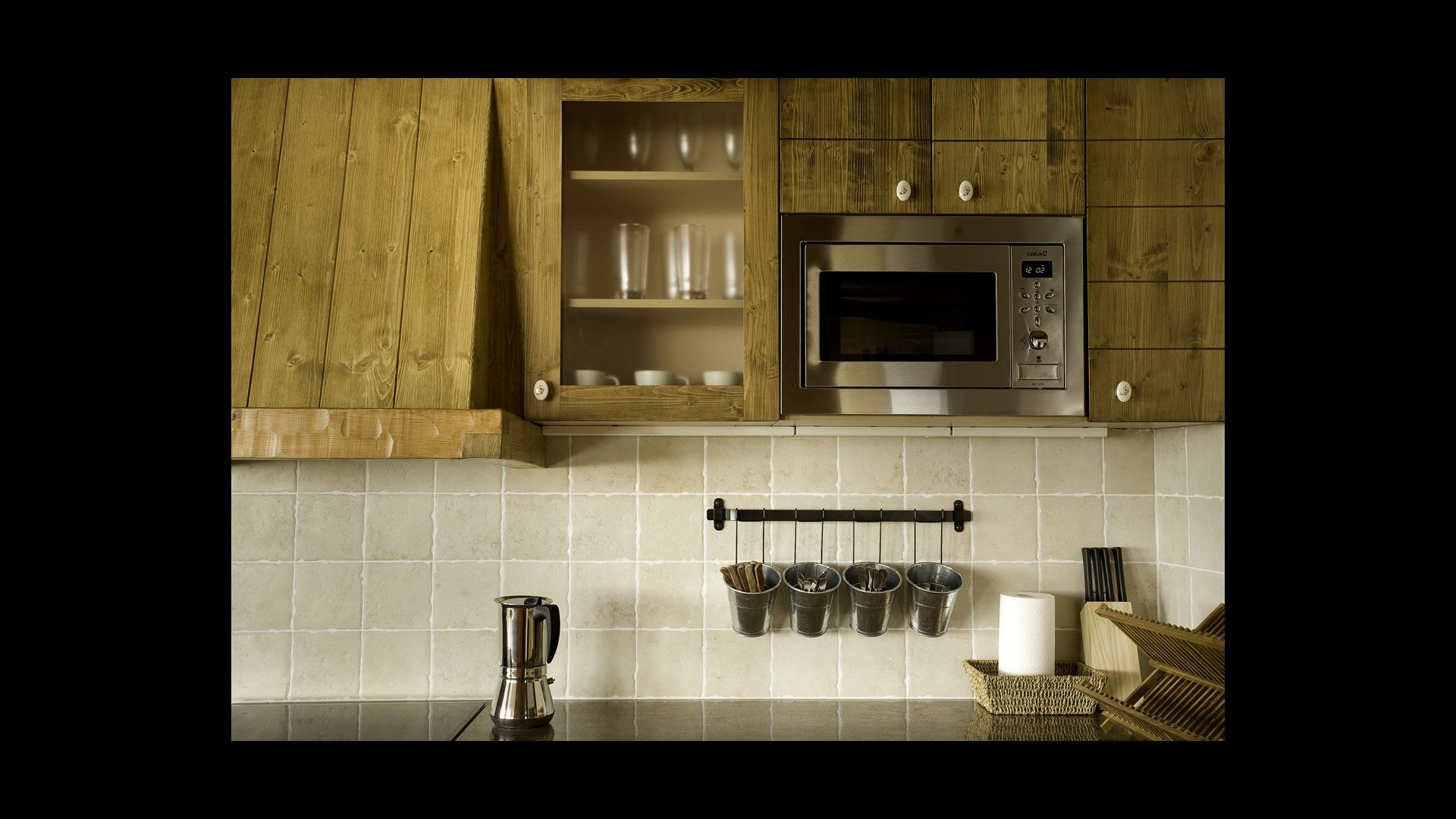 Es gibt einengroßen Gemeinschaftsraum, der den Wohnbereich mit Sofaecke, den Essbereich mit Esstisch und die offene Küche enthält. Die Küche ist komplett ausgestattet mit Backofen, Cerankochplatten, Geschirrspüler, Nespresso und Geschirr.