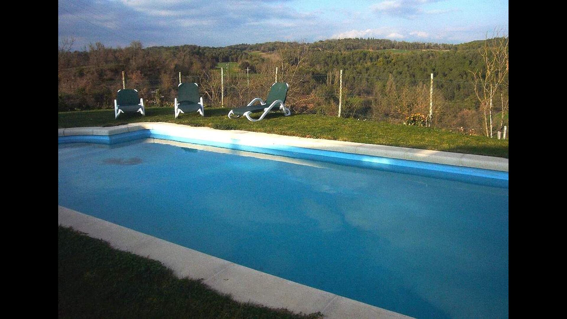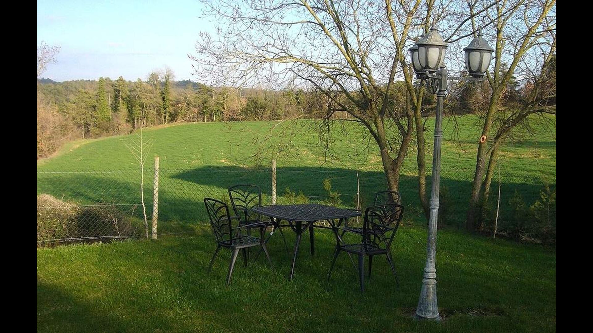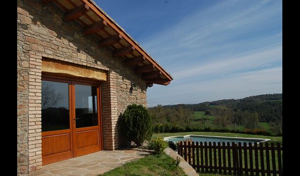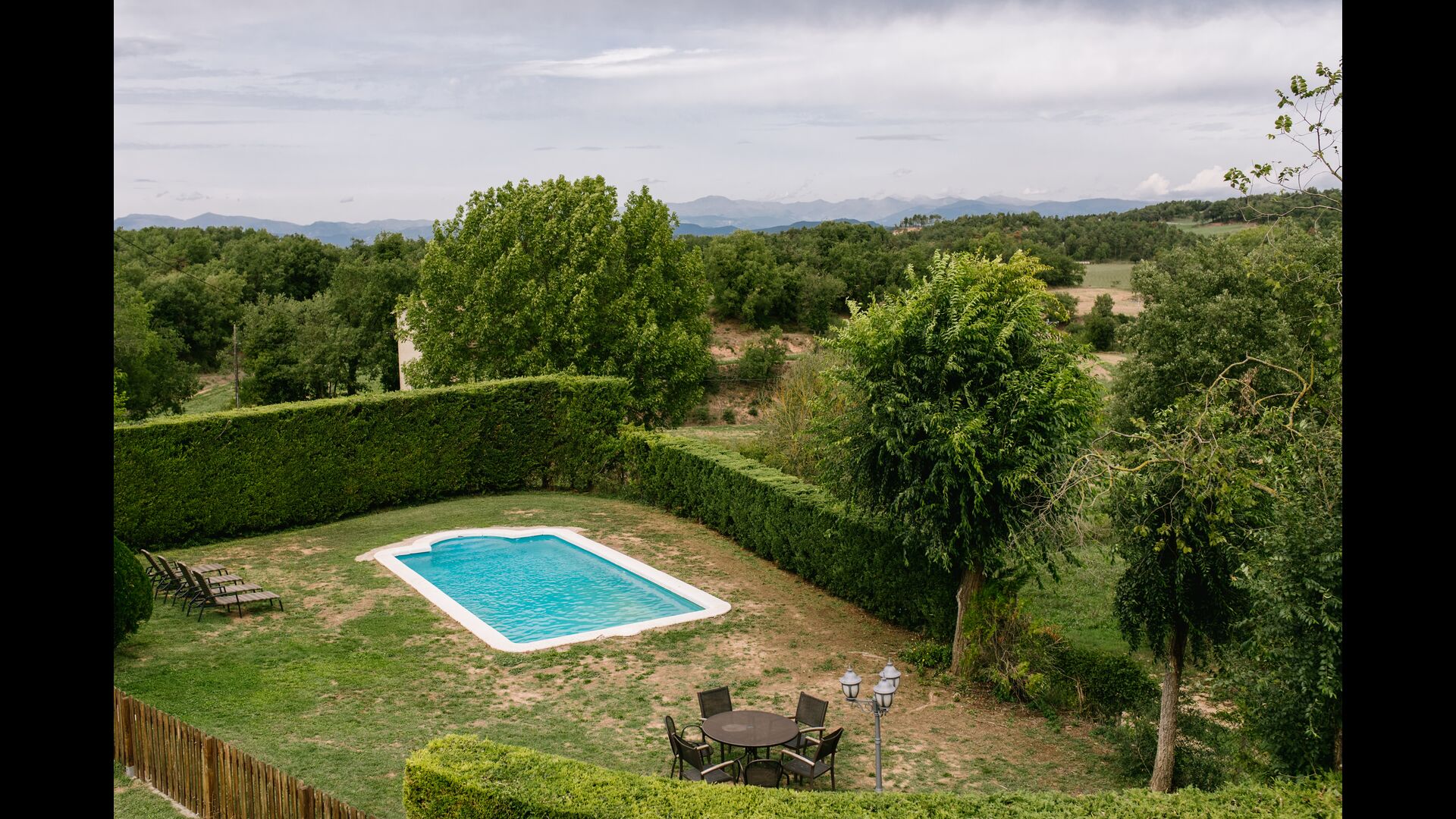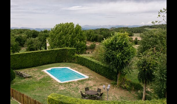 Unterhalb des Hauses, liegt ein eingezäunter Garten mit Swimmingpool und Liegen. Von hier hat man eine atemberaubende Aussicht über die unten liegenden Felder und in den Horizont der Pyrenäen. Das Haus ist von Natur umgeben, weit von den nächsten Nachbarn.
