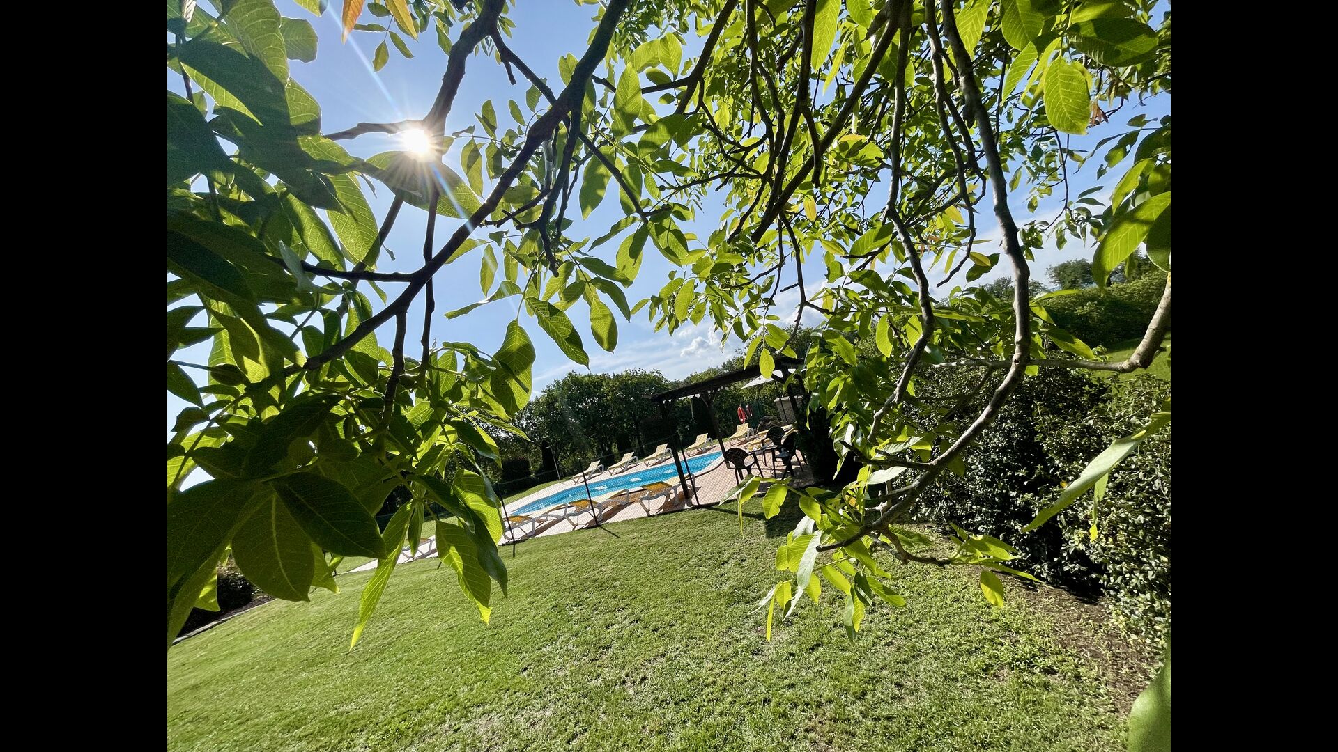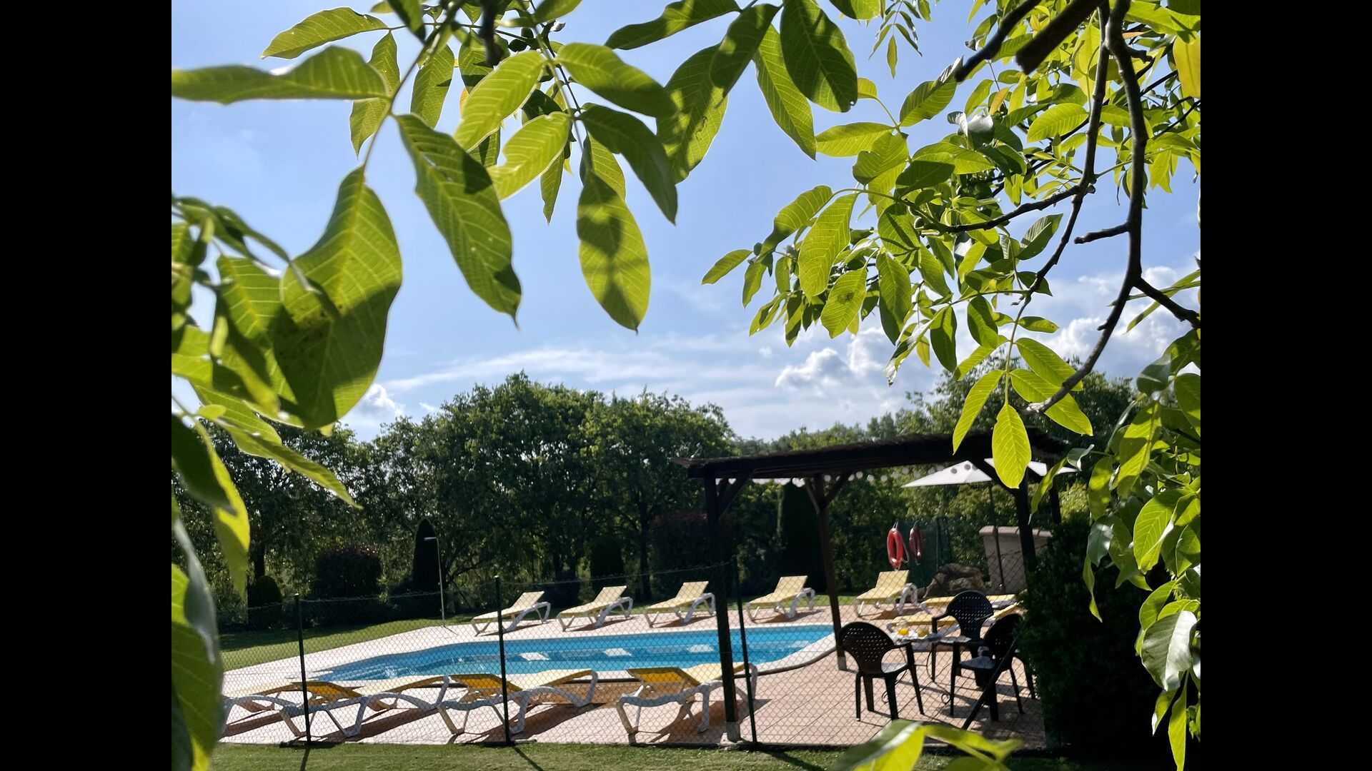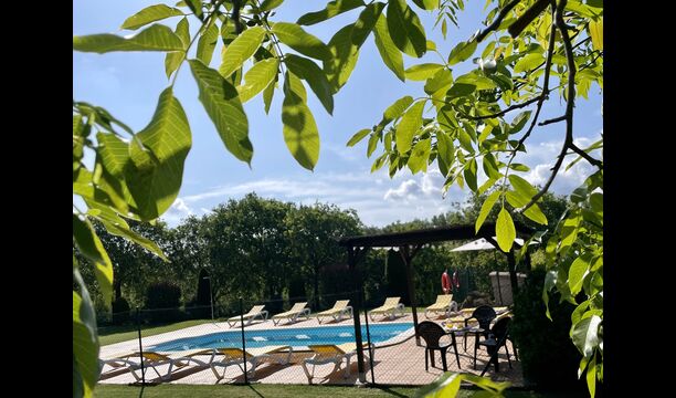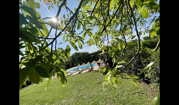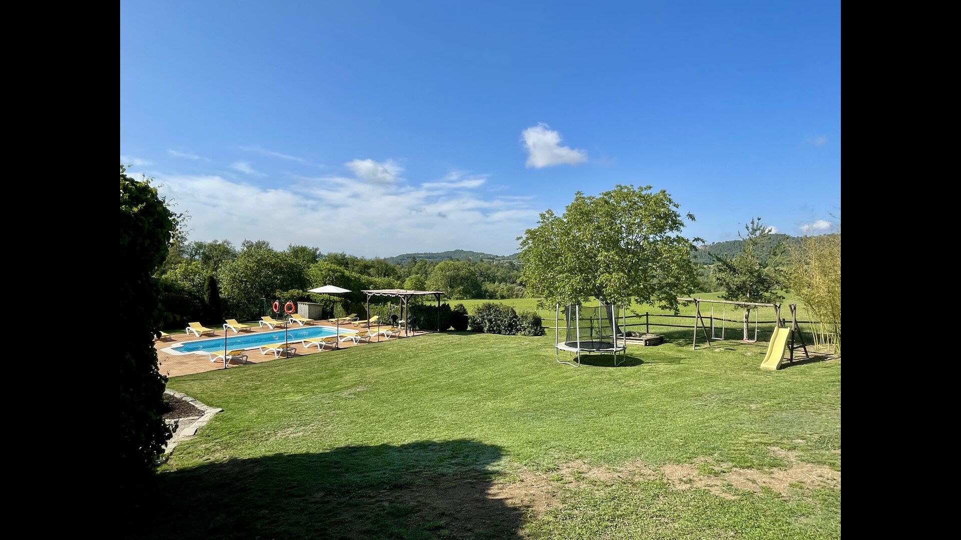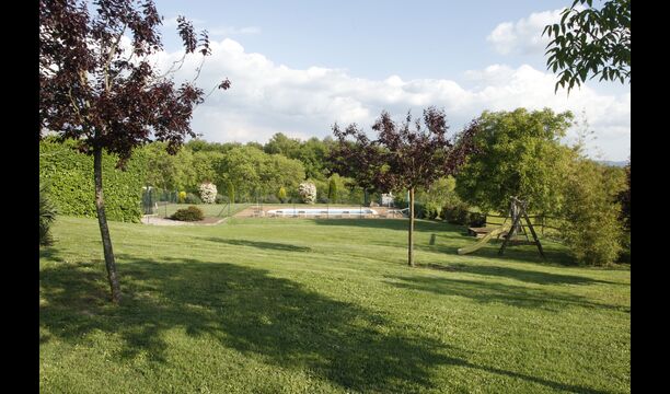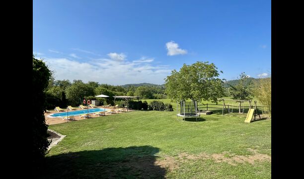Das beeindruckende Tor, das früher groß genug war, um die Pferdekutschen durchzulassen, bietet Zugang zum wunderschönen Garten- und Poolbereich. An einem Ende spendet der Rasen mit einigen Bäumen Schatten. Außerdem gibt es einen Sandkasten und Schaukeln für die Kleinsten sowie einige Tische für leichte Mahlzeiten. Am anderen Ende befindet sich das Schwimmbad mit römischer Treppe, das ist eigentlich sehr schön, wenn Sie kleine Kinder in Ihrer Gruppe haben. Bei einem kühlen Getränk und einem Buch und dem wunderschönen Ausblick über die hügelige Landschaft mit Feldern und Wäldern lassen die Ruhe und Geräusche die letzten Reste des stressigen Alltags verschwinden.
