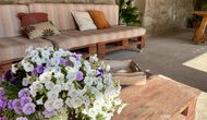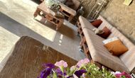 Ruhebereich im Freien mit bequemem Terrassensofa und Sesseln