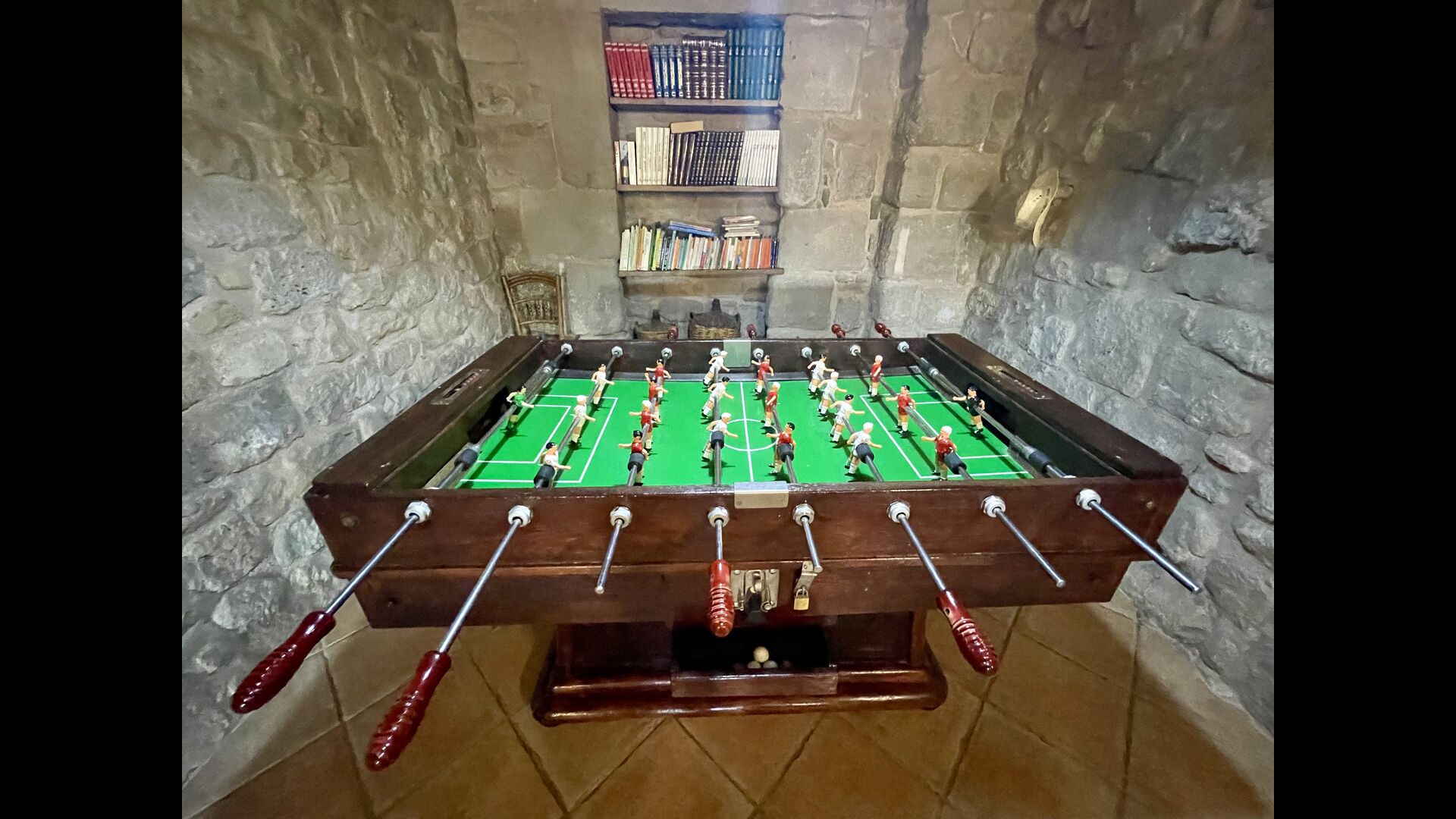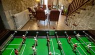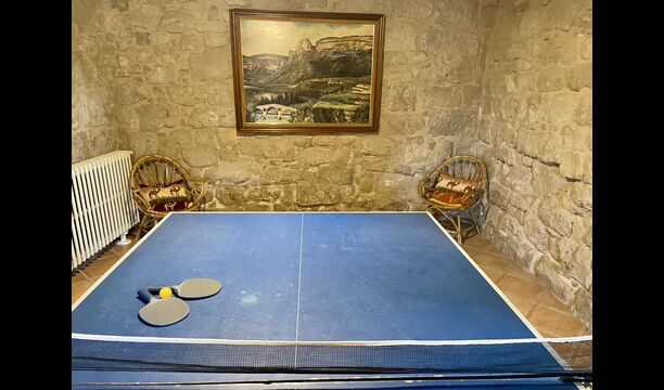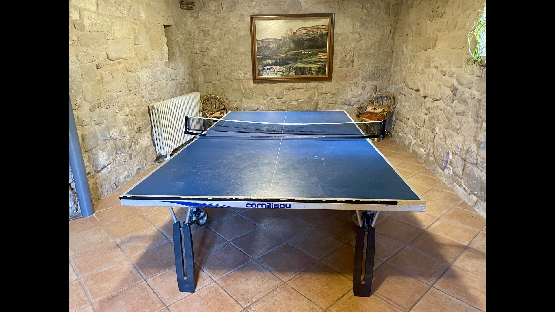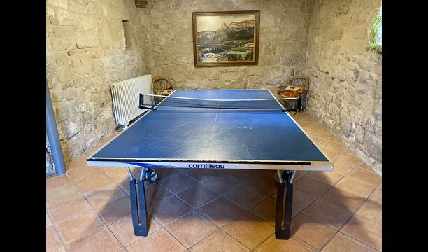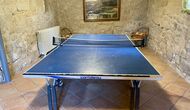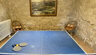 Das Erdgeschoss ist durch eine Treppe verbunden und befindet sich auf der Ebene des geschlossenen Innenhofs und des Gartens. Außerdem gibt es ein Spielzimmer mit Tischtennisplatte. Draußen gelangt man direkt in den sehr großen geschlossenen Innenhof, der viel Platz für die Kinder zum Spielen oder Ballspielen bietet. Außerdem gibt es eine überdachte Veranda mit Grill und Sitzgelegenheiten im Freien für alle sowie einen Sitzbereich im coolen Chill-out-Stil.