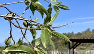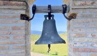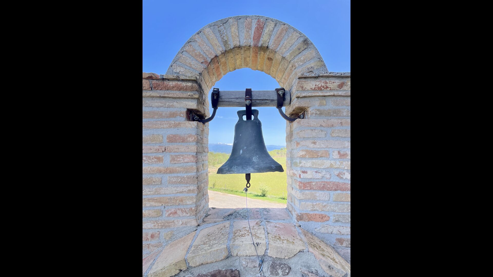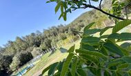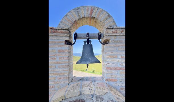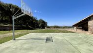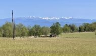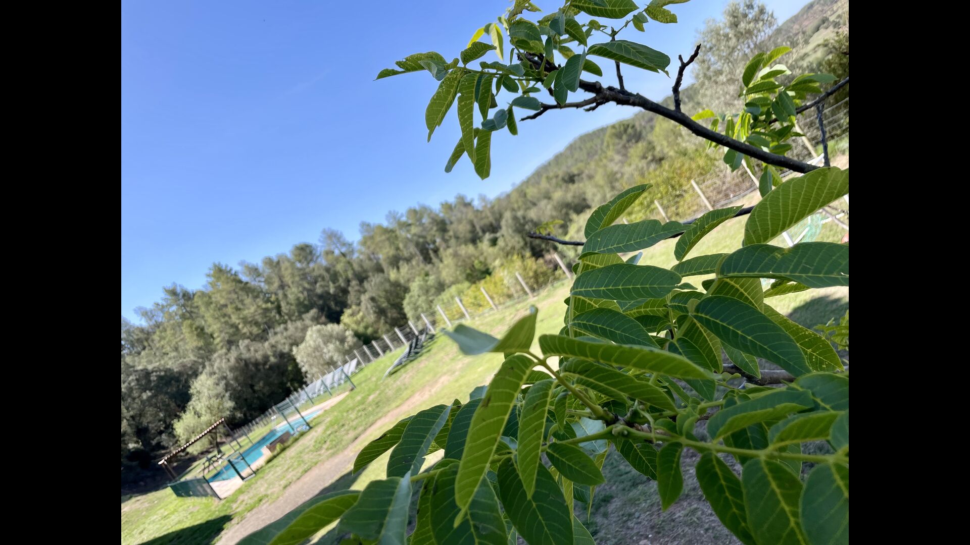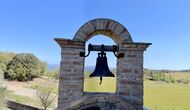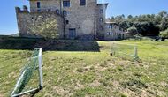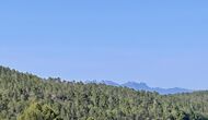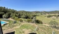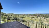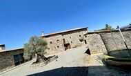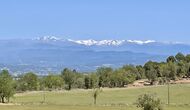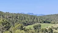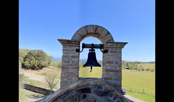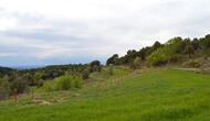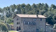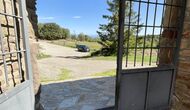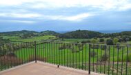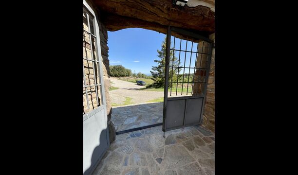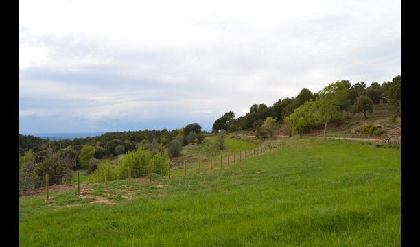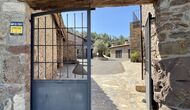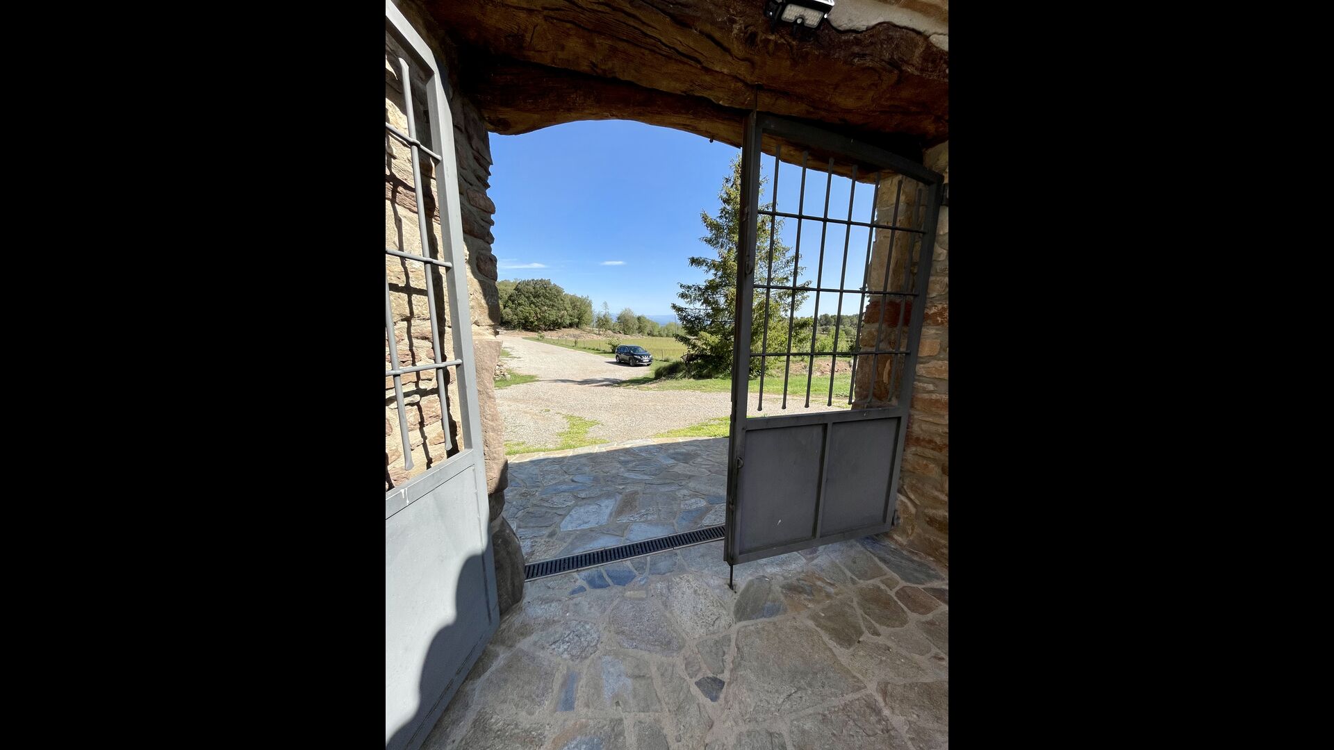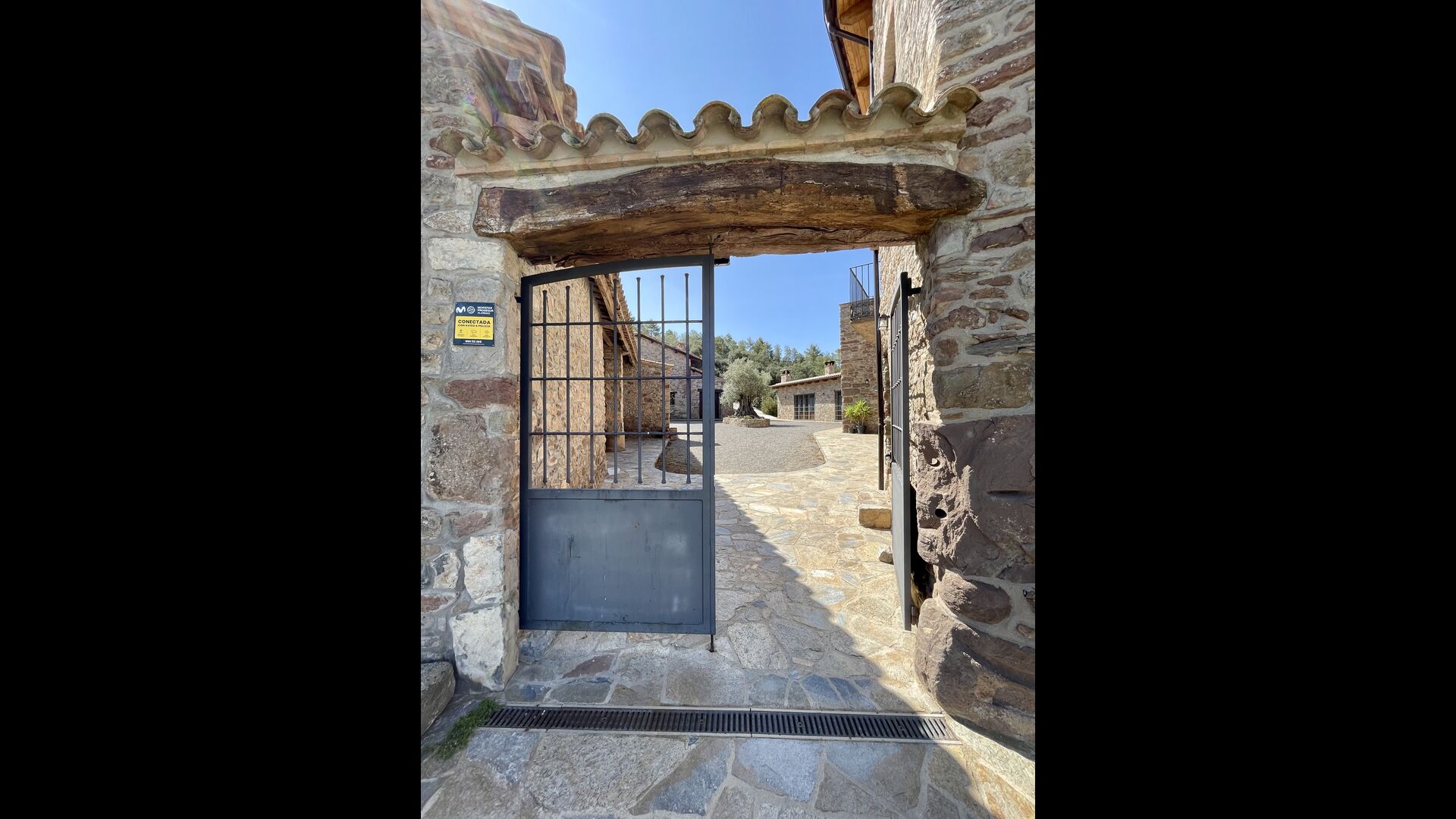 Man fährt durch ein schönes Tor und eine Schotterstraße entlang nach dem Gipfel des Hügels , wo Masia Torrietes gelegen ist, mit Blick auf die umliegende Landschaft mit Wäldern und Feldern .