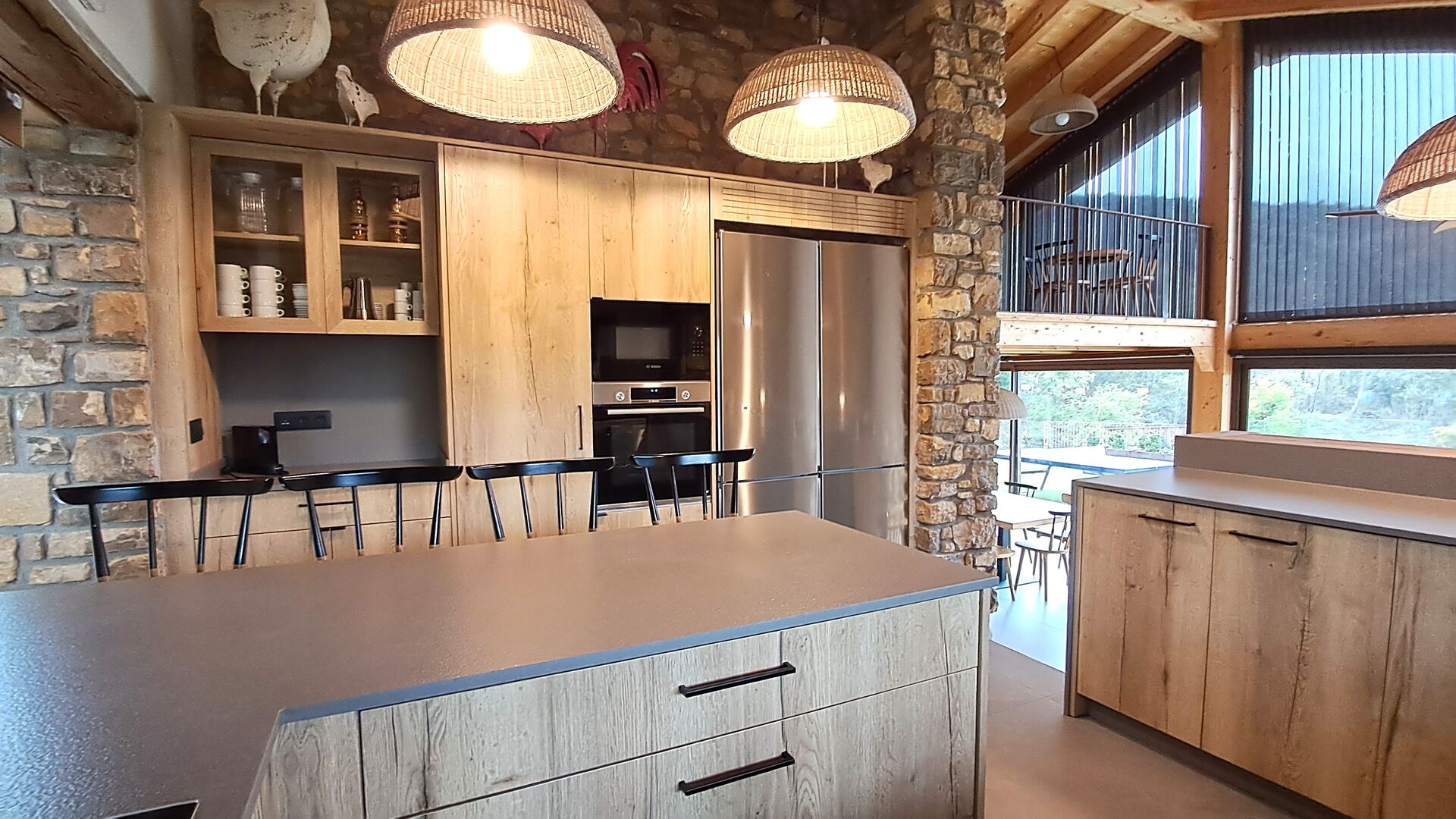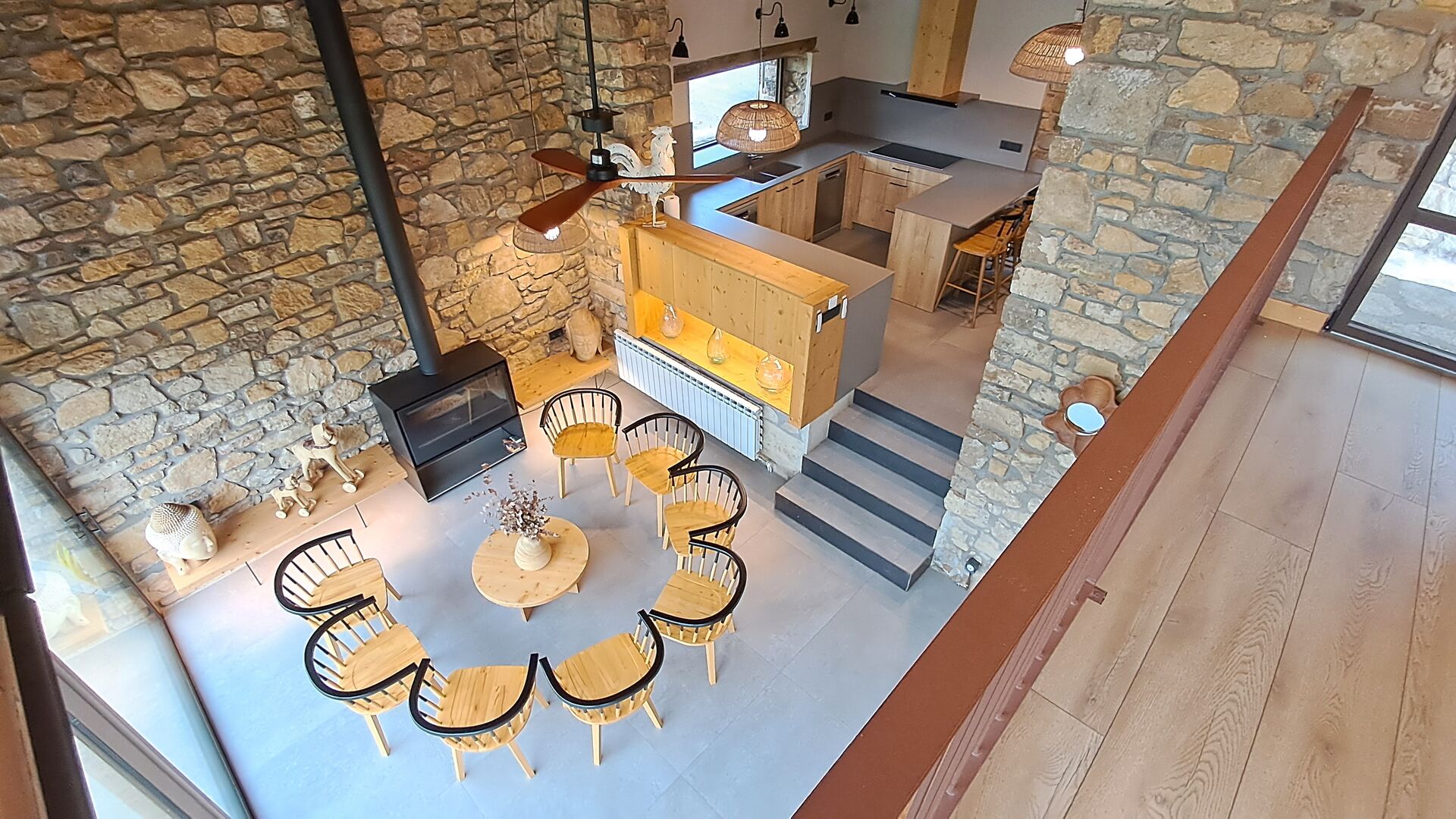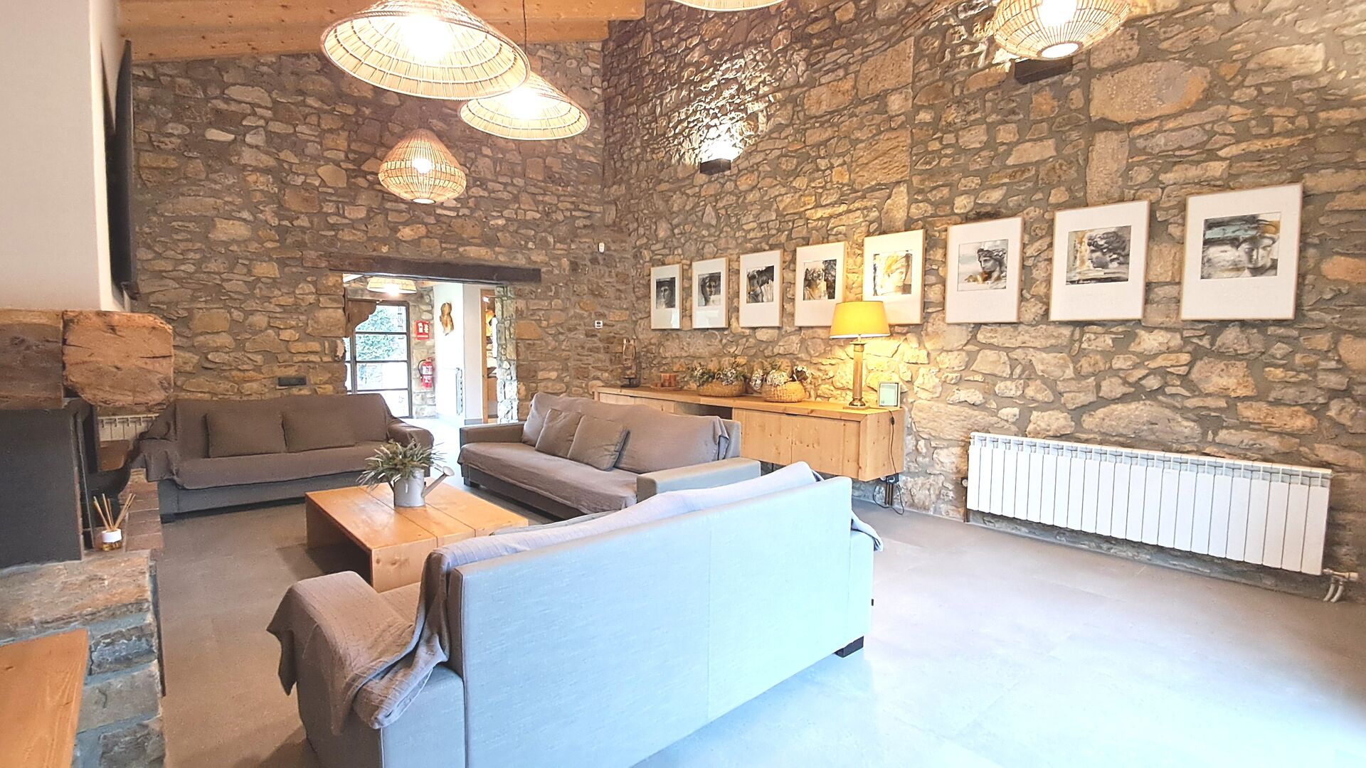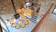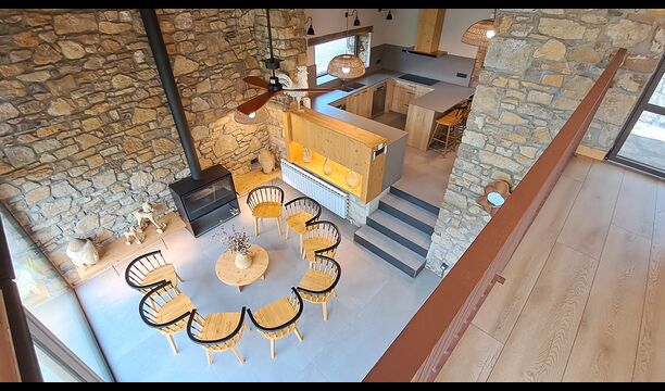 Im Inneren erwartet Sie ein stilvoller Aufenthaltsraum mit Kamin, ein gemütlicher Wohnbereich, der rustikalen Charme mit modernem Komfort verbindet.