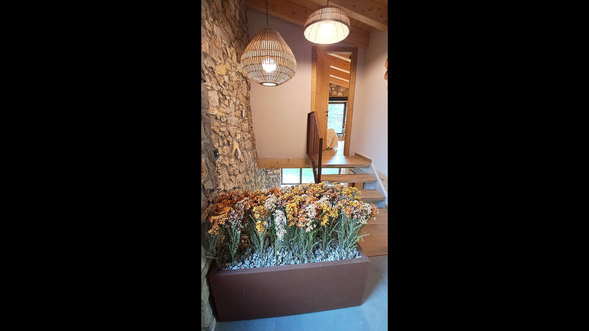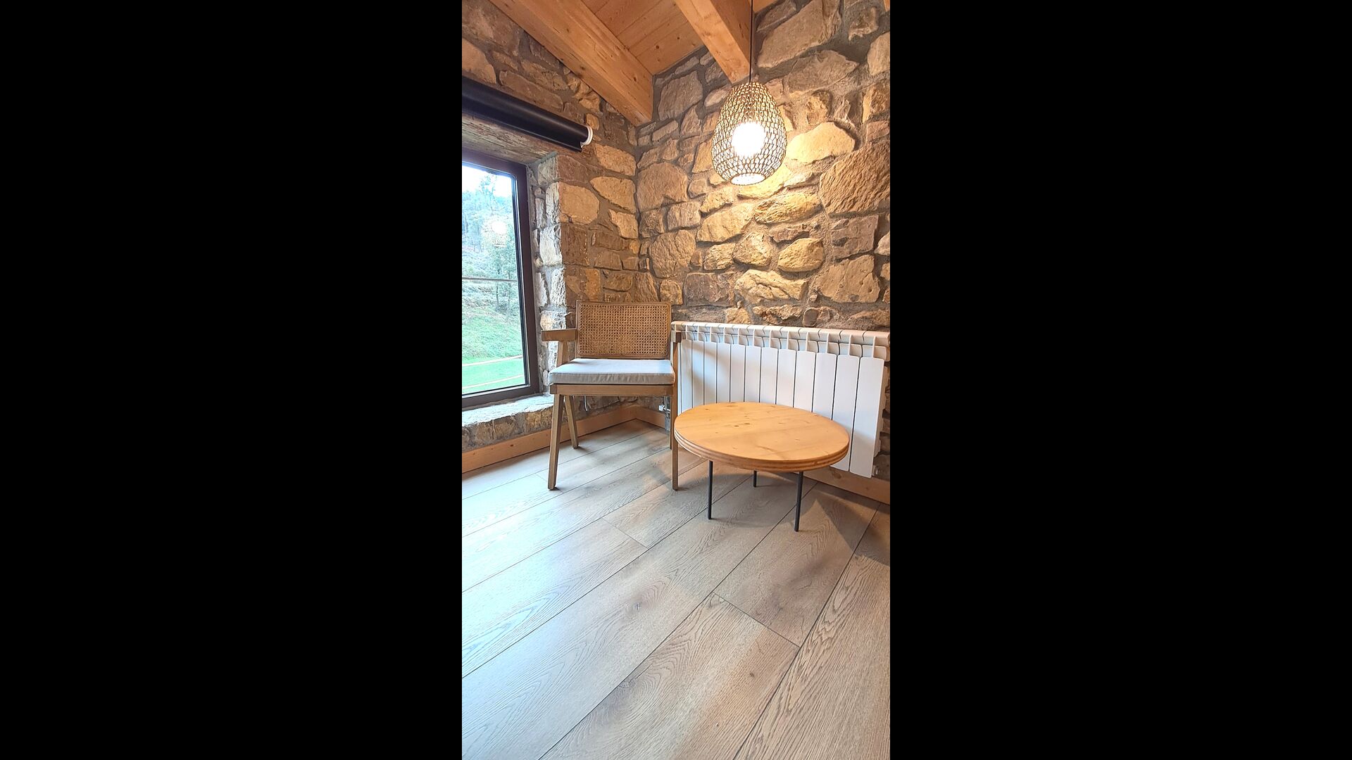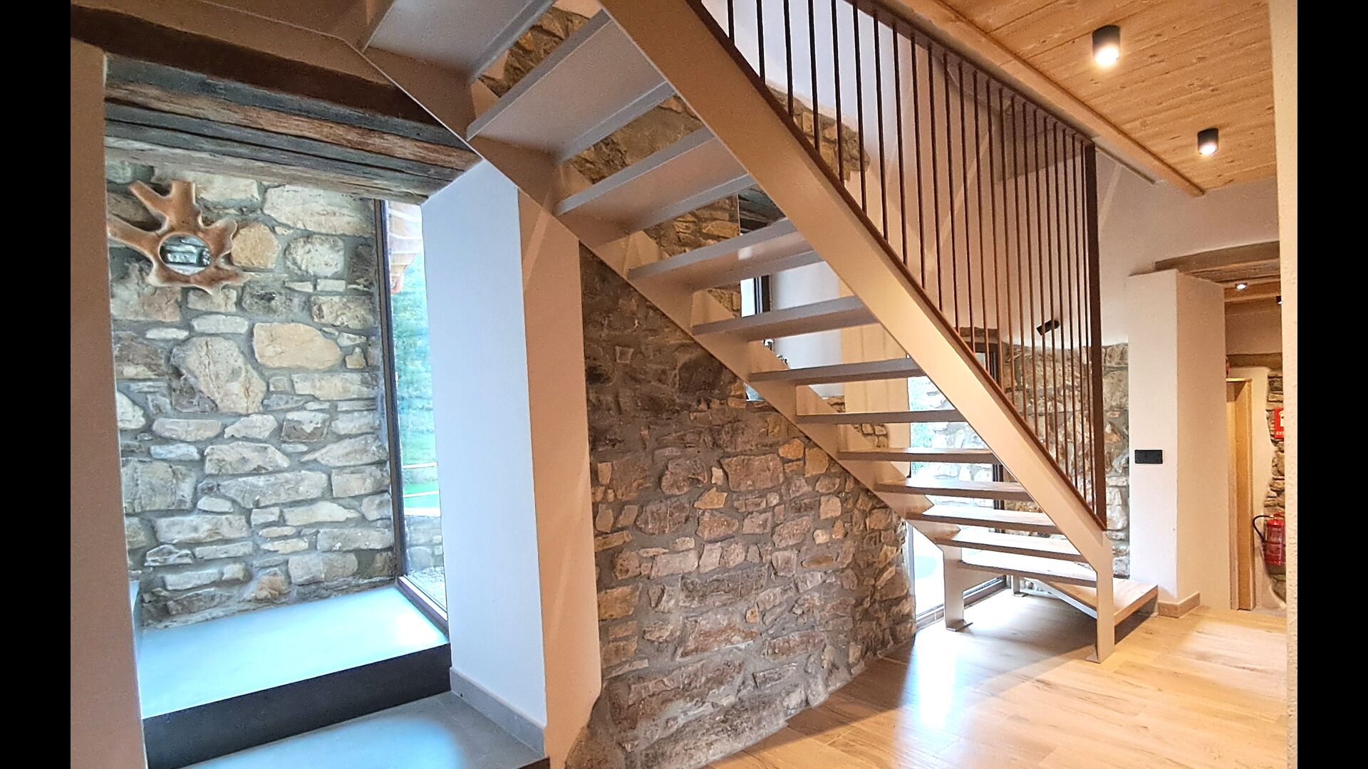 Im Inneren erwartet Sie ein stilvoller Aufenthaltsraum mit Kamin, ein gemütlicher Wohnbereich, der rustikalen Charme mit modernem Komfort verbindet.