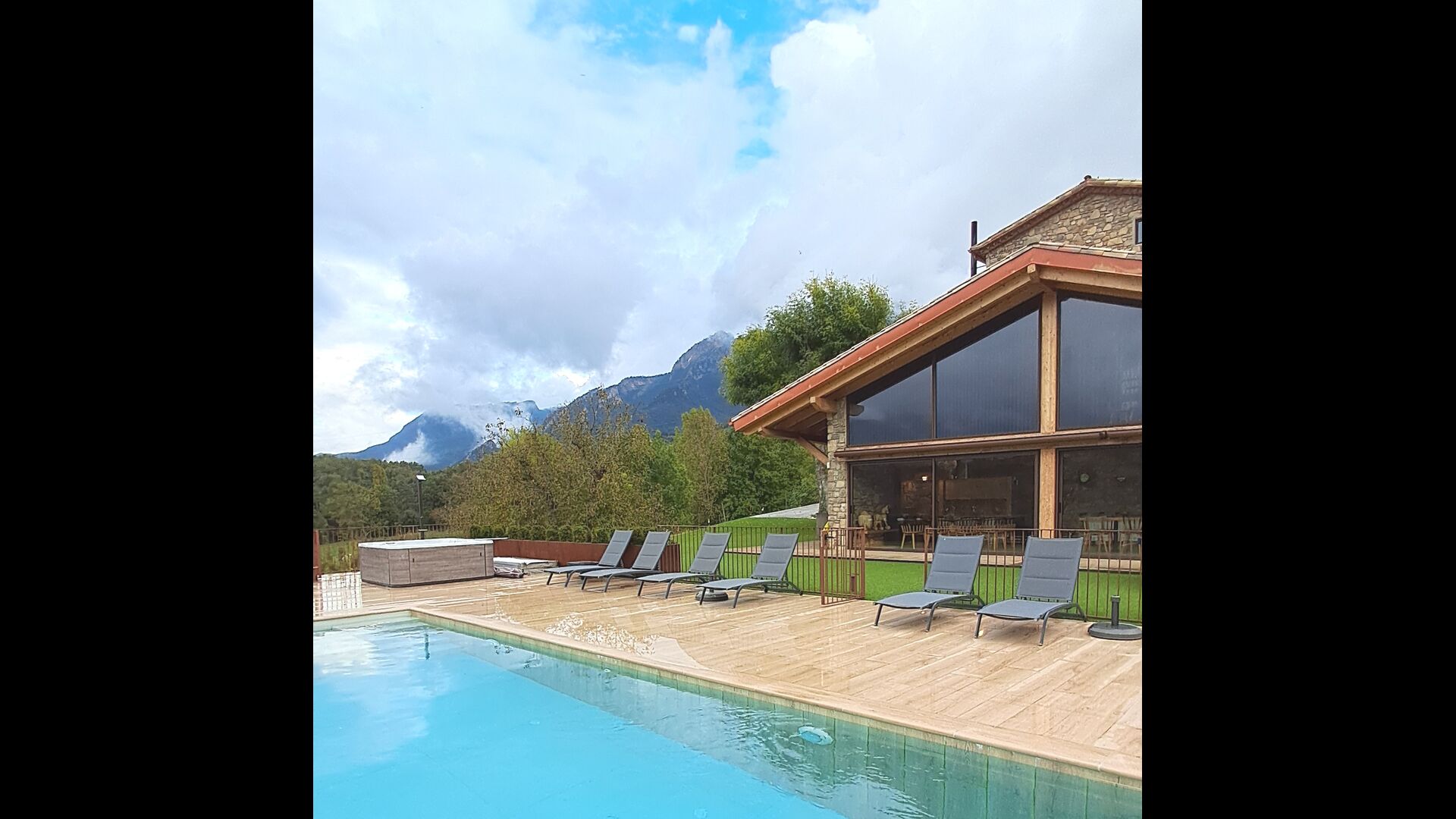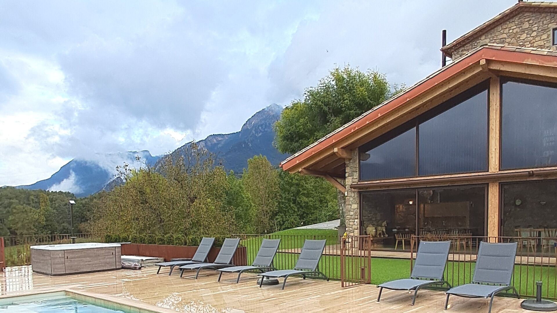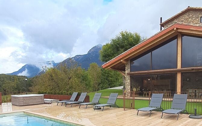 Der private Swimmingpool und der großzügige Garten bieten einen unverbauten Blick auf die Berge, während der Grillbereich und die sonnigen Terrassen es leicht machen, jeden Moment der frischen Bergluft zu genießen. Im Winter wird das Erlebnis mit dem Außenwhirlpool geradezu magisch, in dem bis zu acht Gäste entspannen können, während sie die schneebedeckten Gipfel der Pyrenäen bewundern.
