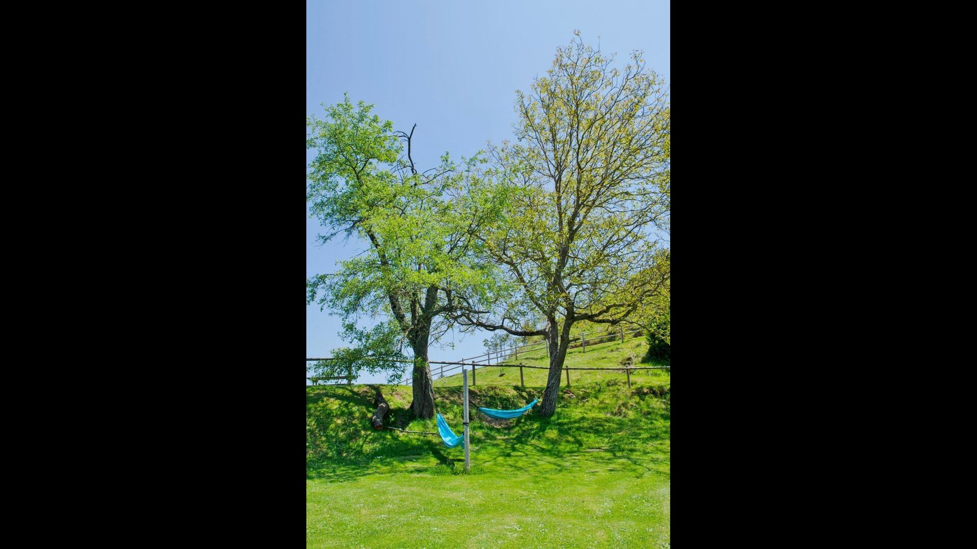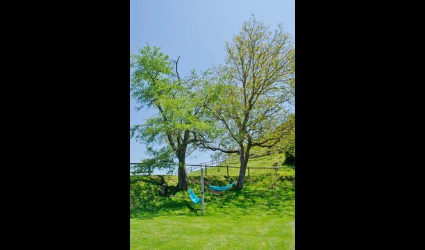Für diejenigen, die sich entspannen wollen, gibt es Hängematten im Schatten von zwei Bäumen.