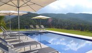 Das Haus ist auf einem Hügel gebaut, und der eingezäunte Poolbereich ist oberhalb des Hauses, und profitiert von der atemberaubenden Aussicht profitieren. Am Haus befindet sich eine überdachte Terrasse mit Grill, und vor der Terrasse , die Spielfläche.