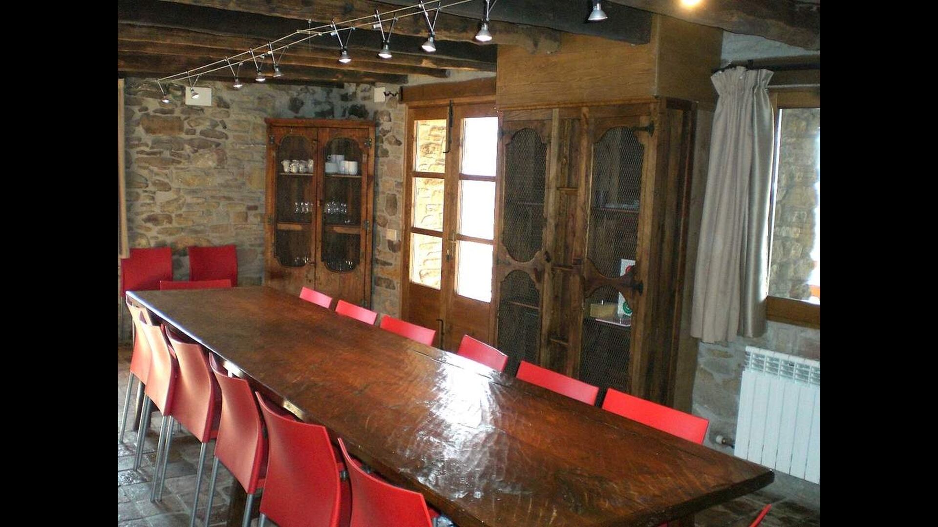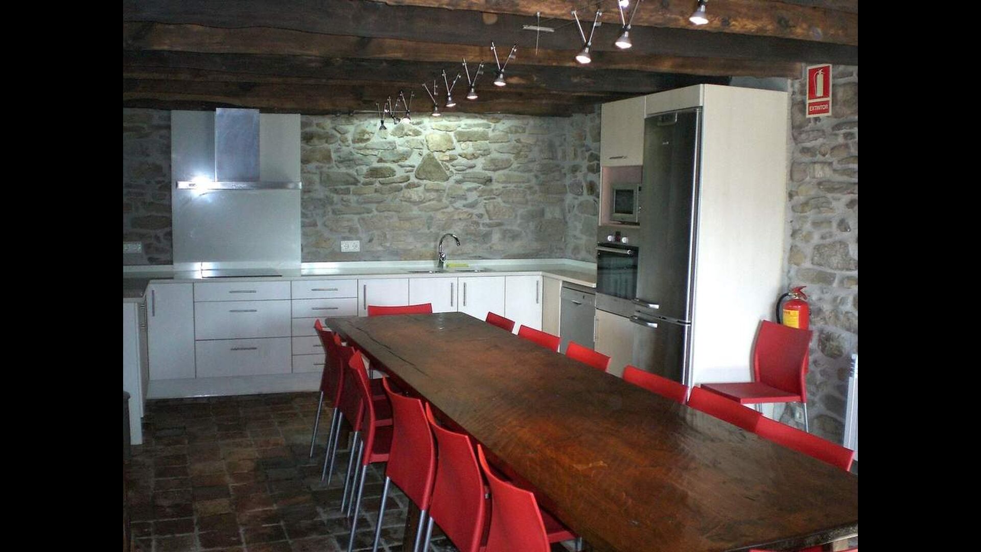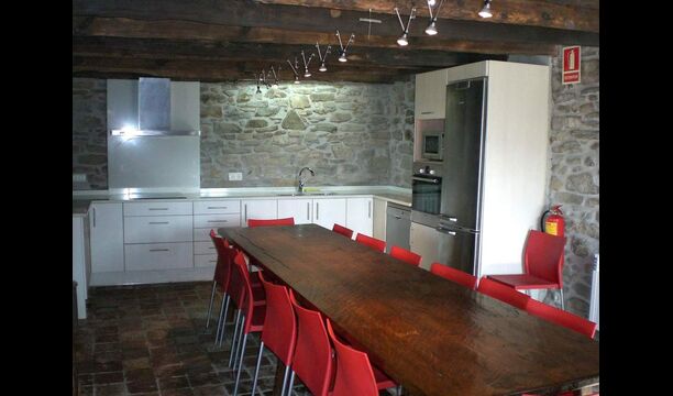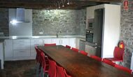 Casa Ferrera verbindet traditionelle katalanische Architektur mit modernem Komfort. Im Erdgeschoss befinden sich ein einladendes Wohnzimmer mit Kamin und Fernseher, ein großer Essbereich für gemeinsame Mahlzeiten sowie eine vollständig ausgestattete Küche, die speziell für Gruppenaufenthalte konzipiert ist. Ein Badezimmer mit Waschmaschine sorgt für zusätzlichen Komfort bei längeren Aufenthalten.