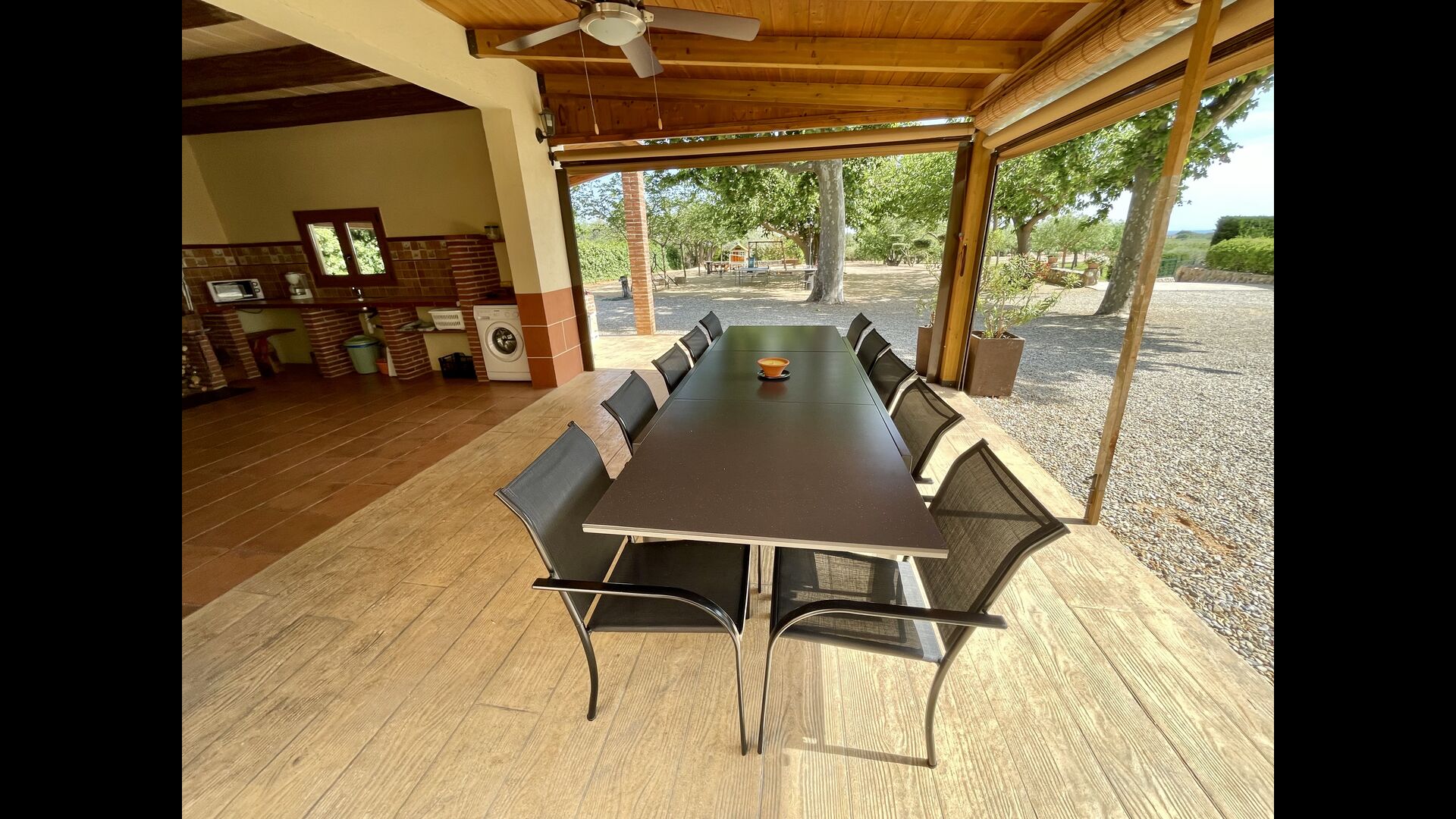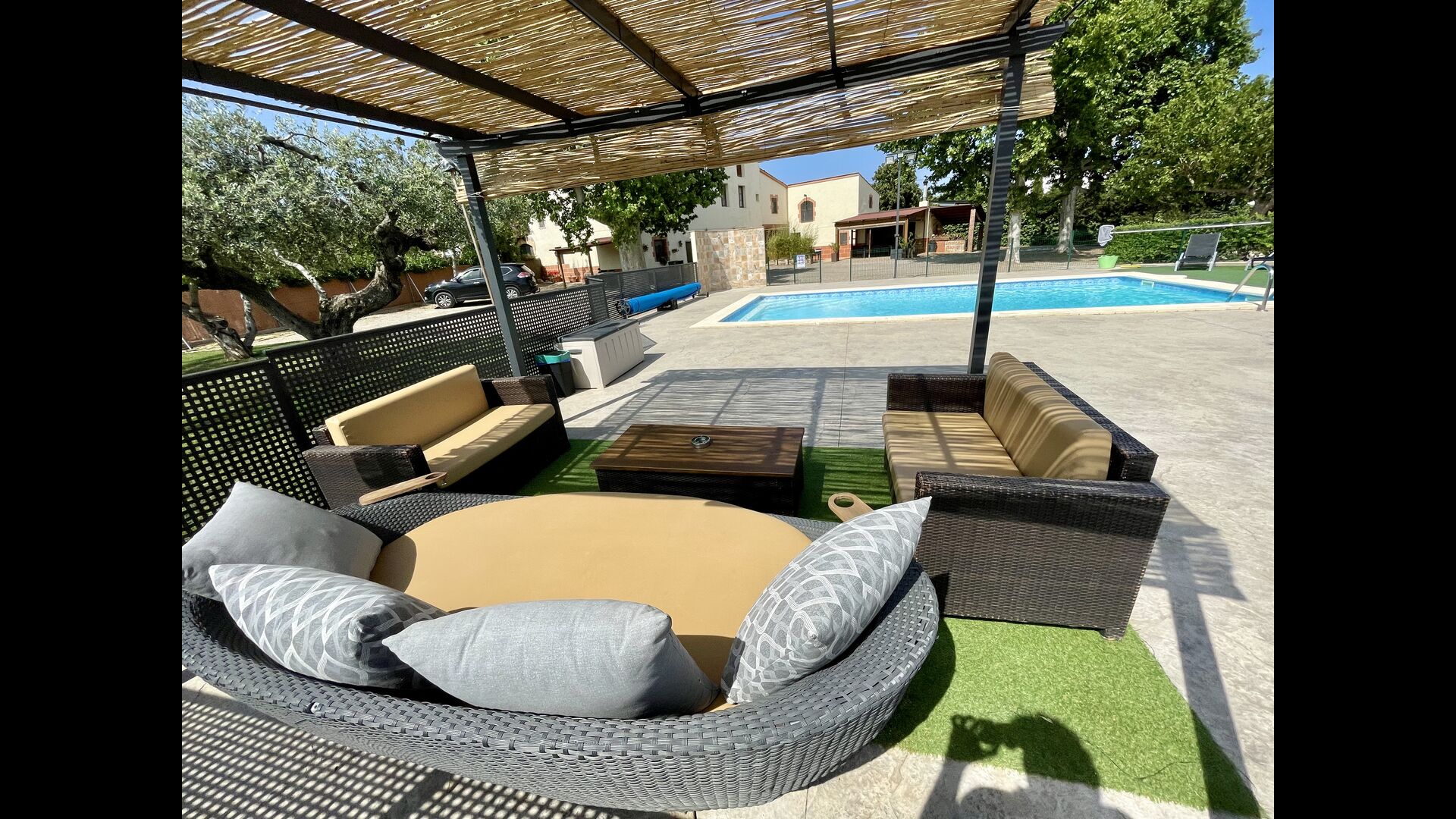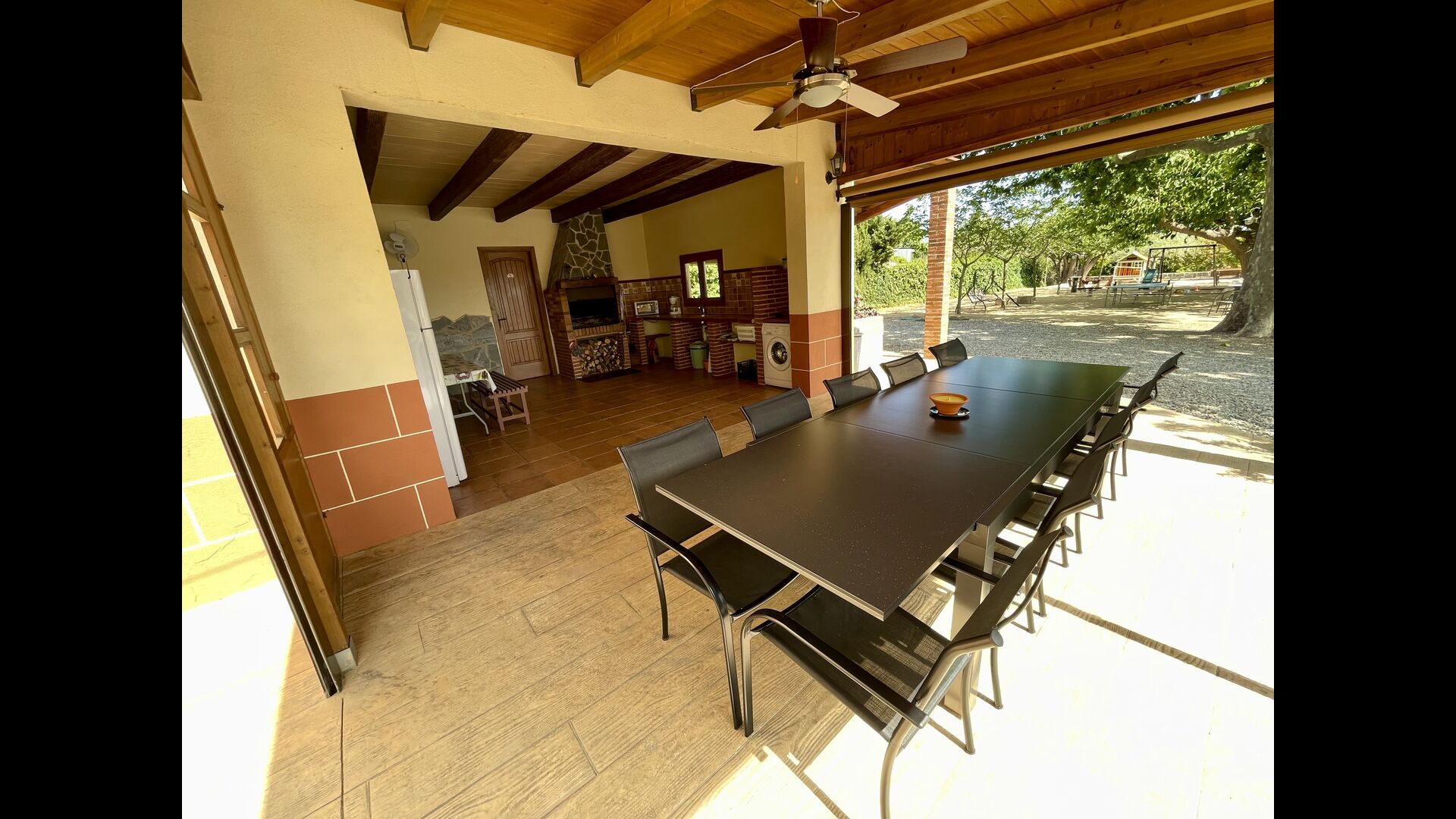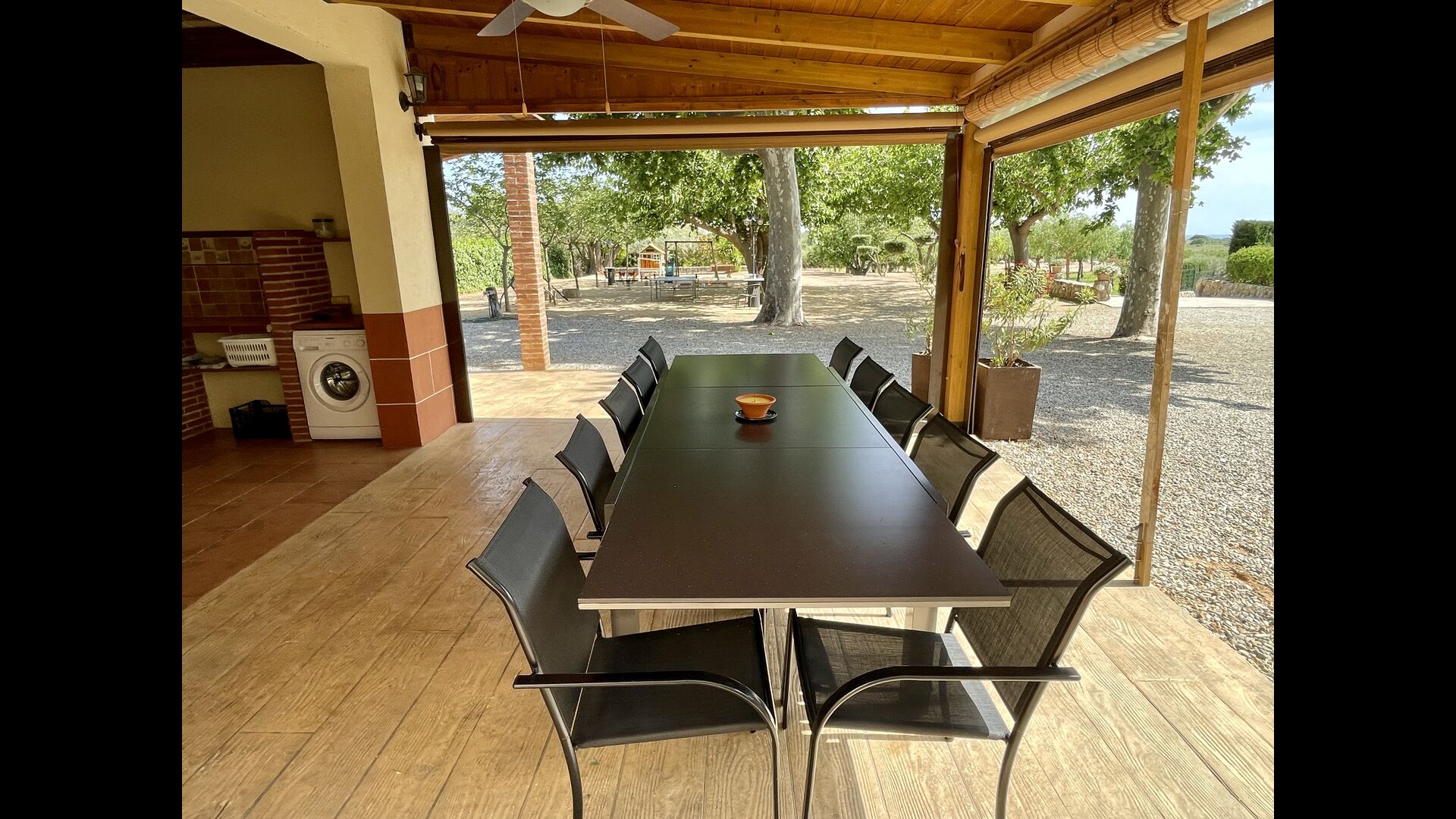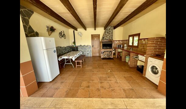 Auf der anderen Seite gibt es zwei verschiedene Terrassen; Eines davon ist mit der hervorragenden Außenküche verbunden, die mit einem geschlossenen Grill, einem Kühlschrank, einer Mikrowelle und einer Spüle ausgestattet ist. Auch die Waschmaschine ist hier installiert. Es gibt auch eine Toilette, was praktisch ist, wenn Sie im Garten sind. Ebenfalls angeschlossen ist ein zweiter Sofabereich im Freien mit Blick auf den Spielplatz.