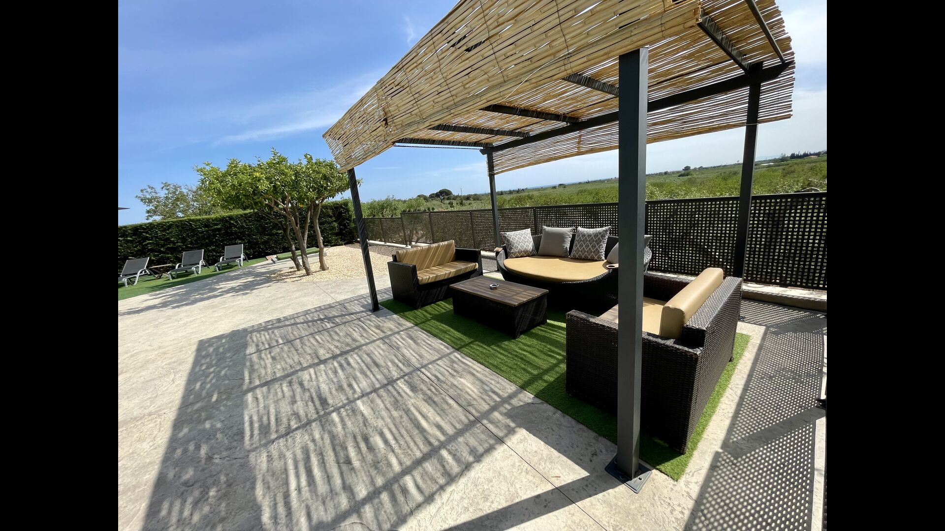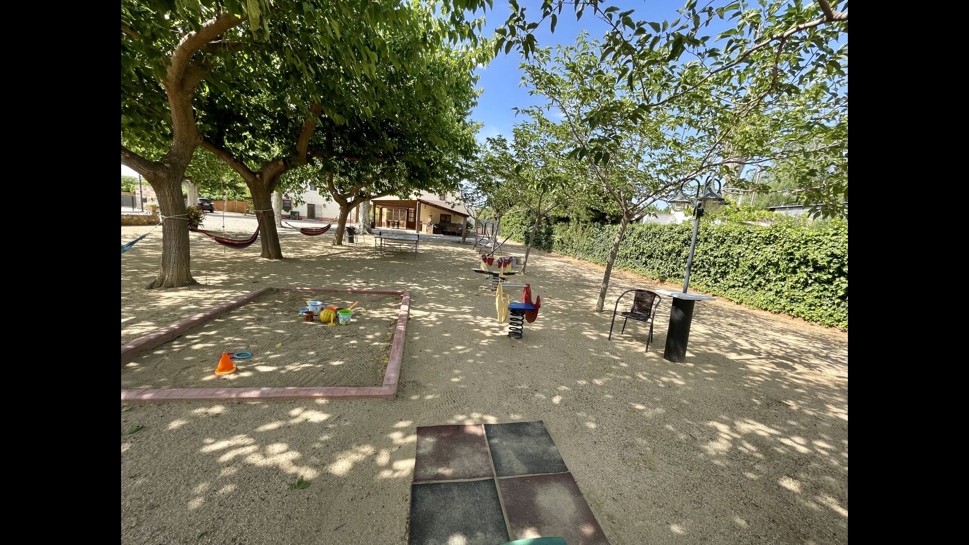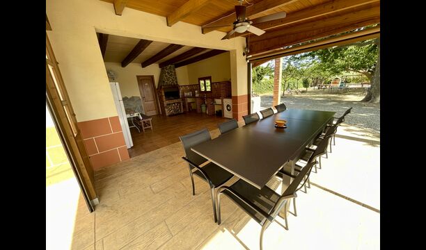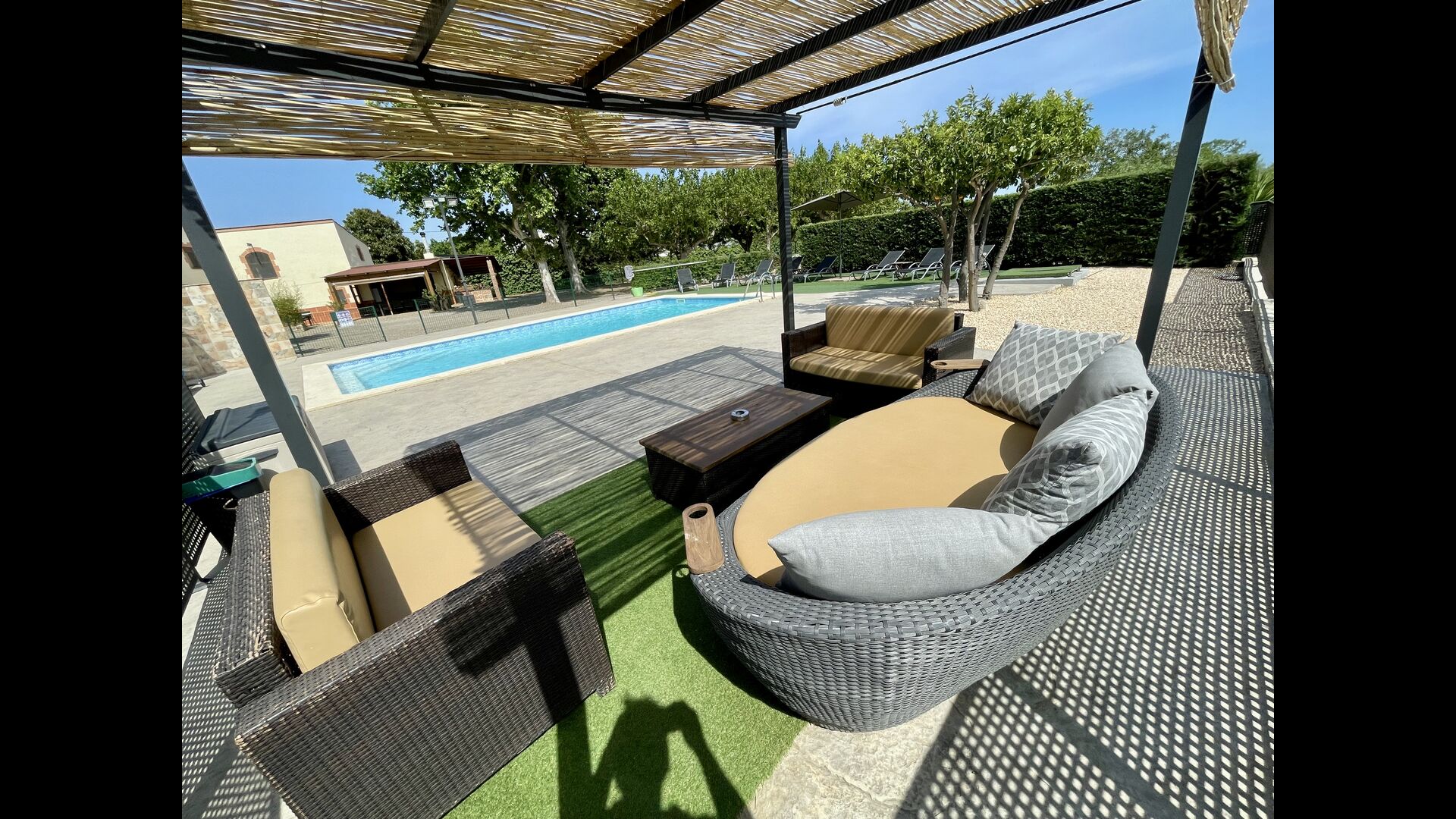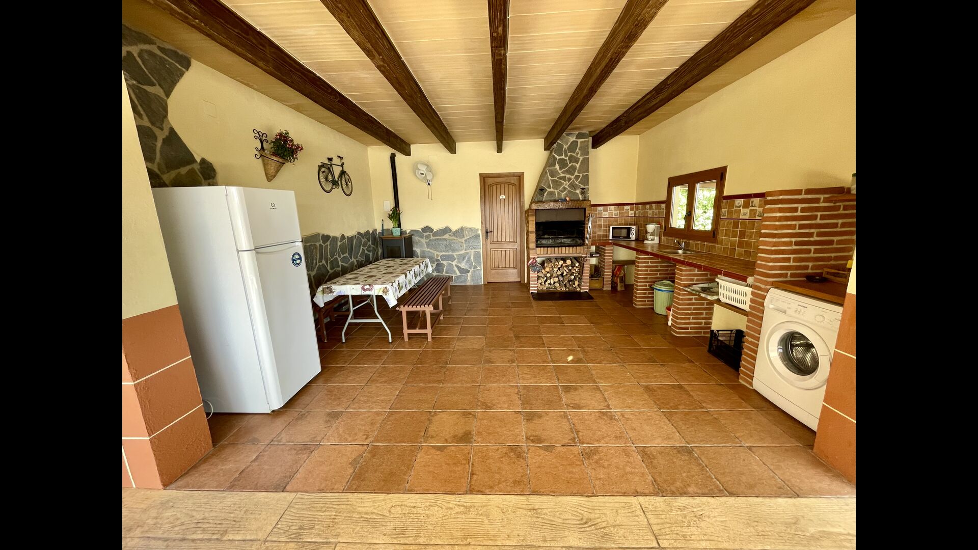 Auf der anderen Seite gibt es zwei verschiedene Terrassen; Eines davon ist mit der hervorragenden Außenküche verbunden, die mit einem geschlossenen Grill, einem Kühlschrank, einer Mikrowelle und einer Spüle ausgestattet ist. Auch die Waschmaschine ist hier installiert. Es gibt auch eine Toilette, was praktisch ist, wenn Sie im Garten sind. Ebenfalls angeschlossen ist ein zweiter Sofabereich im Freien mit Blick auf den Spielplatz.