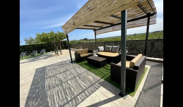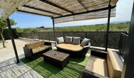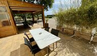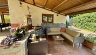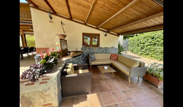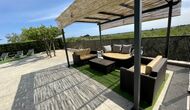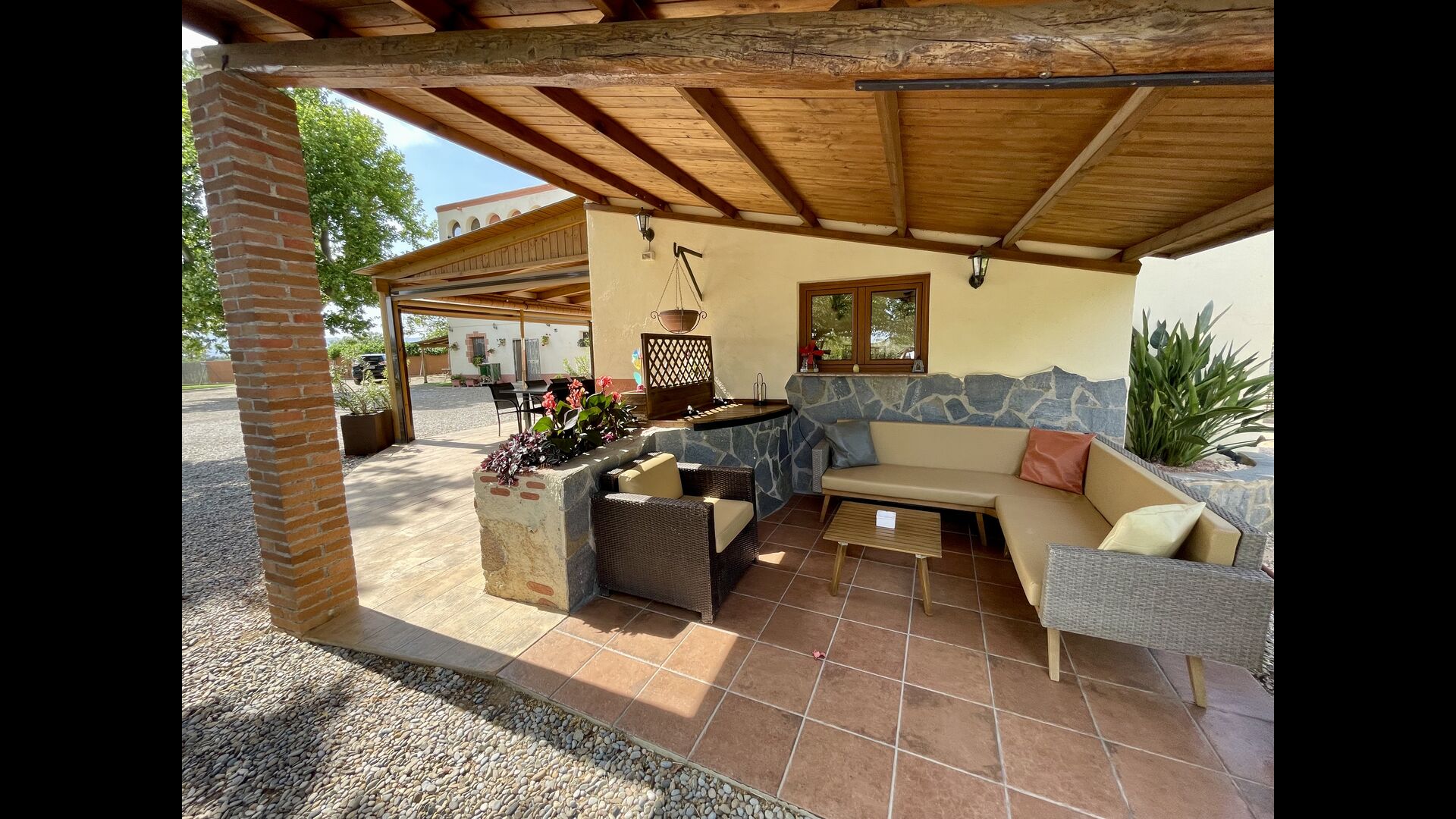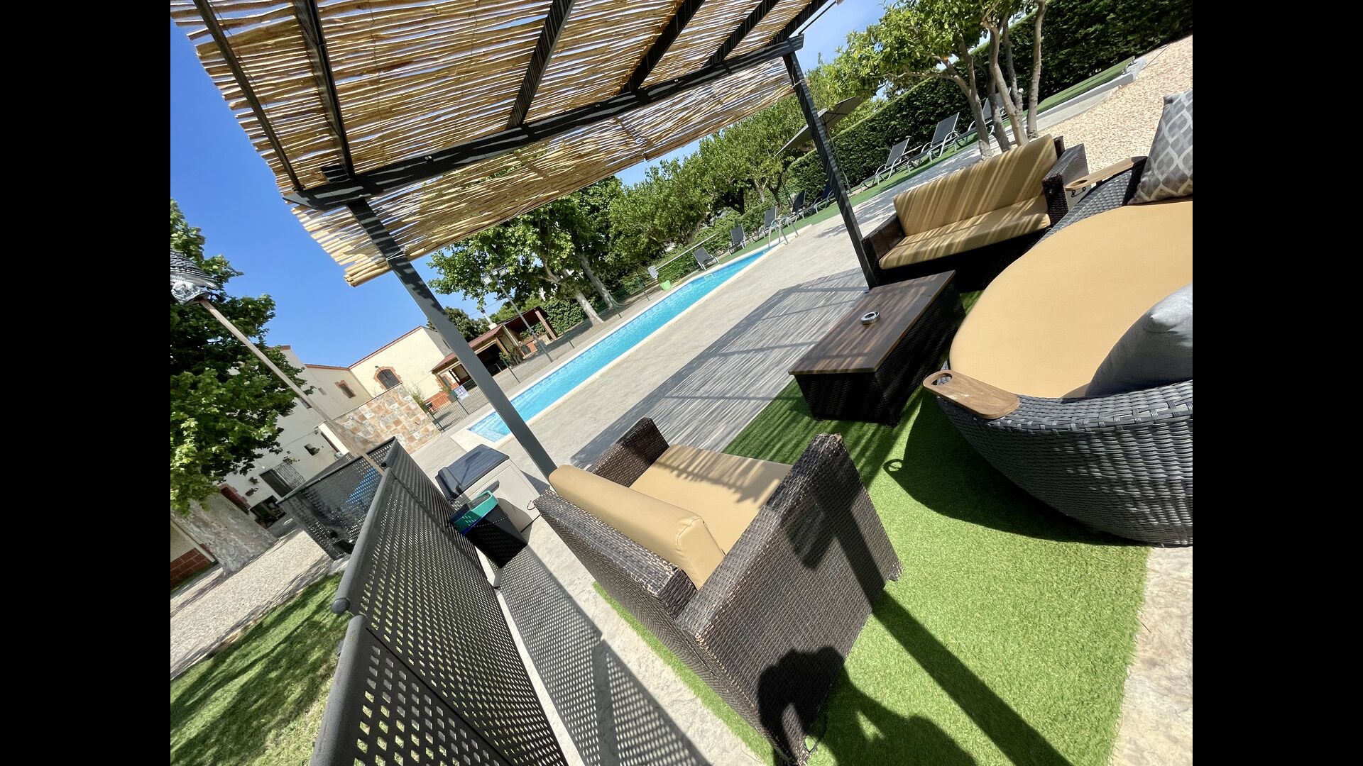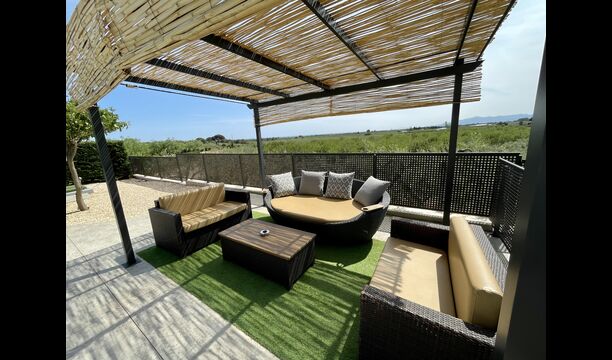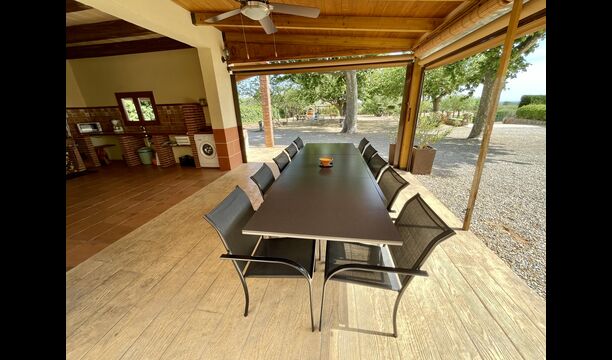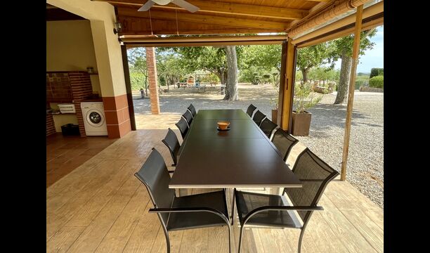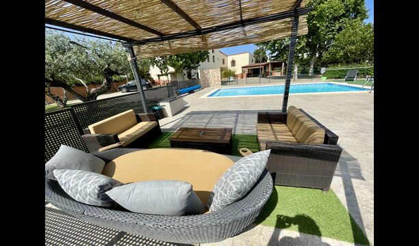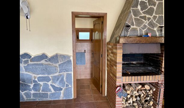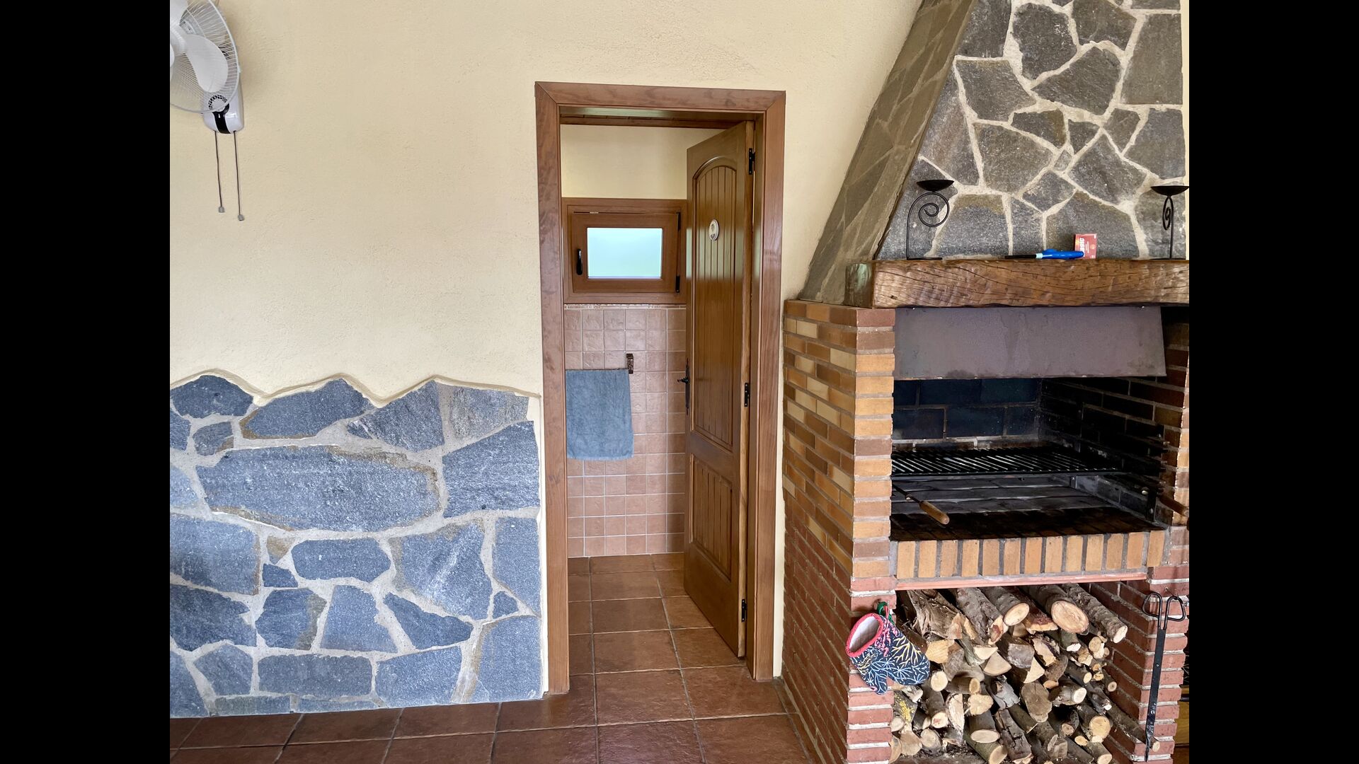 Auf der anderen Seite gibt es zwei verschiedene Terrassen; Eines davon ist mit der hervorragenden Außenküche verbunden, die mit einem geschlossenen Grill, einem Kühlschrank, einer Mikrowelle und einer Spüle ausgestattet ist. Auch die Waschmaschine ist hier installiert. Es gibt auch eine Toilette, was praktisch ist, wenn Sie im Garten sind. Ebenfalls angeschlossen ist ein zweiter Sofabereich im Freien mit Blick auf den Spielplatz.