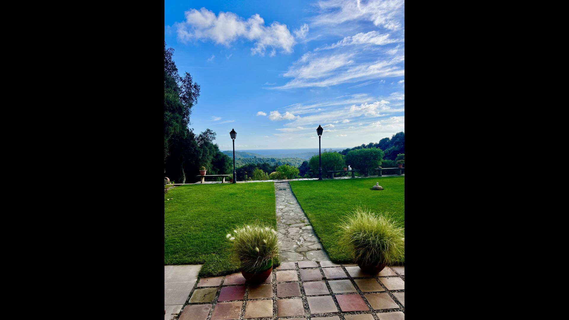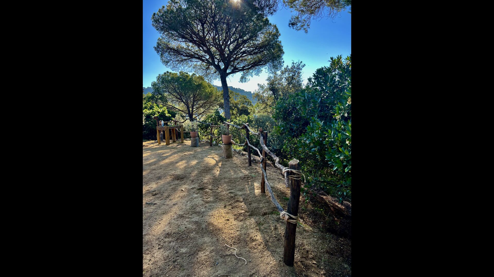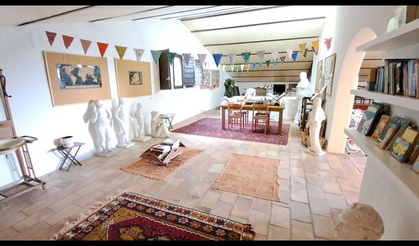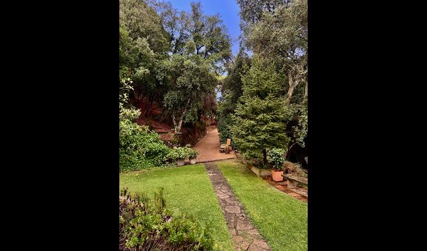Das Haus liegt auf etwa 200 Metern Höhe und bietet einen weiten Blick über das Tal hinunter zum Mittelmeer. Besonders an sonnigen Tagen ist die Aussicht atemberaubend, vor allem wegen der einzigartigen Farbe des Meeres. Das Tal ist von grünem Wald bedeckt, da sich das Grundstück des Hauses über zwei Kilometer talabwärts durch geschützten Wald erstreckt. Es gibt viele kleine, sorgfältig mit Steinen markierte Wanderwege und verschiedene kleine Spielgeräte für Kinder. Für Erwachsene gibt es eine sogenannte Langlaufloipe.