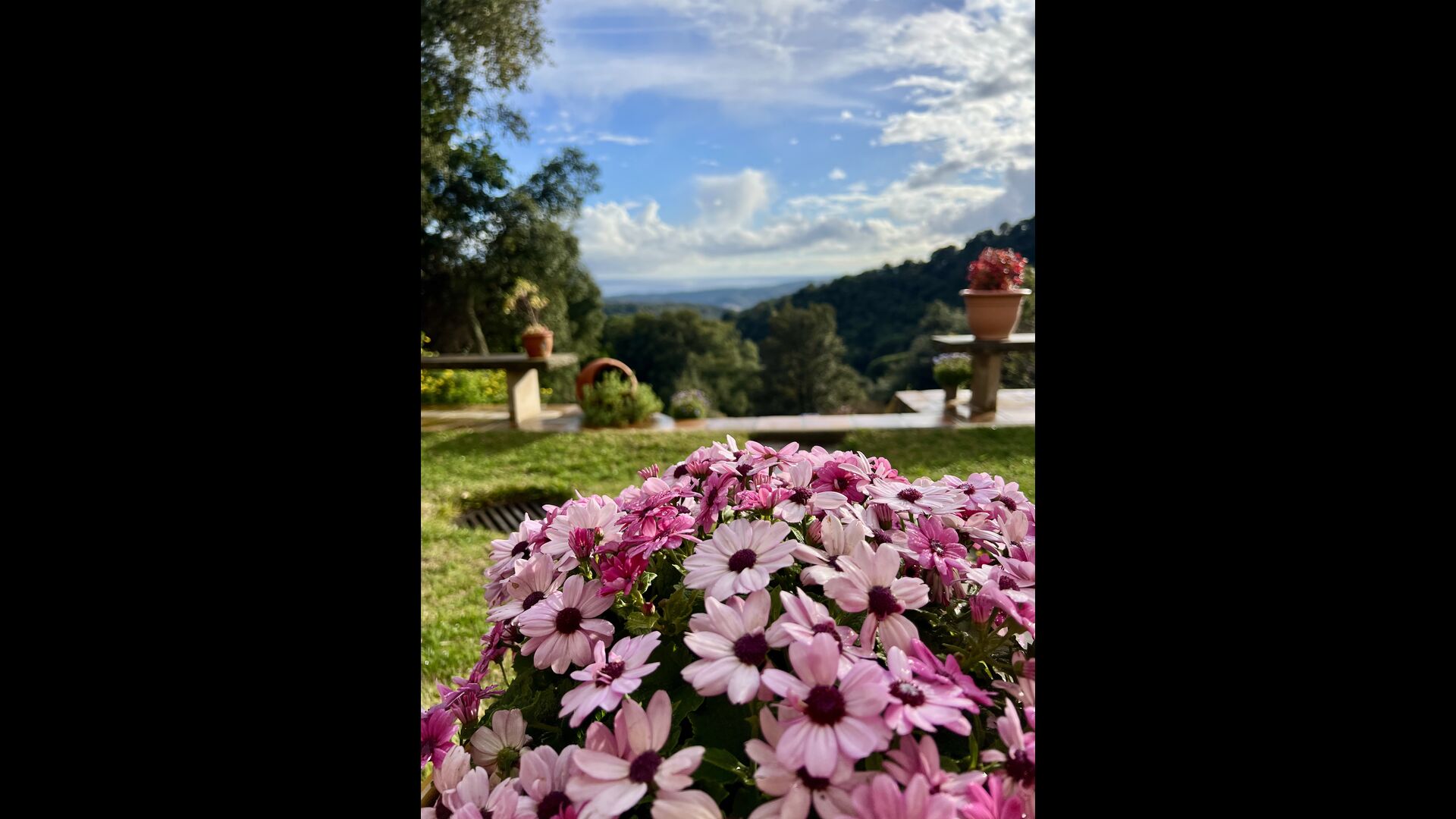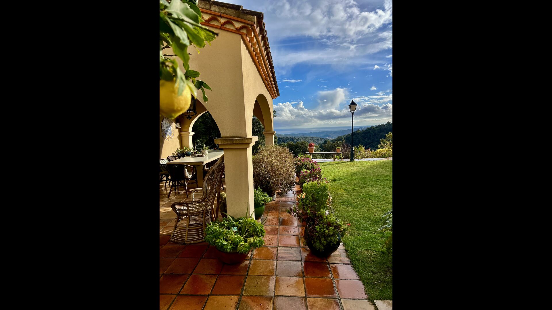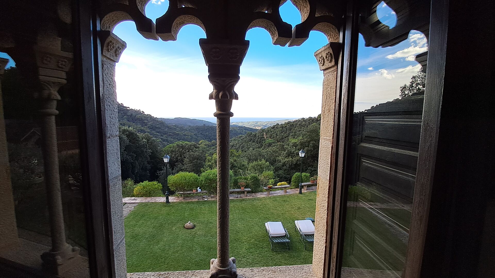 Das Haus liegt auf etwa 200 Metern Höhe und bietet einen weiten Blick über das Tal hinunter zum Mittelmeer. Besonders an sonnigen Tagen ist die Aussicht atemberaubend, vor allem wegen der einzigartigen Farbe des Meeres. Das Tal ist von grünem Wald bedeckt, da sich das Grundstück des Hauses über zwei Kilometer talabwärts durch geschützten Wald erstreckt. Es gibt viele kleine, sorgfältig mit Steinen markierte Wanderwege und verschiedene kleine Spielgeräte für Kinder. Für Erwachsene gibt es eine sogenannte Langlaufloipe.