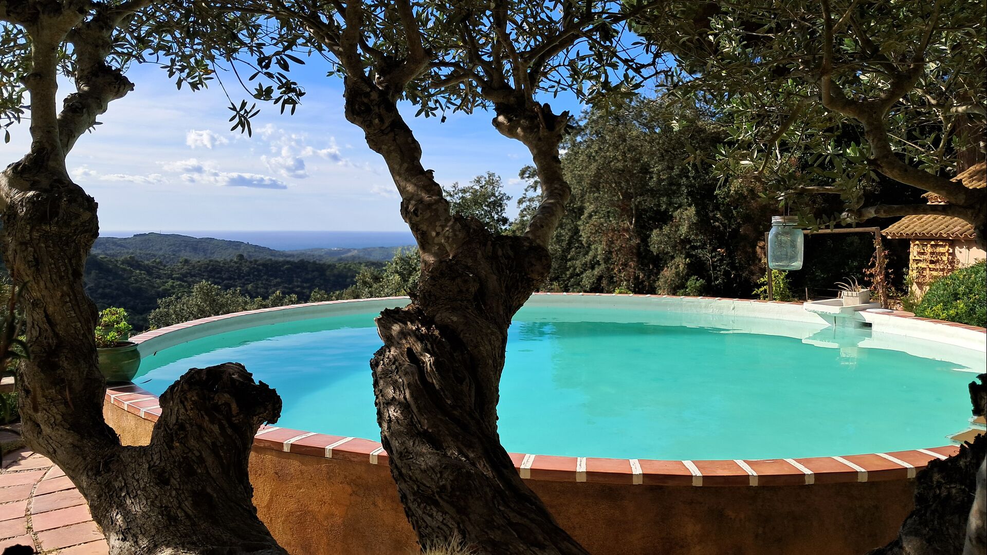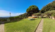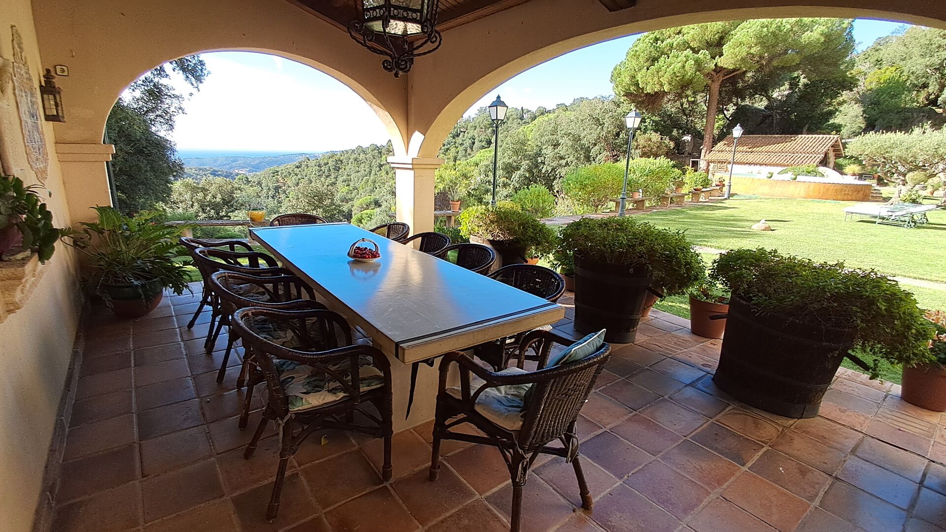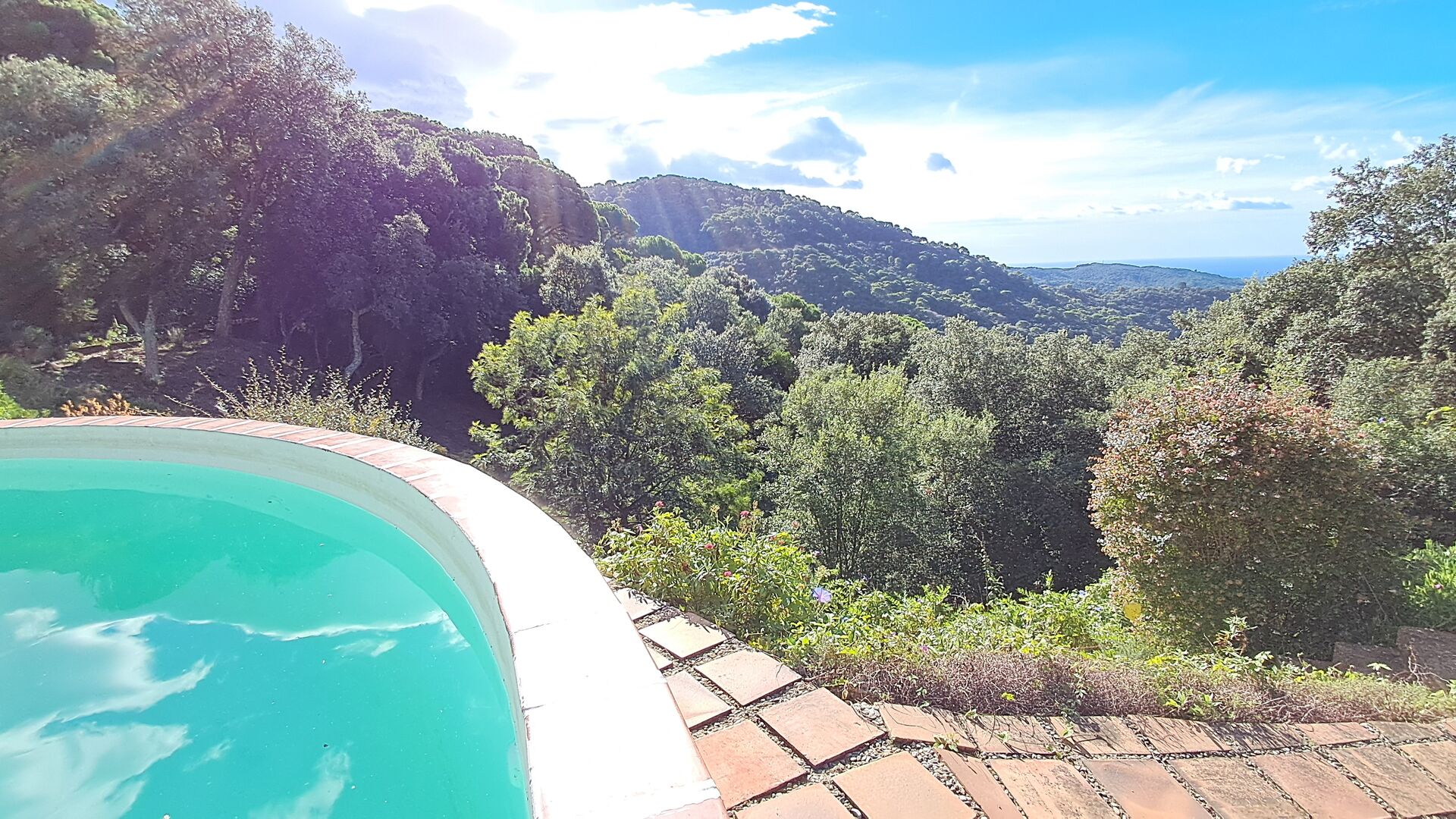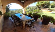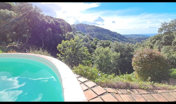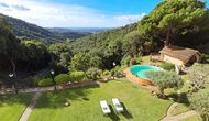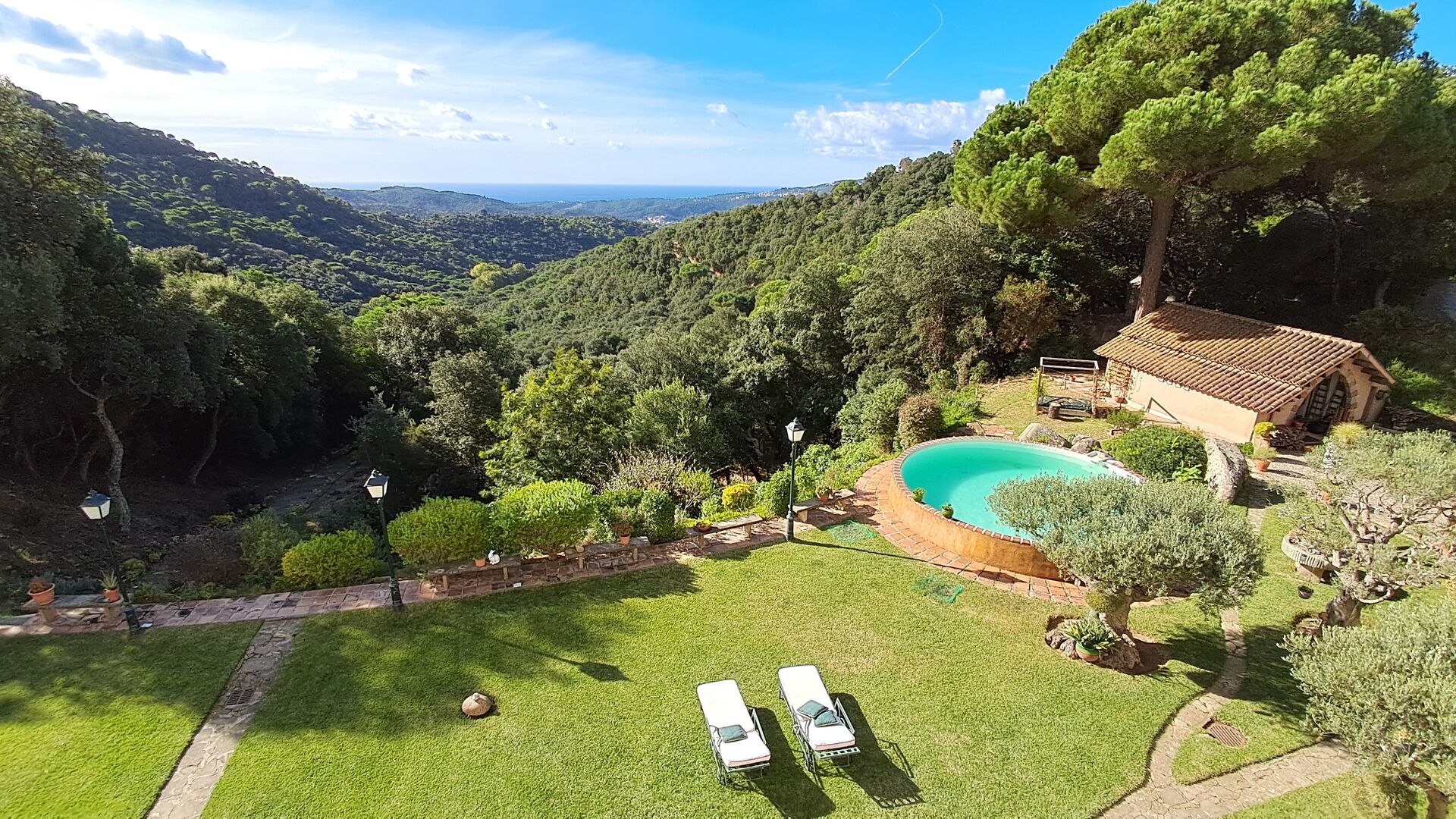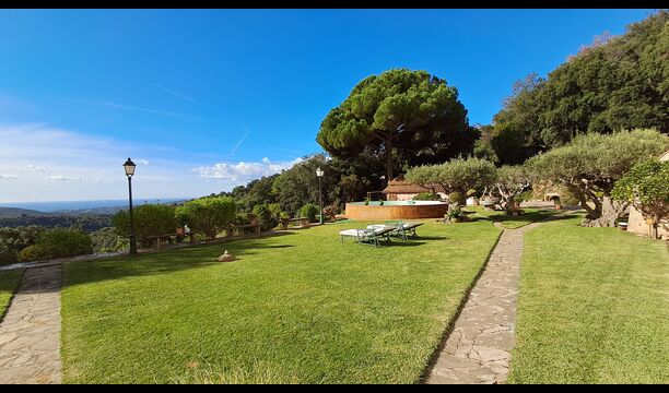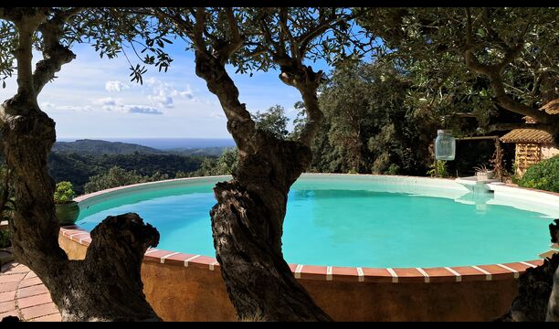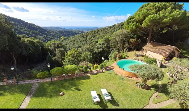 Draußen bietet die Rasenfläche mit Sonnenliegen, die Terrasse und die gemütliche Sofaecke am Pool einen fantastischen Ort zum Verweilen, nicht zuletzt wegen des atemberaubenden Blicks über den Wald bis hinunter zum Mittelmeer.