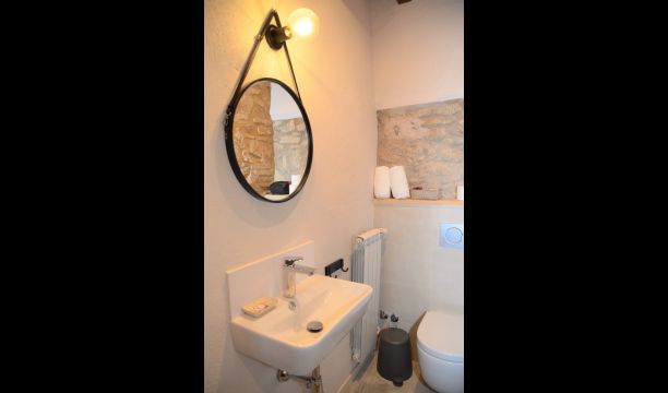 The house is divided into "apartments", which means that the rooms are distributed into separate units around the castle, where there are several rooms in many of the units. There is a total of seven of these "apartments" with 10 rooms and space for 26 people in total. With the 10 rooms comes 6 bathrooms of which 3 are en-suite. Furthermore, 2 of the rooms have direct access to the pool area. There are multiple well-equipped kitchens as well as a living room with flat-screen TV and several seating arrangements. There is also, in connection with the kitchens, several dining tables, so you can enjoy meals together.
