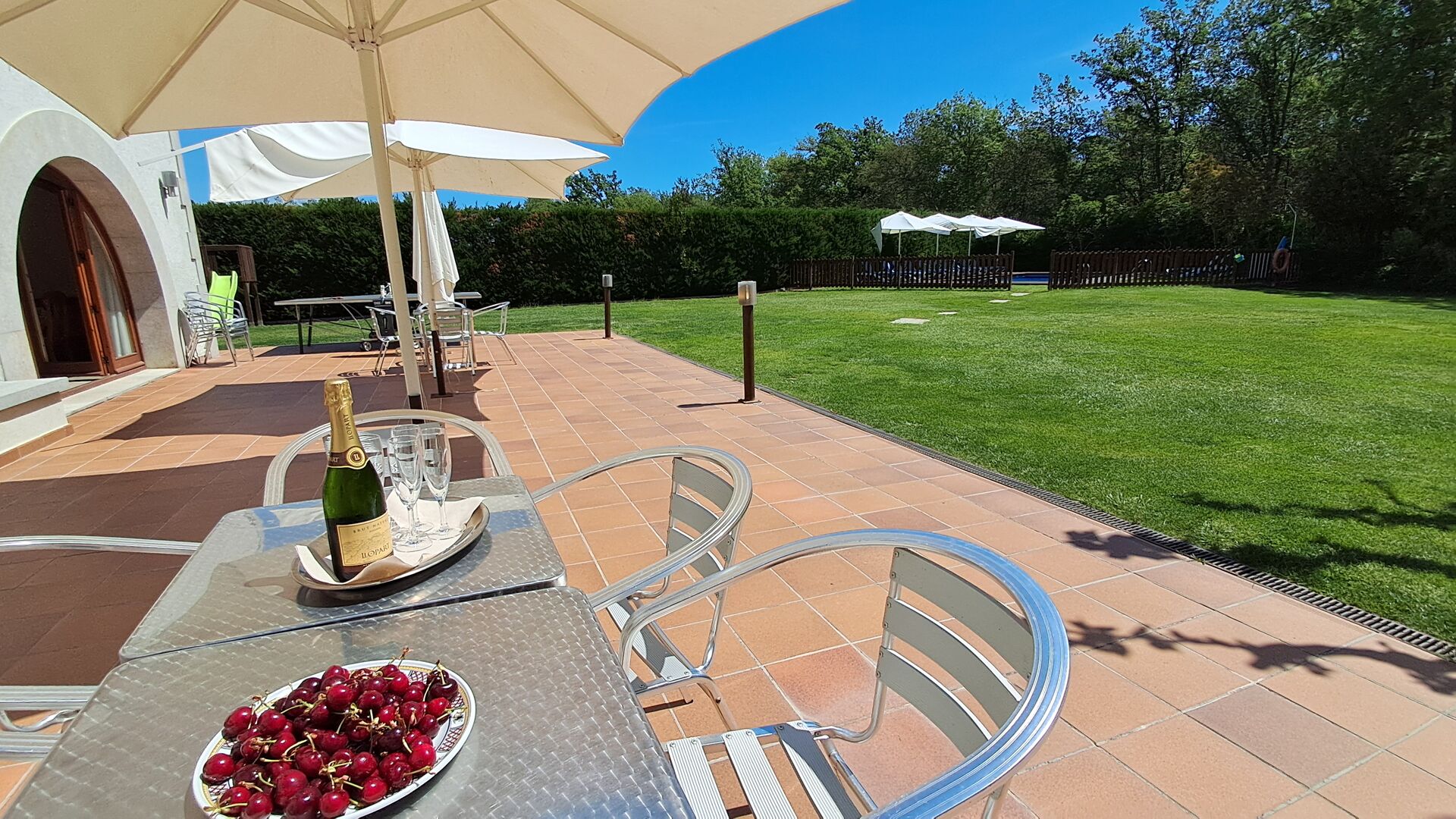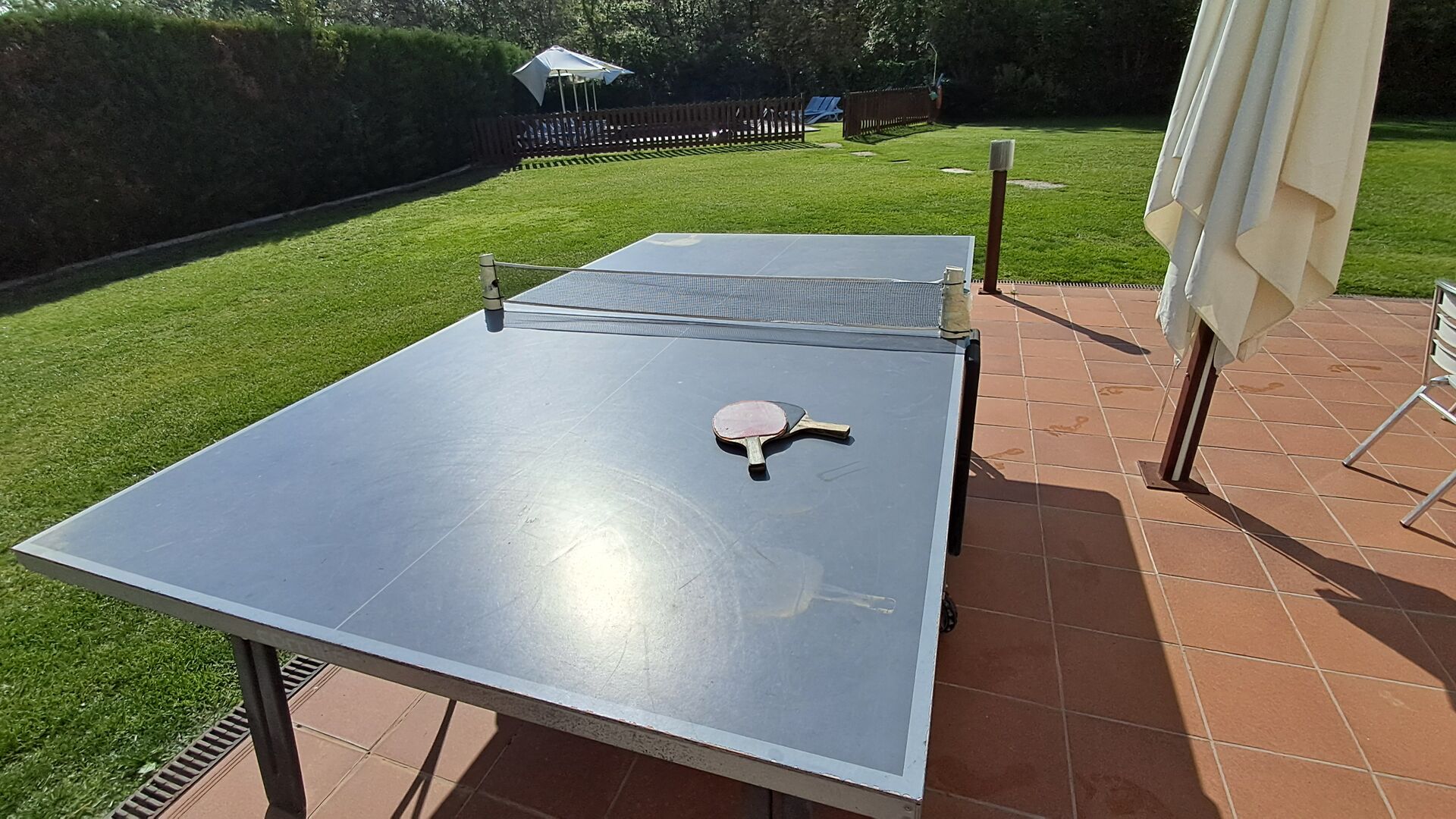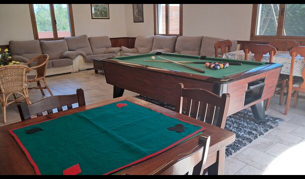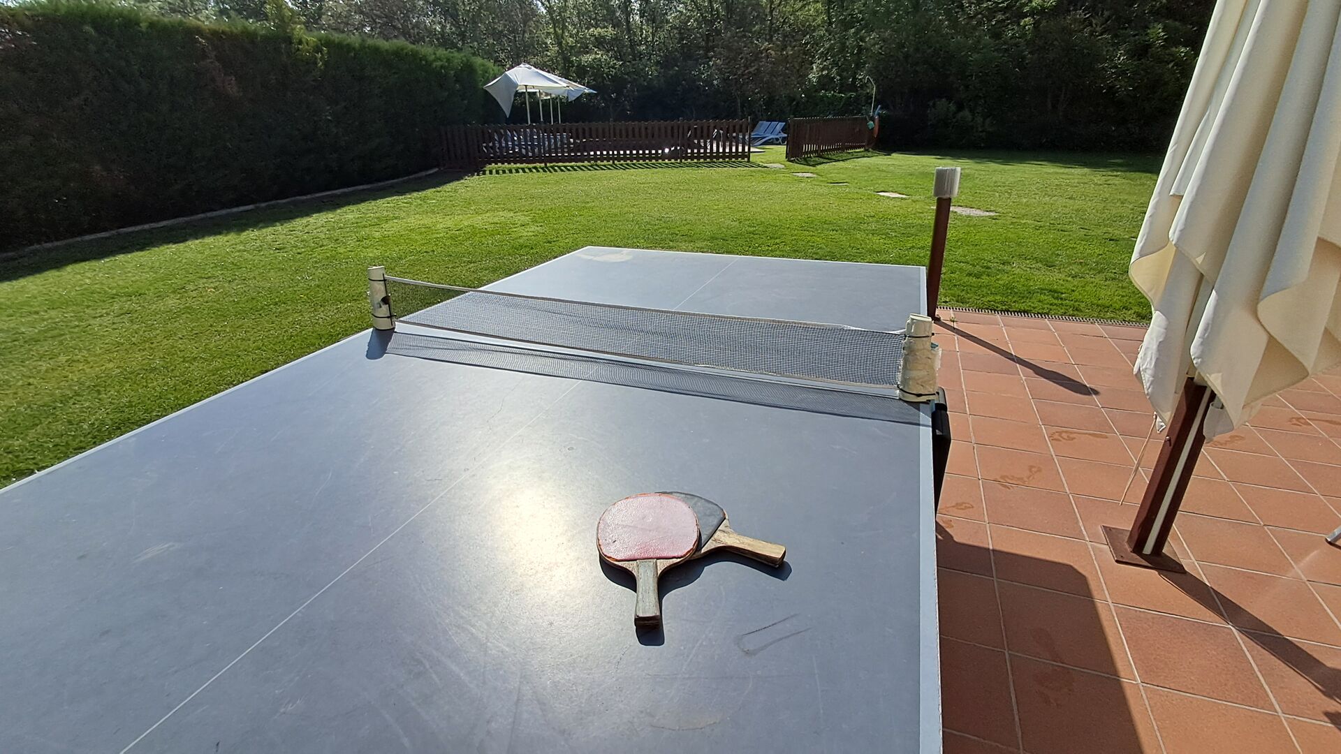 Das Haus verfügt über einen großen, gepflegten Garten und einen schönen Rasen, mit vielen Möglichkeiten für die junge (und ältere) in der Urlaubsgruppe. Der wunderschöne Swimmingpool hat eine Größe von 50m2, wo jeder entspannen und abkühlen kann oder die Sonnenliegen genießen. Dieser Poolbereich ist für die Sicherheit eingezäunt. Das ist eine Erleichterung, wenn Sie im Urlaub mit sehr junge Kindern sind. Darüber hinaus gibt es Tischtennis, Fußball- und Spielplatz. Es gibt WC im Erdgeschoss - auch sehr praktisch, wenn Sie im Garten sind.