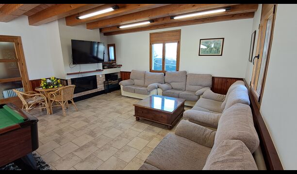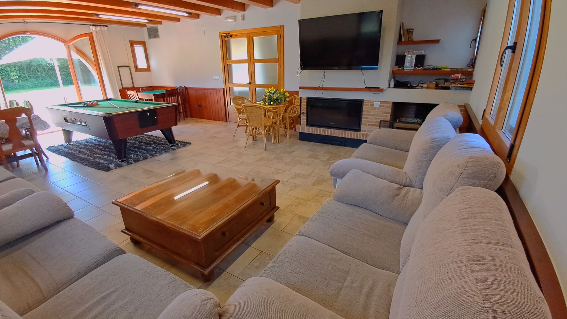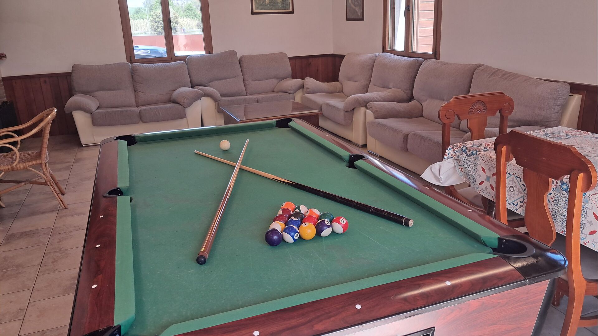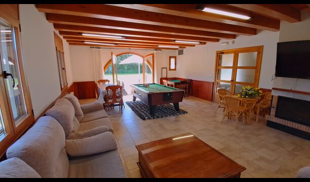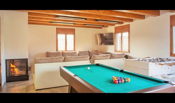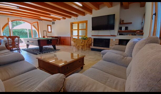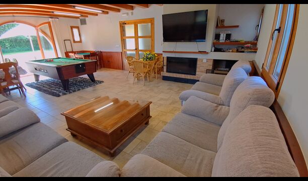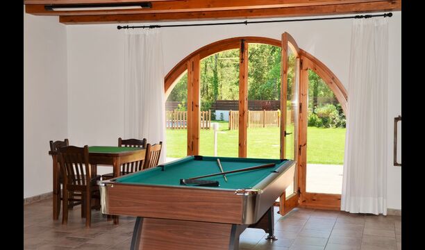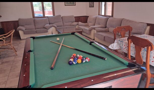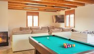 Wenn Sie den Eingang des Ferienvillas betreten, gibt es, nach links, einen Wohnbereich. Hier gibt es Sofas, einen Billardtisch, einen großen Flachbild TV und Stereoanlage - eine großartiger Stelle für Entspannung Innen. Auf der rechten Seite können Sie die sehr gut ausgestattete Küche des Ferienhauses sehen. Hier gibt es eine Tiefkühschrank (das immer mit frischem Öl für ankommende Gäste gefüllt ist), Mikrowelle, mehrere Kühlschränke, Nespresso-Maschine, riesigen Backofen, großen Geschirrspüler und vieles mehr). Im Anschluss gibt es eine nette Essecke mit Zugang zu einem aussen-Essbereich, damit Sie die langen, warmen Sommerabende genießen können.