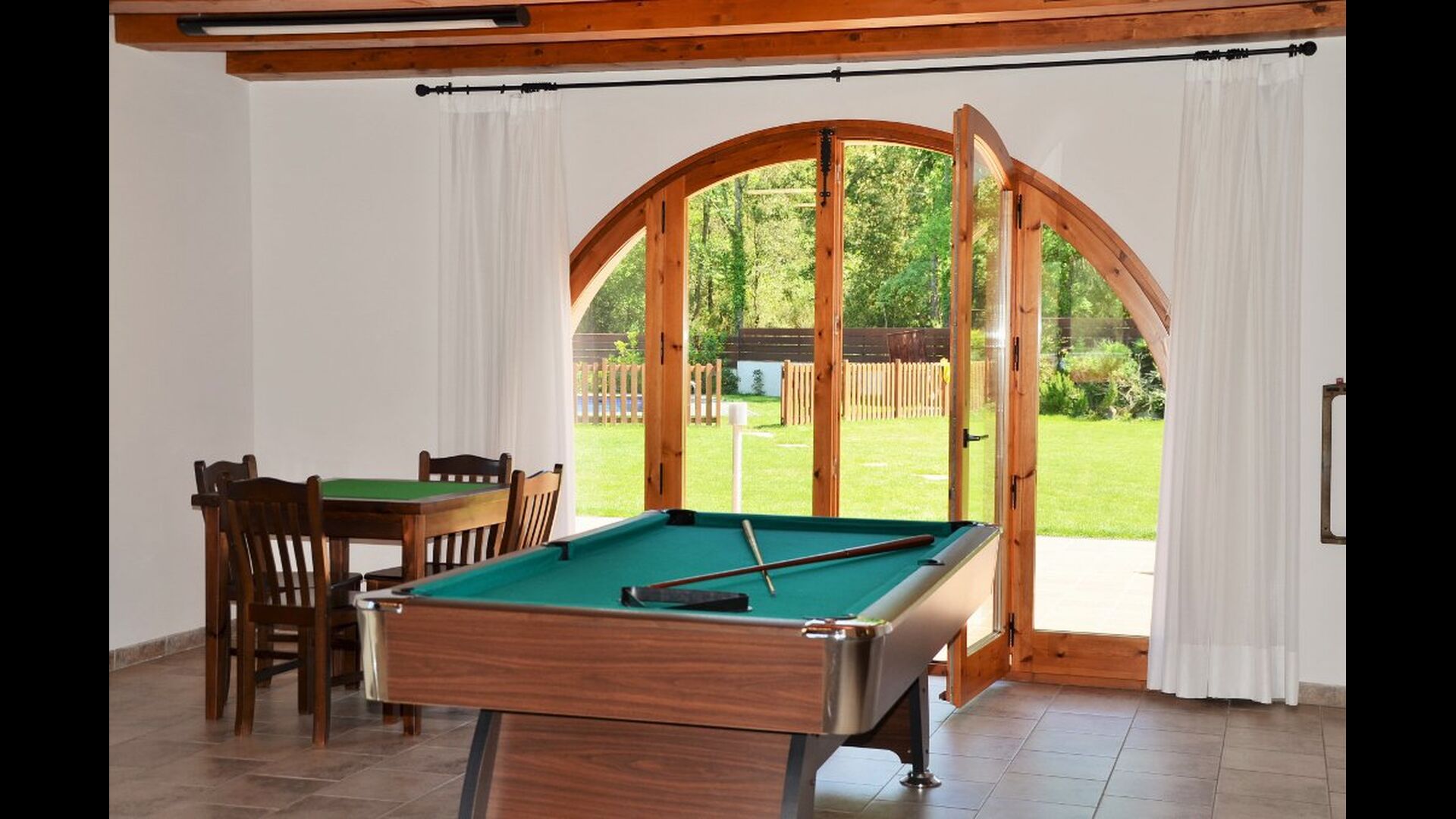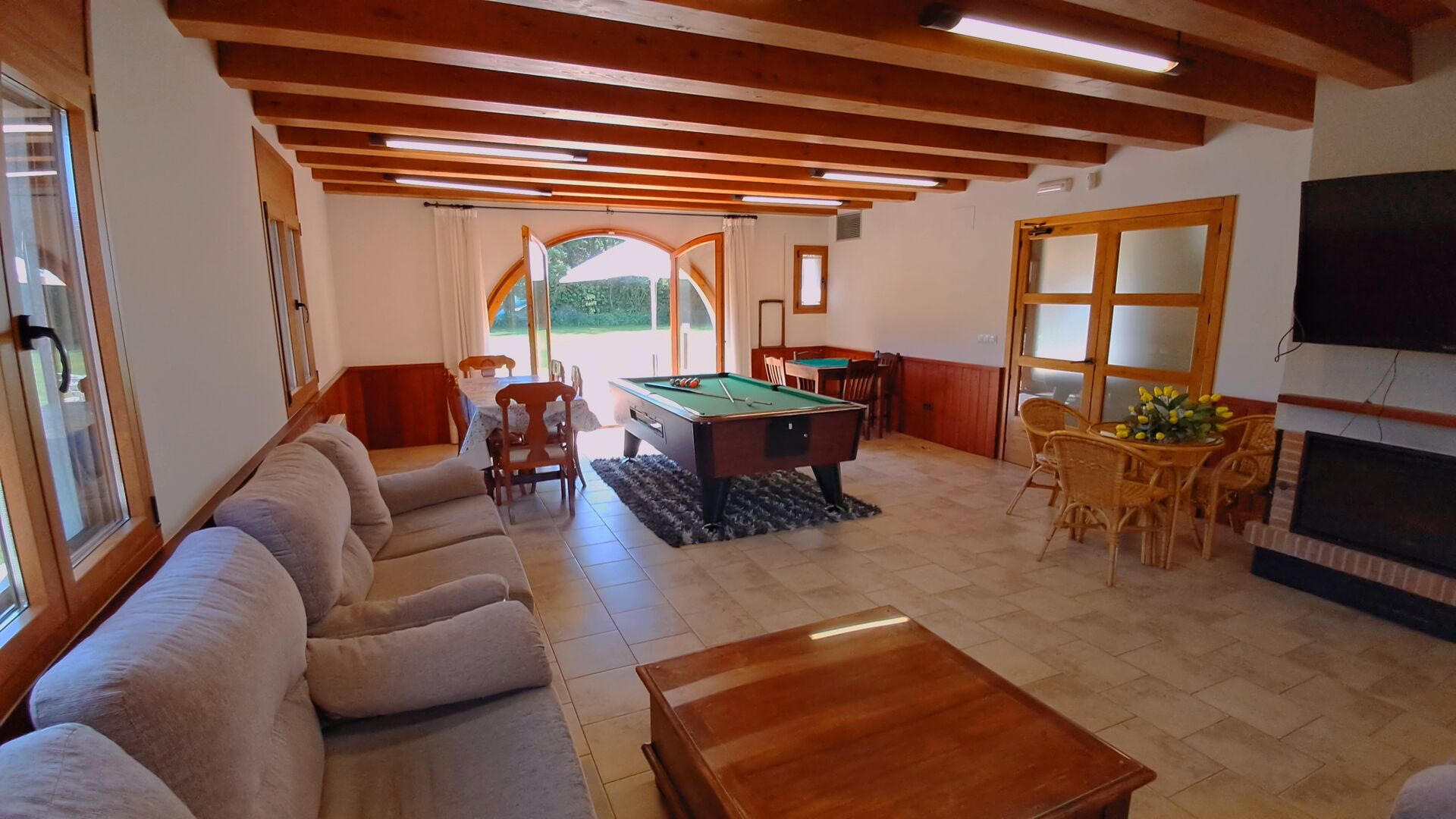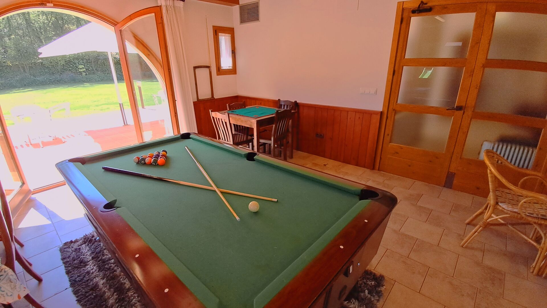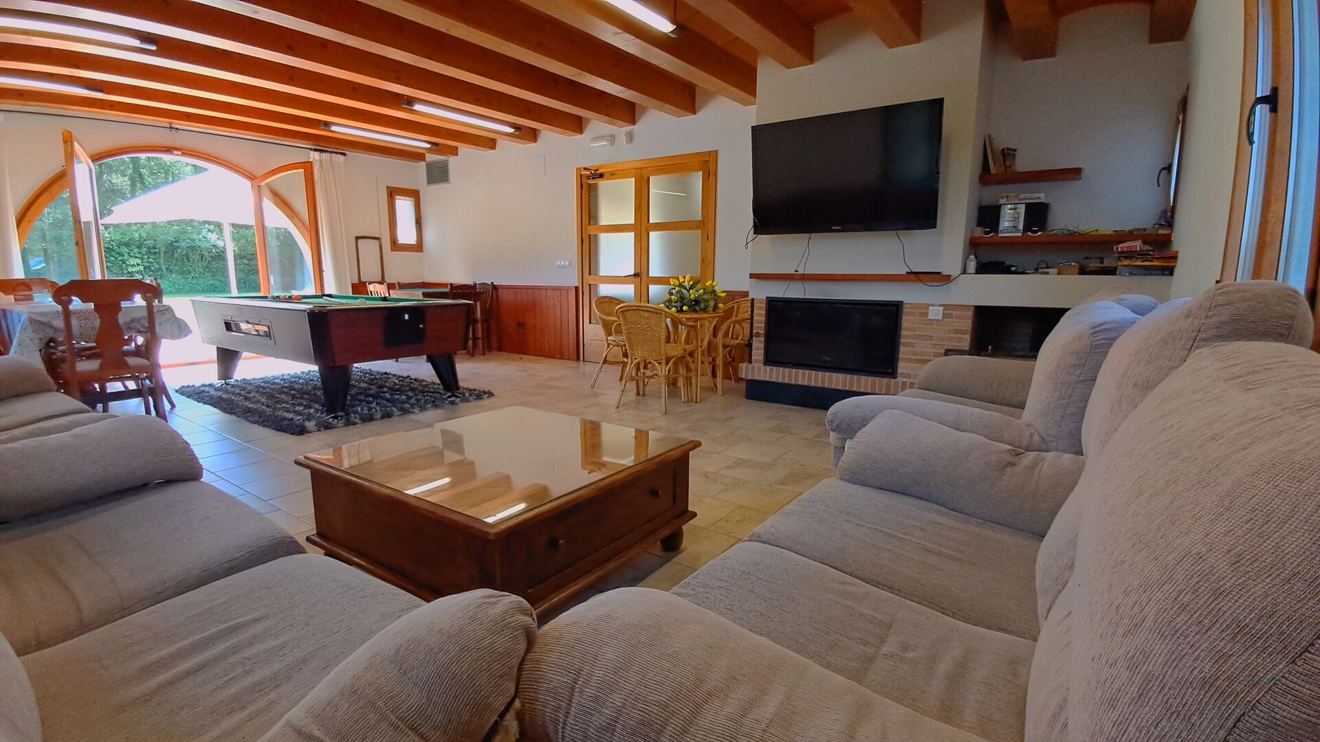 Wenn Sie den Eingang des Ferienvillas betreten, gibt es, nach links, einen Wohnbereich. Hier gibt es Sofas, einen Billardtisch, einen großen Flachbild TV und Stereoanlage - eine großartiger Stelle für Entspannung Innen. Auf der rechten Seite können Sie die sehr gut ausgestattete Küche des Ferienhauses sehen. Hier gibt es eine Tiefkühschrank (das immer mit frischem Öl für ankommende Gäste gefüllt ist), Mikrowelle, mehrere Kühlschränke, Nespresso-Maschine, riesigen Backofen, großen Geschirrspüler und vieles mehr). Im Anschluss gibt es eine nette Essecke mit Zugang zu einem aussen-Essbereich, damit Sie die langen, warmen Sommerabende genießen können.