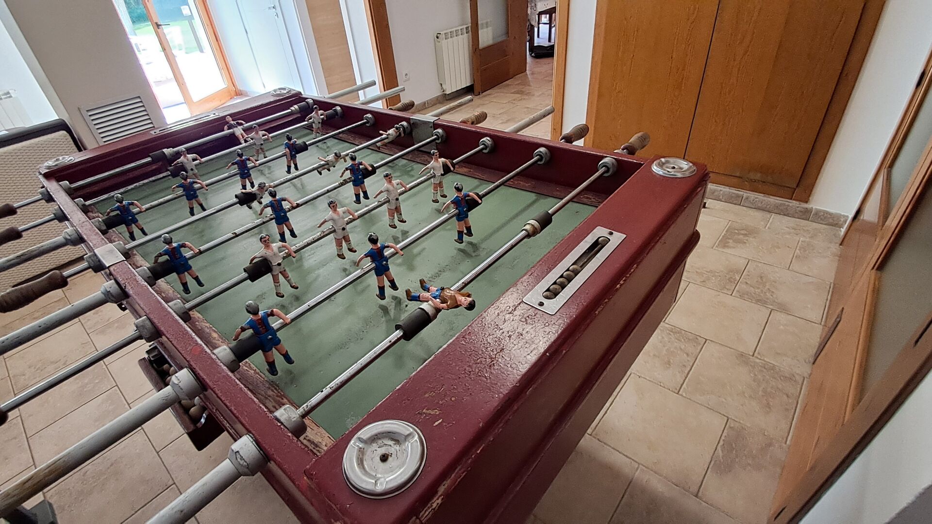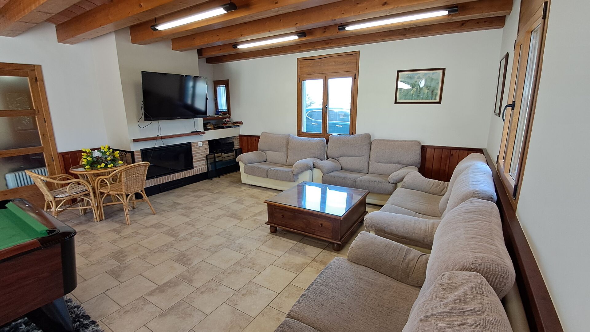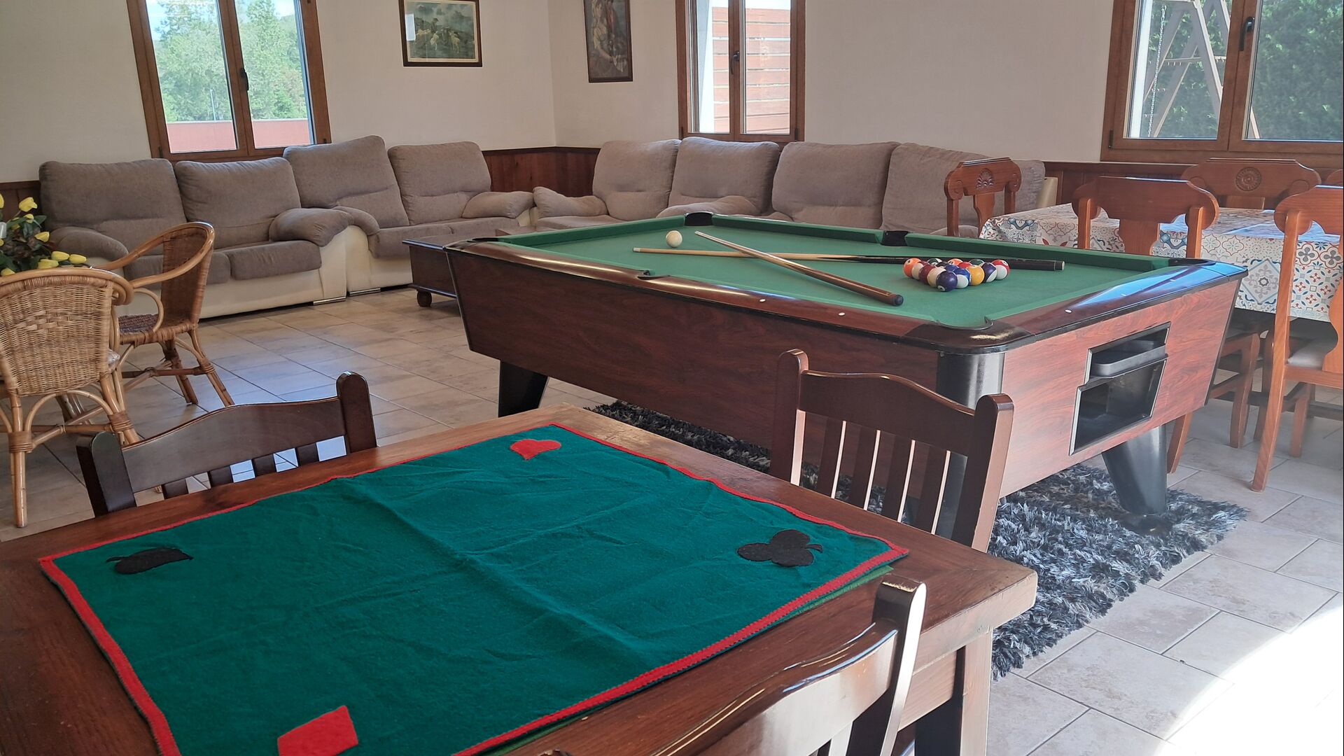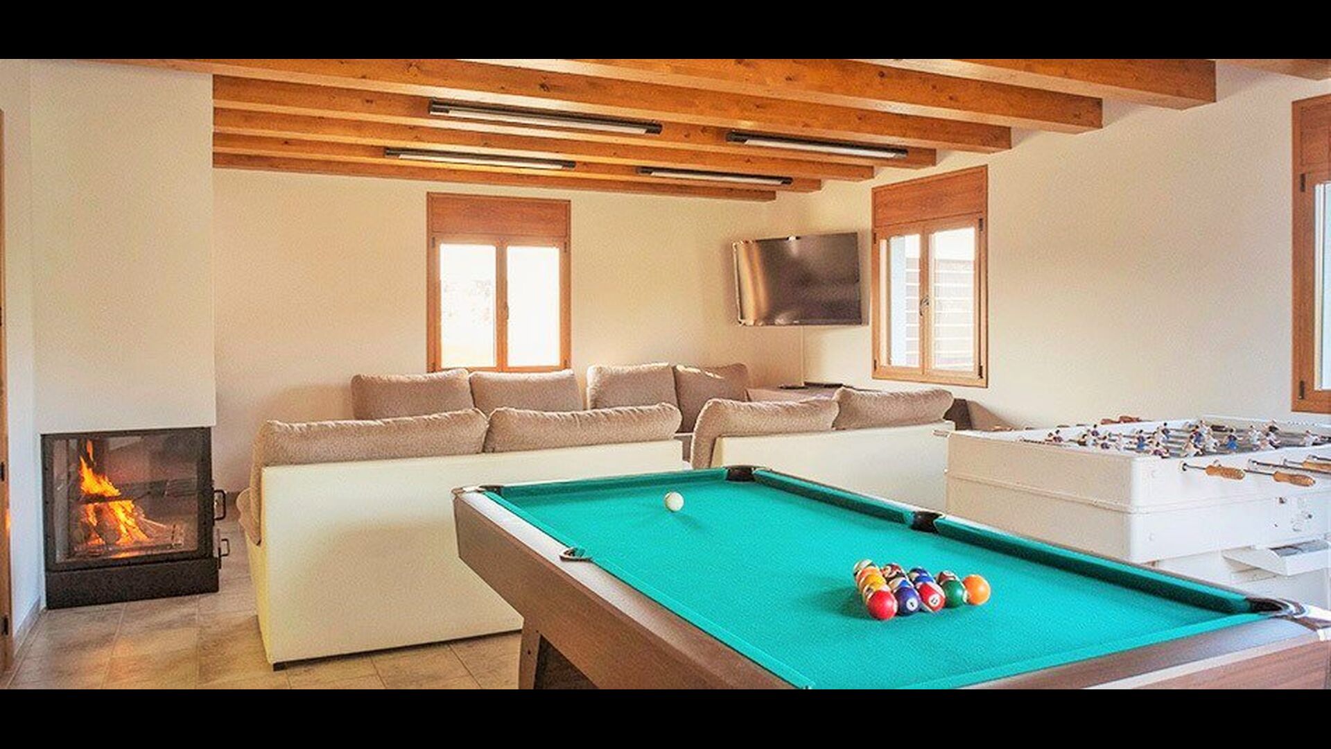 Wenn Sie den Eingang des Ferienvillas betreten, gibt es, nach links, einen Wohnbereich. Hier gibt es Sofas, einen Billardtisch, einen großen Flachbild TV und Stereoanlage - eine großartiger Stelle für Entspannung Innen. Auf der rechten Seite können Sie die sehr gut ausgestattete Küche des Ferienhauses sehen. Hier gibt es eine Tiefkühschrank (das immer mit frischem Öl für ankommende Gäste gefüllt ist), Mikrowelle, mehrere Kühlschränke, Nespresso-Maschine, riesigen Backofen, großen Geschirrspüler und vieles mehr). Im Anschluss gibt es eine nette Essecke mit Zugang zu einem aussen-Essbereich, damit Sie die langen, warmen Sommerabende genießen können.