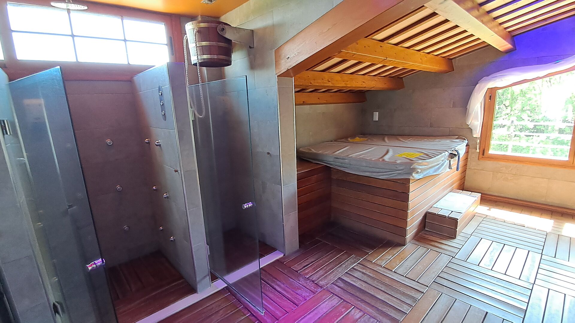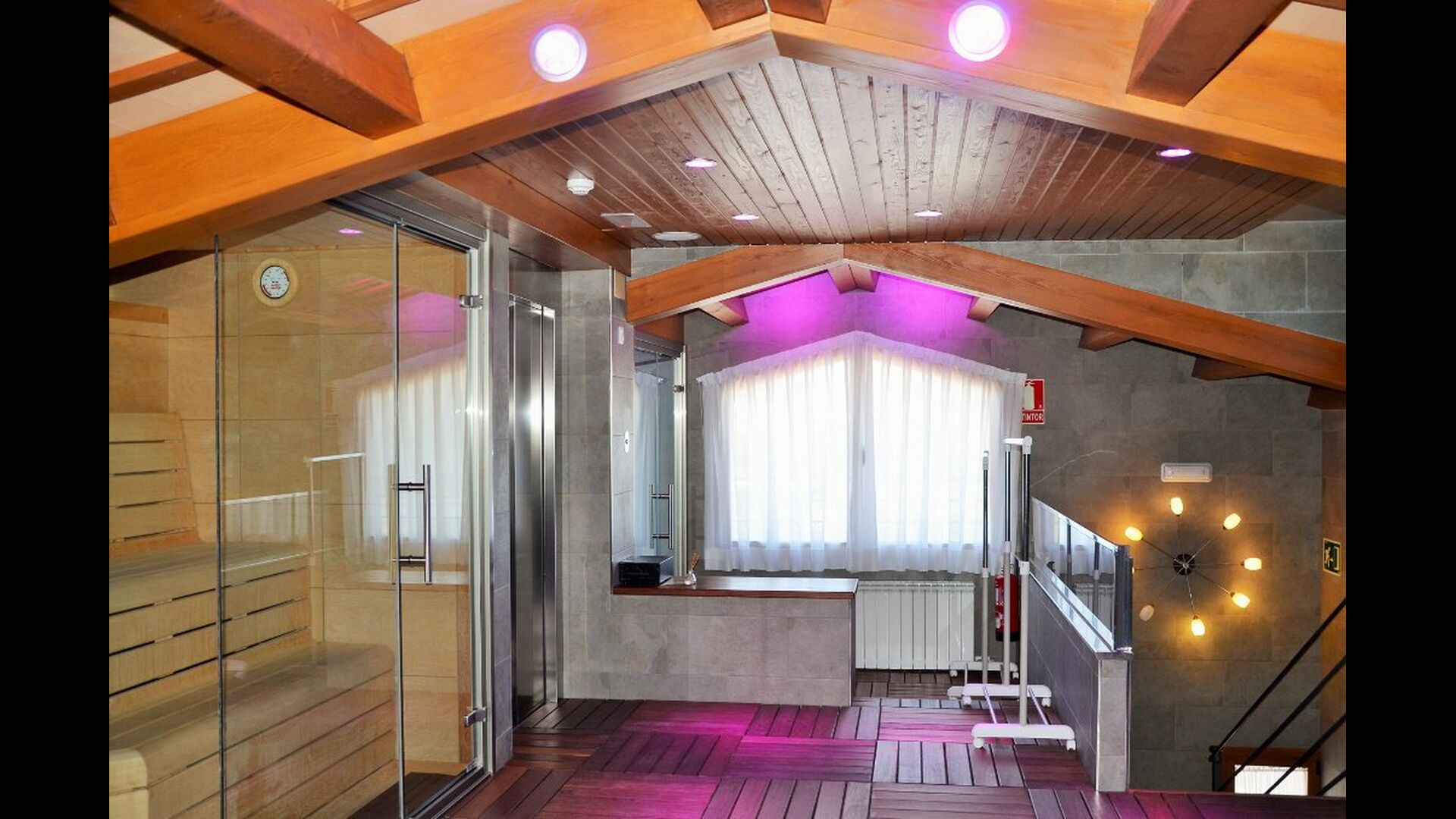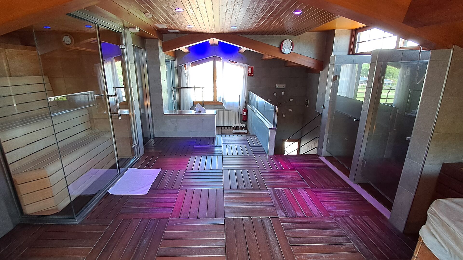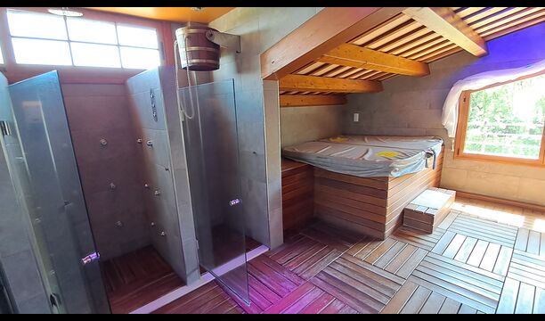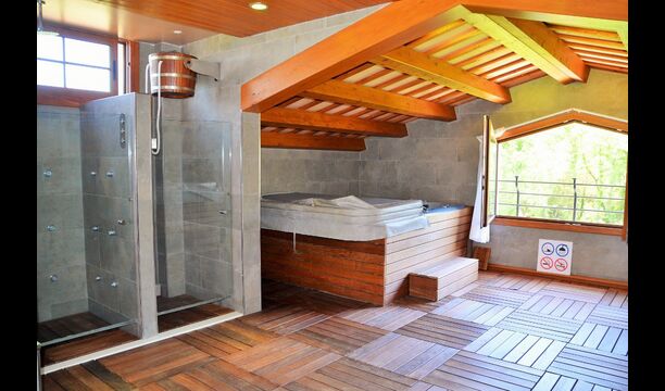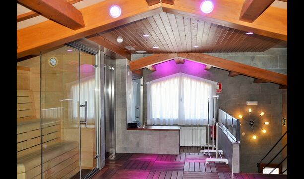 Auf der zweiten Etage, haben die Eigentümer einen kompletten Wellnessbereich gebaut. Wenn Sie hier für Entspannung gekommen sind, haben Sie wirklich die richtige Stelle gewählt. Es gibt zwei Spapools, Kaltwasserbad, Hydromassage-Duschen und zwei Saunen - eine mit Eukalyptus und eine normale. Der Aufzug geht den ganzen Weg hier hoch, und mit vielen verschiedenen Farblichten und Musik, ist die Bühne für ein besonderes Erlebnis gesetzt.