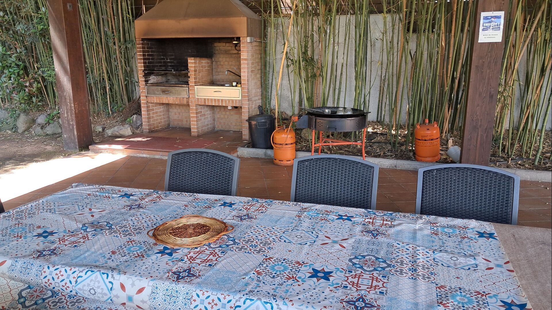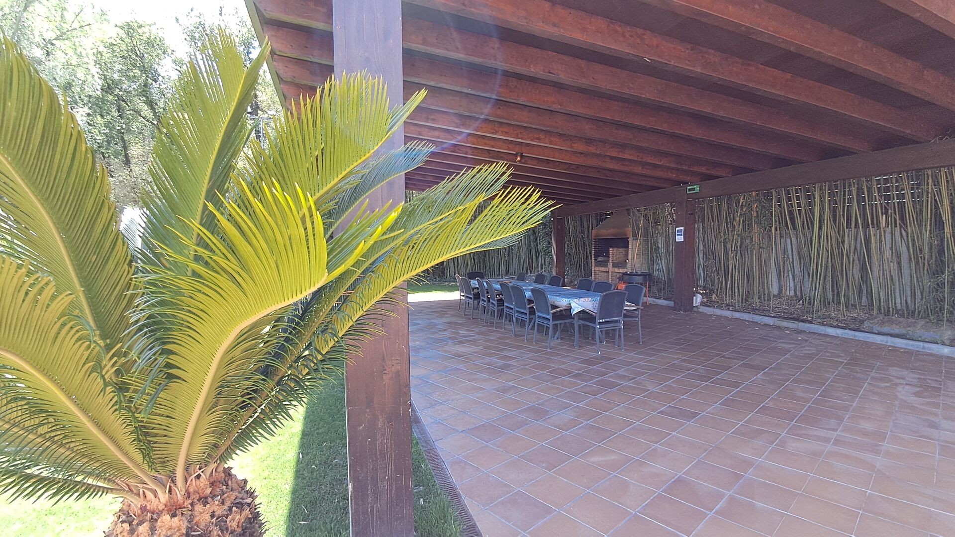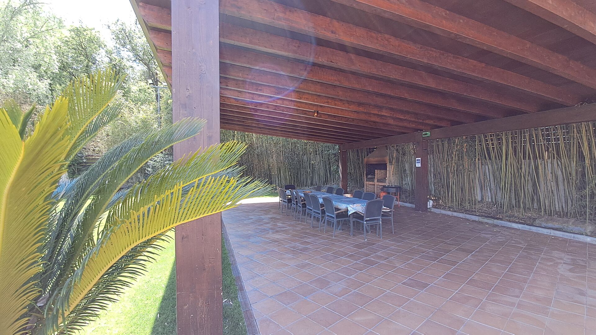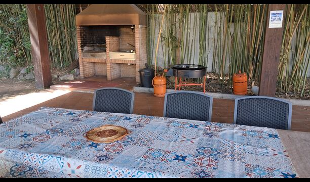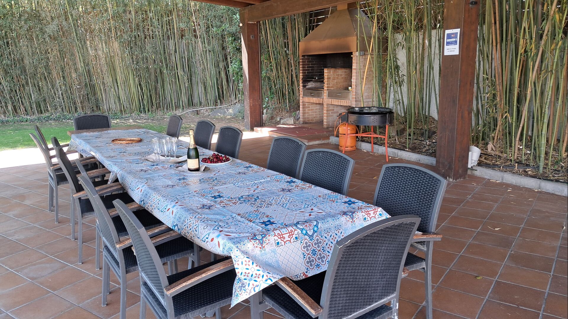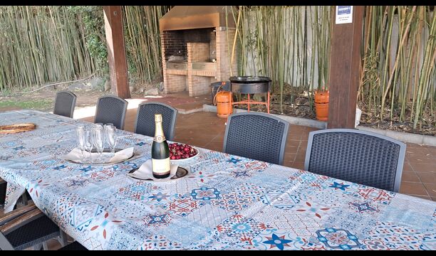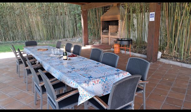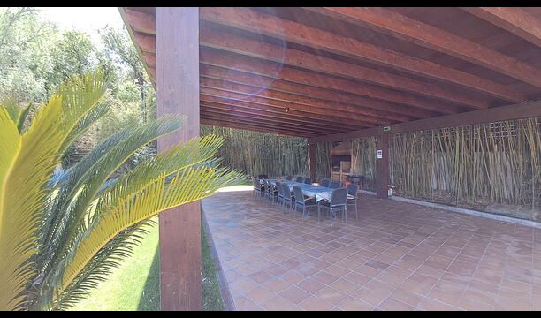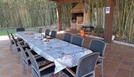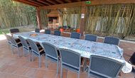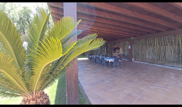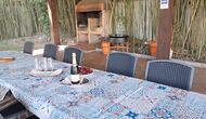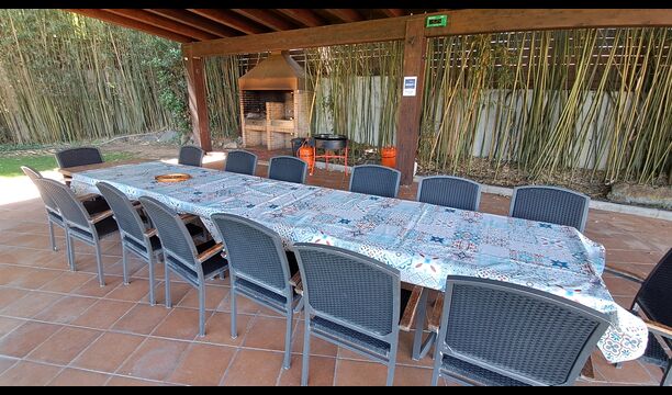 Es gibt eine große überdachte Terrasse, wo den ganzen Urlaubgruppe draußen sitzen und essen kann. Es gibt weiterhin ein großer Grill, auf dem man auch das Essen vorbereiten kann.