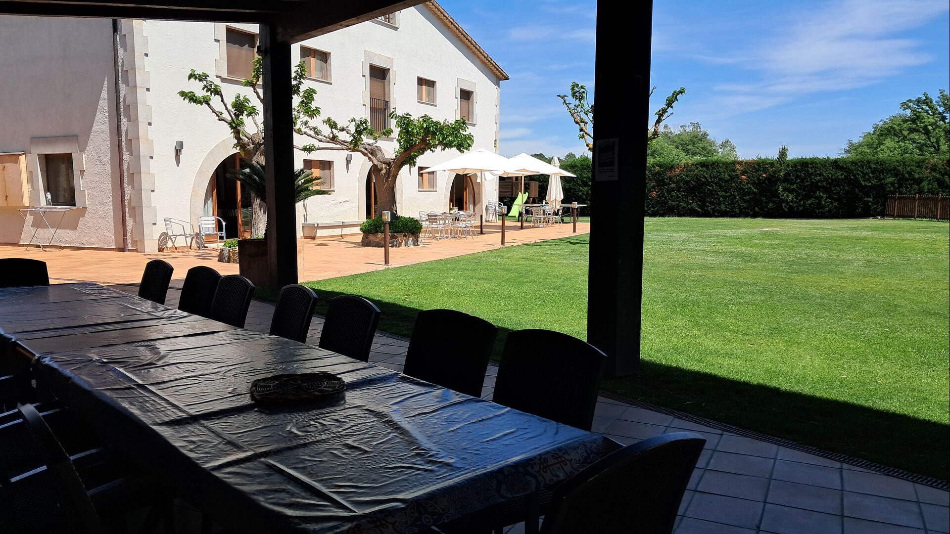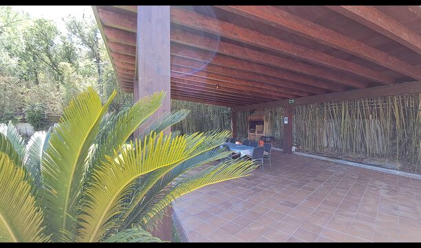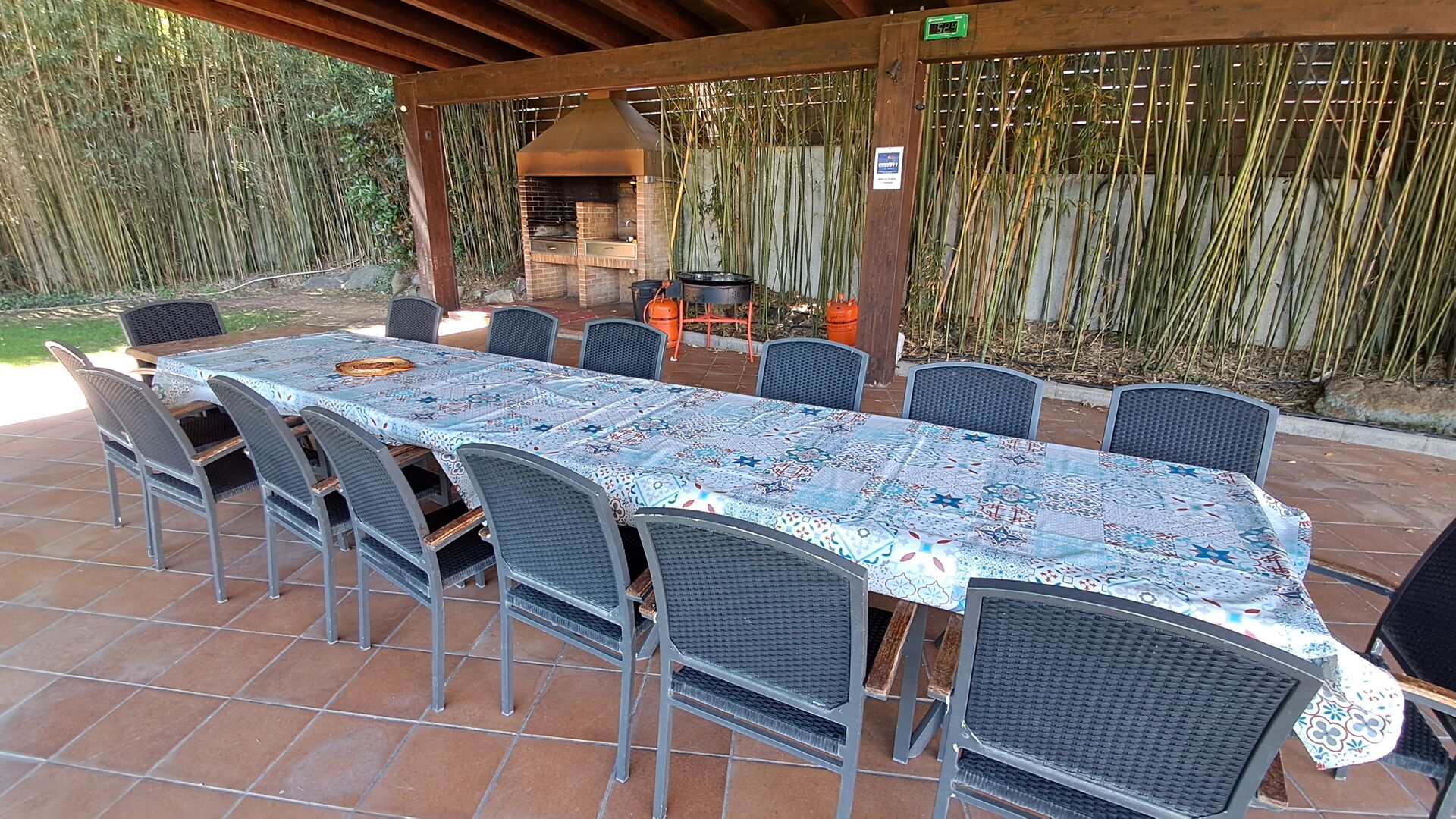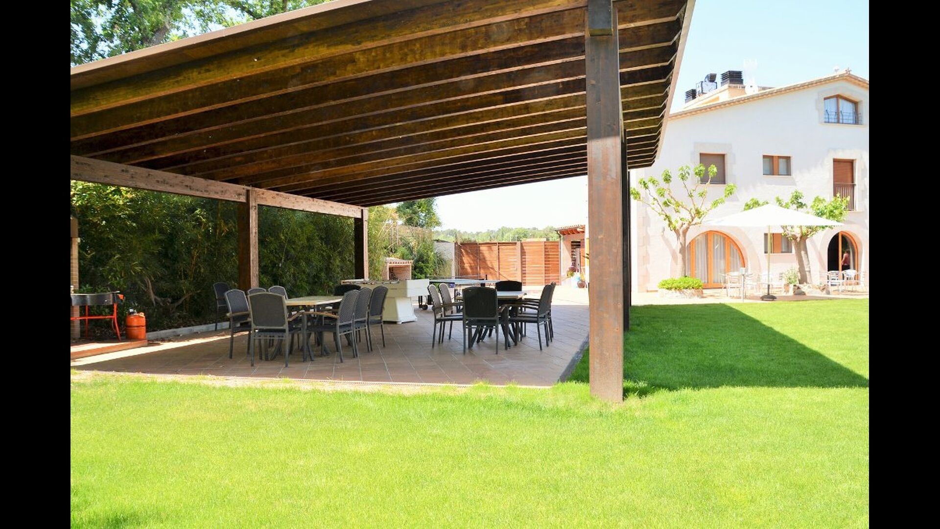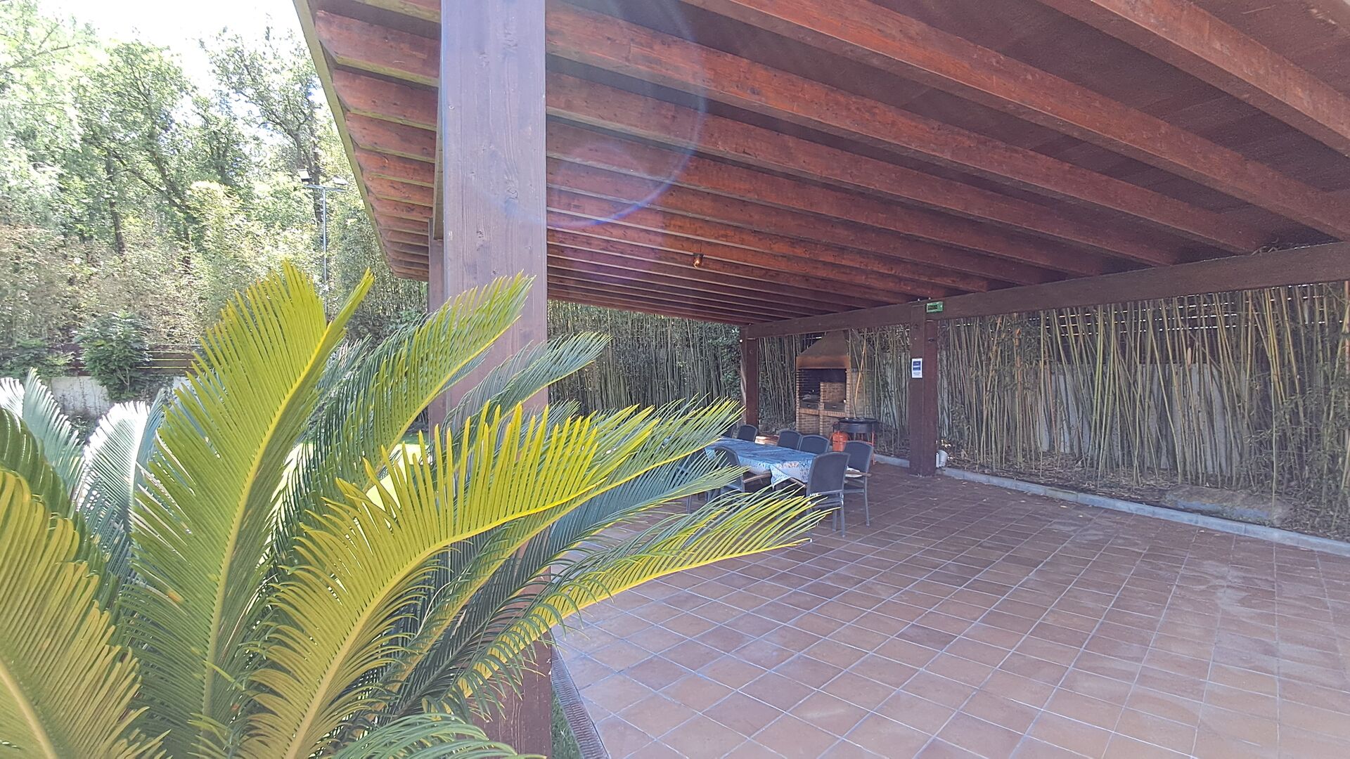 Es gibt eine große überdachte Terrasse, wo den ganzen Urlaubgruppe draußen sitzen und essen kann. Es gibt weiterhin ein großer Grill, auf dem man auch das Essen vorbereiten kann.