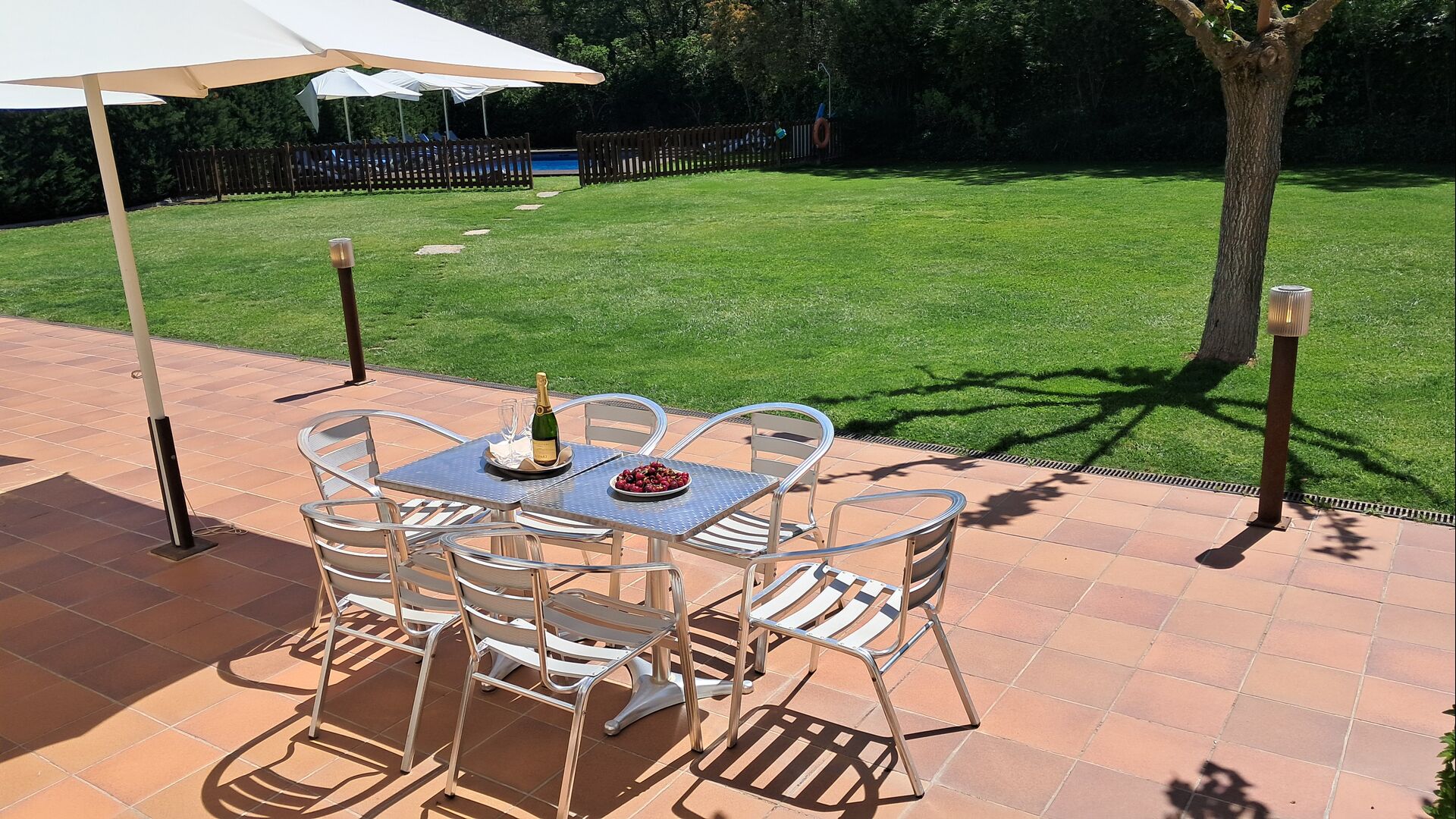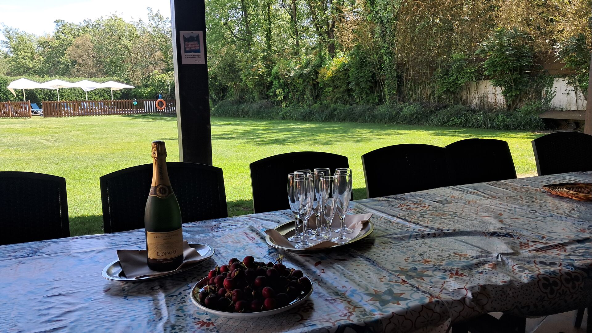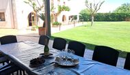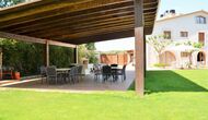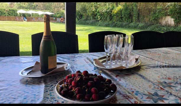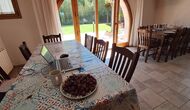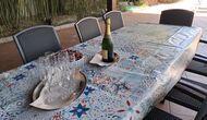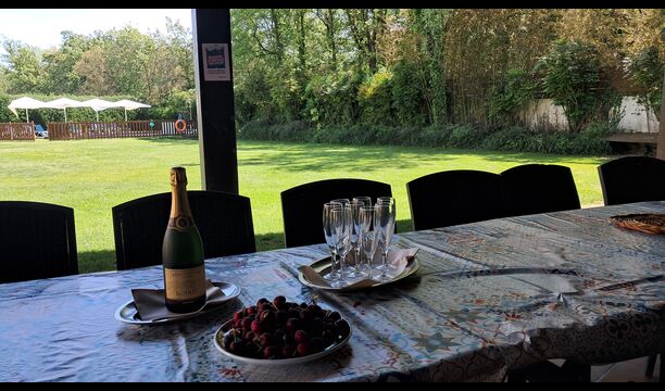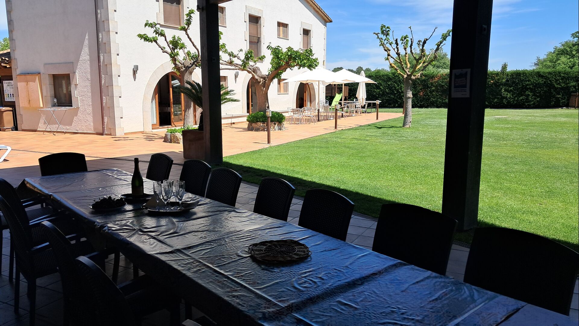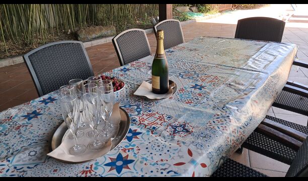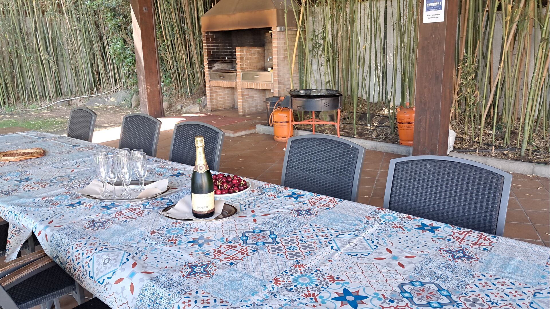 Es gibt eine große überdachte Terrasse, wo den ganzen Urlaubgruppe draußen sitzen und essen kann. Es gibt weiterhin ein großer Grill, auf dem man auch das Essen vorbereiten kann.